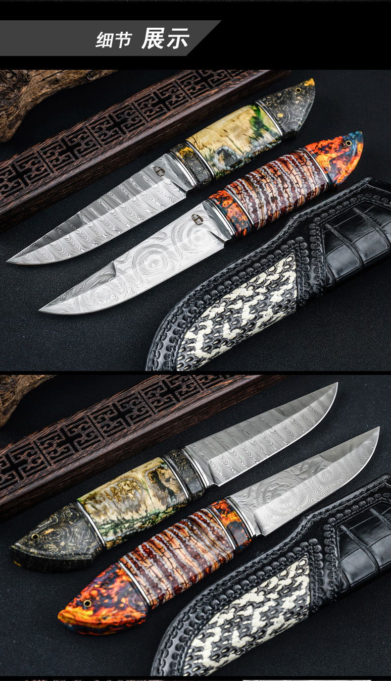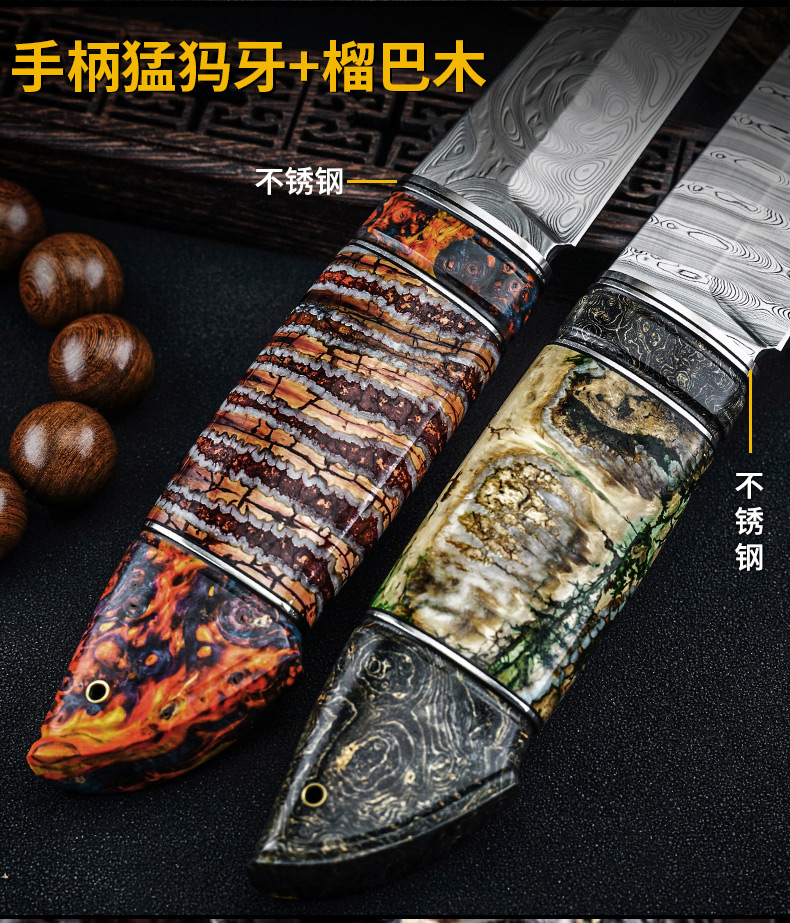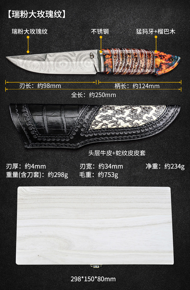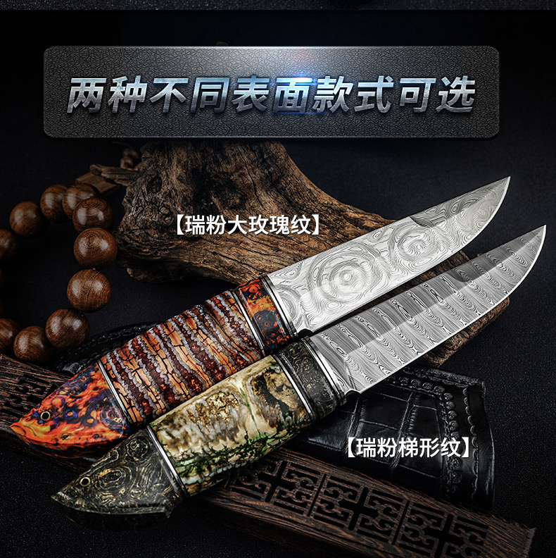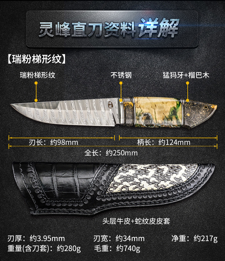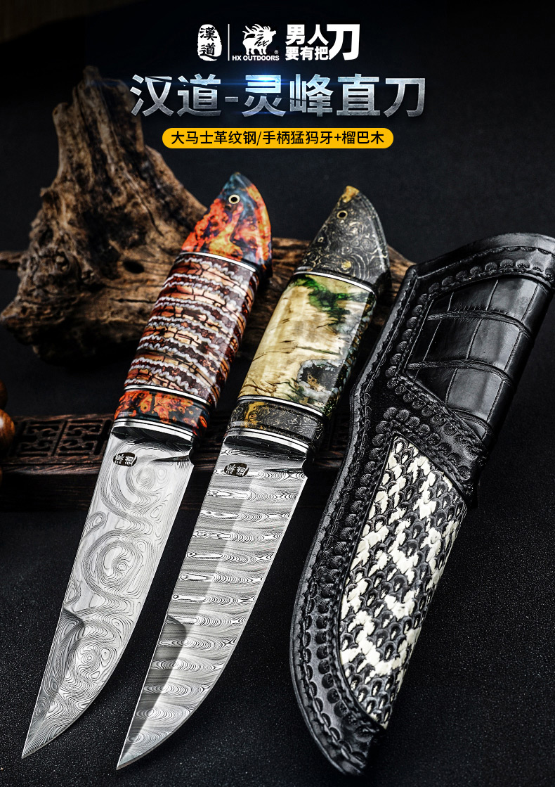汉道【灵峰直刀】瑞粉大马士革纹钢手工直刀猛犸化石手柄收藏刀