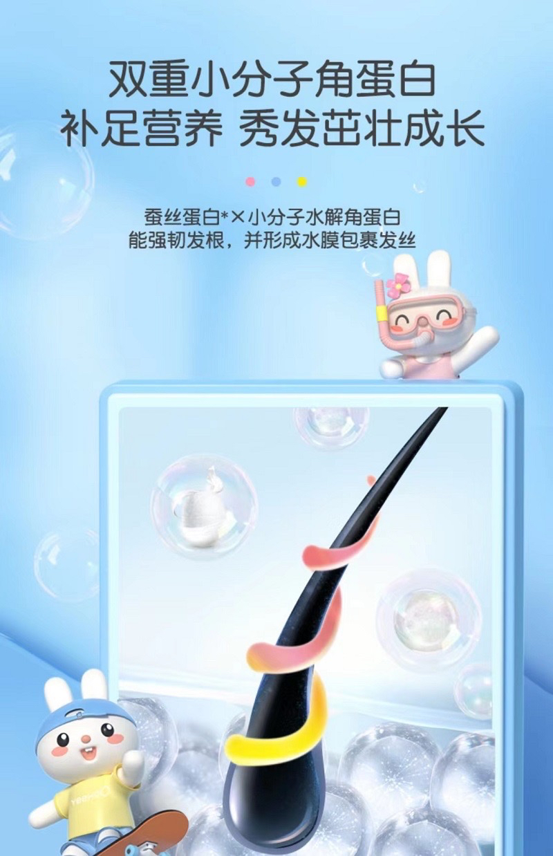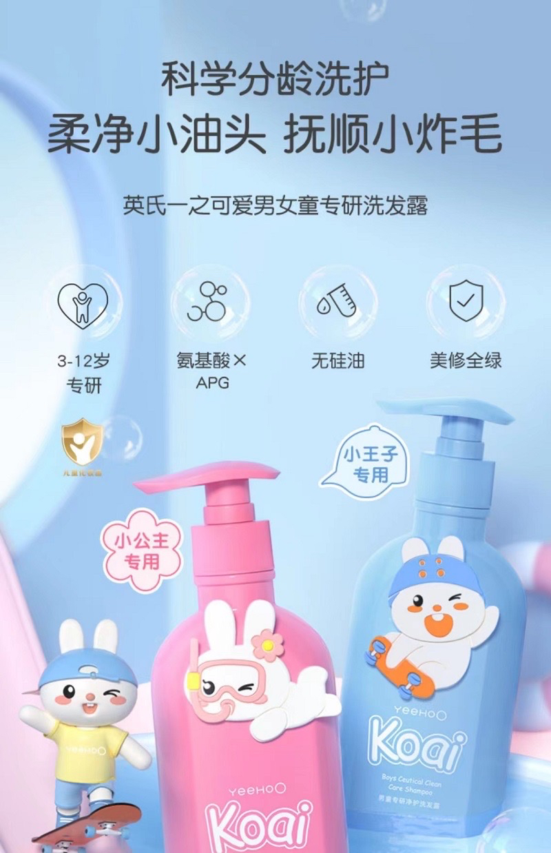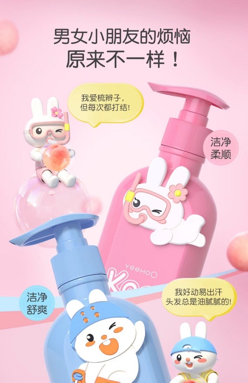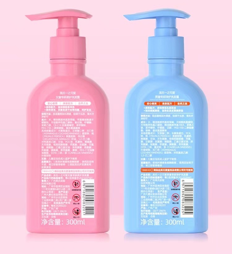 亲和配方,柔和清洁头部发丝,泡沫细腻绵密,洁净后发丝清爽舒适,根据男女童发质特点不同配,男女分开使用,男童配方洗后清爽不油腻,女童洗后顺滑不打结