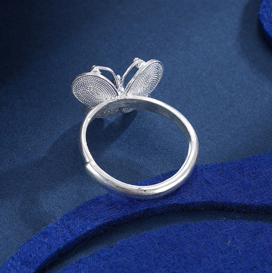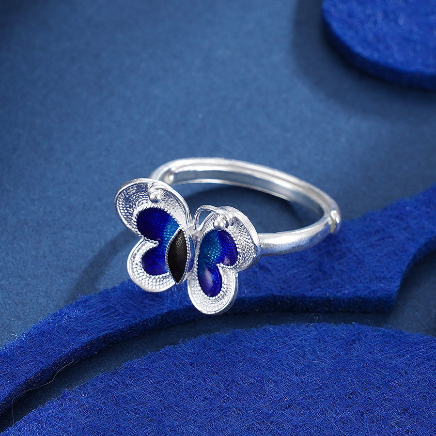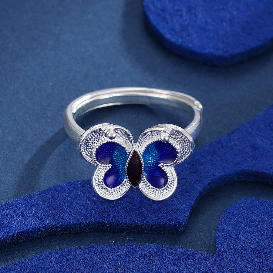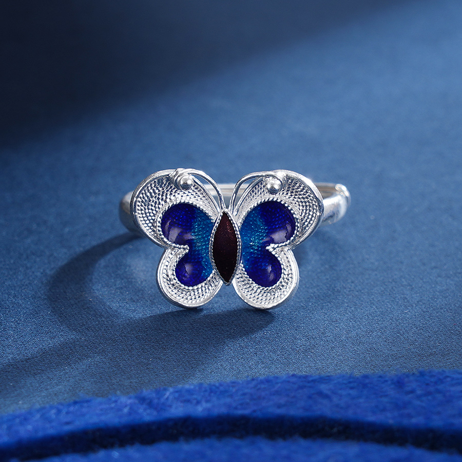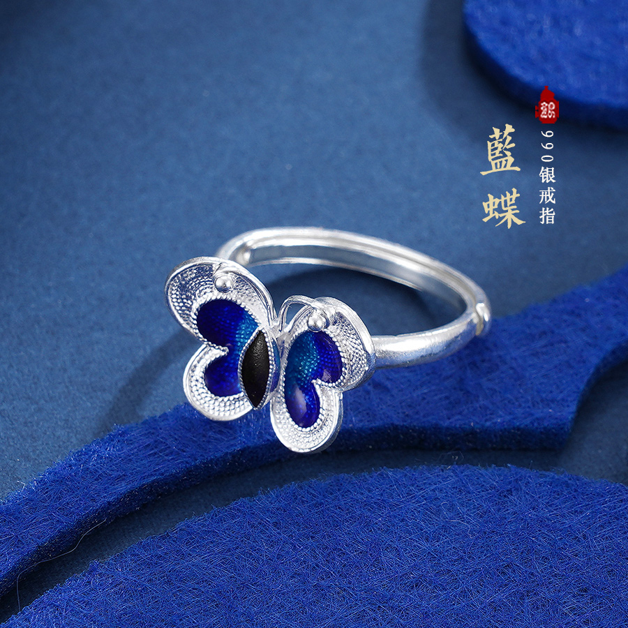 【寓意】:戒指以蝴蝶为灵感设计,采用银花丝工艺打造,结合景泰蓝填色技艺,整体呈现古典淡雅、高贵内敛的美学特质,寓意“蝶韵新生,福泽绵长”。