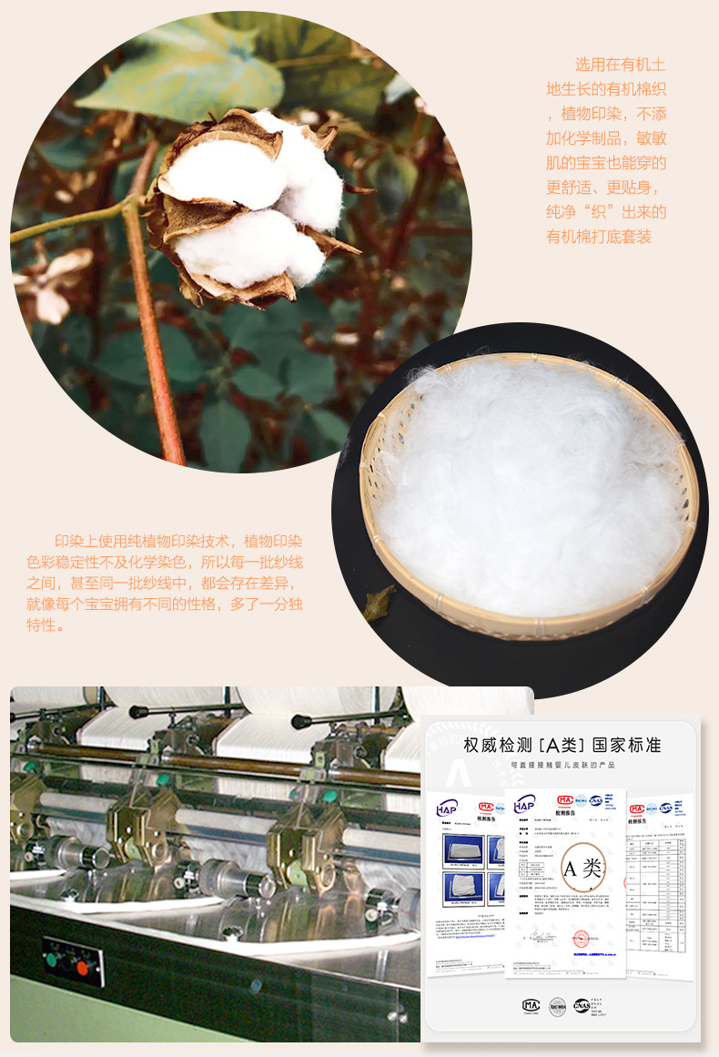 有机棉材质:94.8%棉+5.2%氨纶!天然有机棉环保面料,新疆长绒棉针织而成,克重分200g和300g两个规格。克重越大,厚度越厚