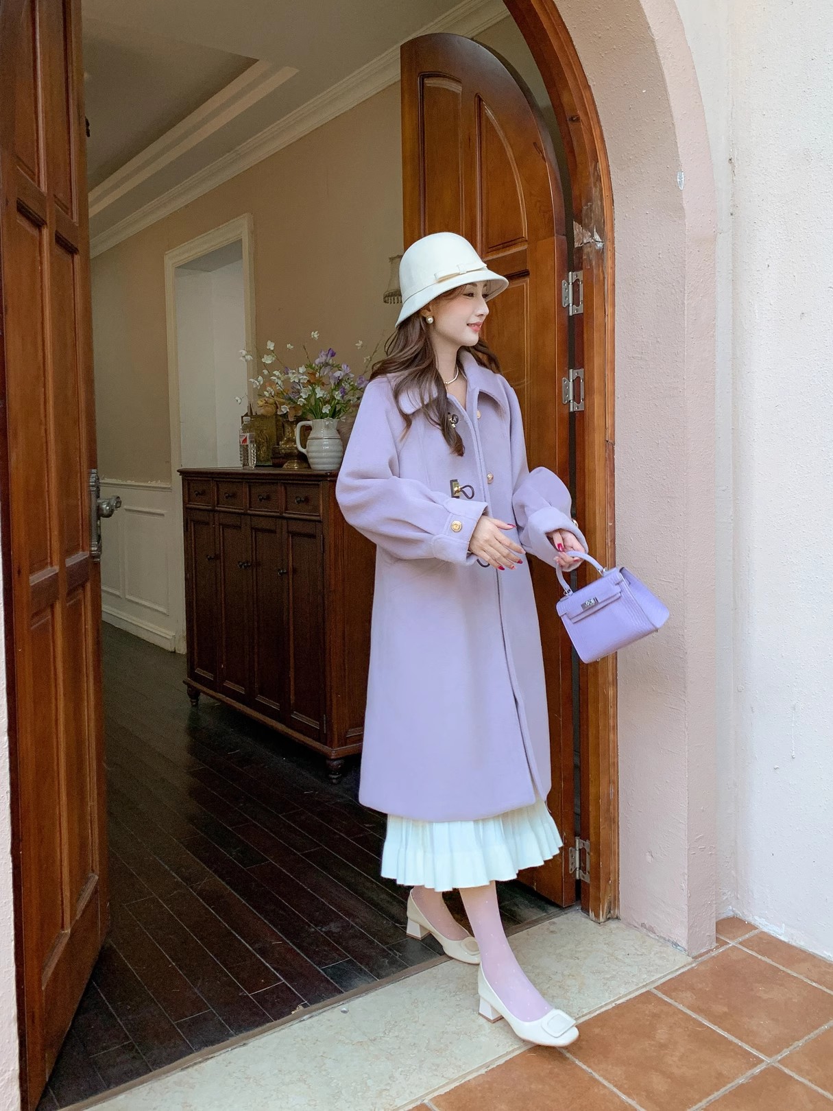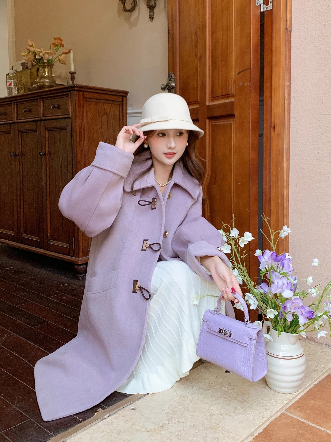 张心子【人间绝绝紫】复古小众牛角扣毛呢外套女2024冬季呢子大衣 U2410034