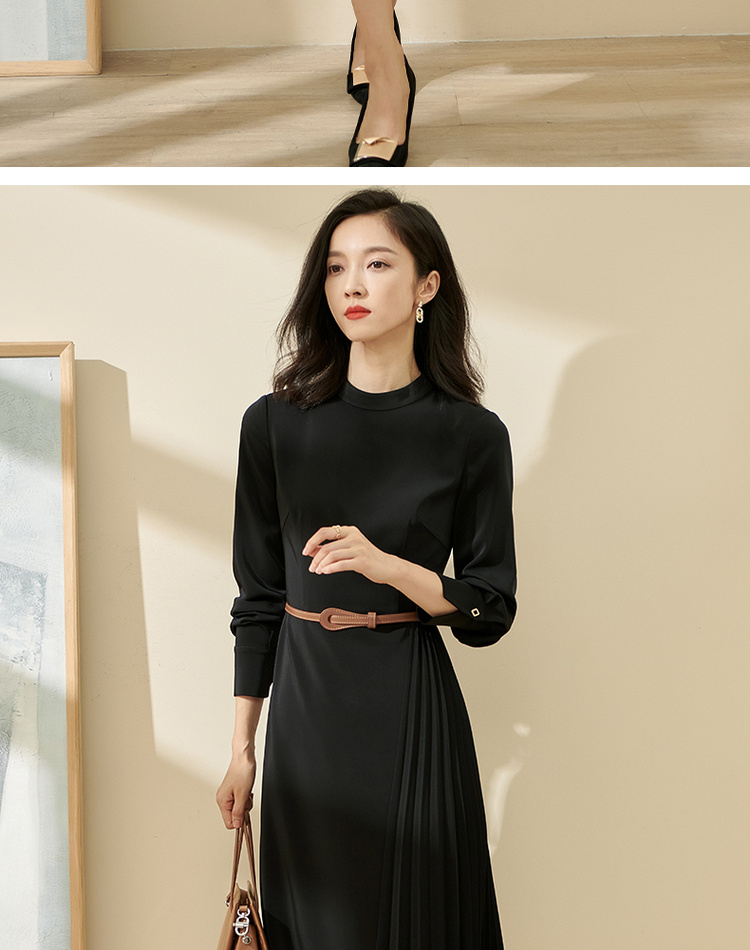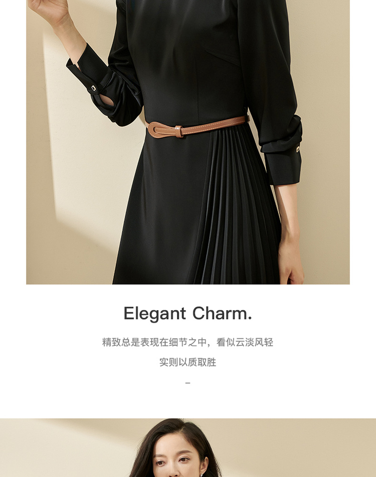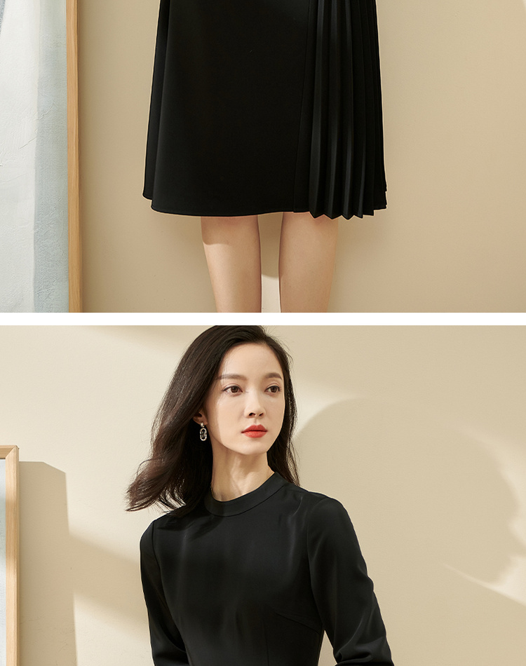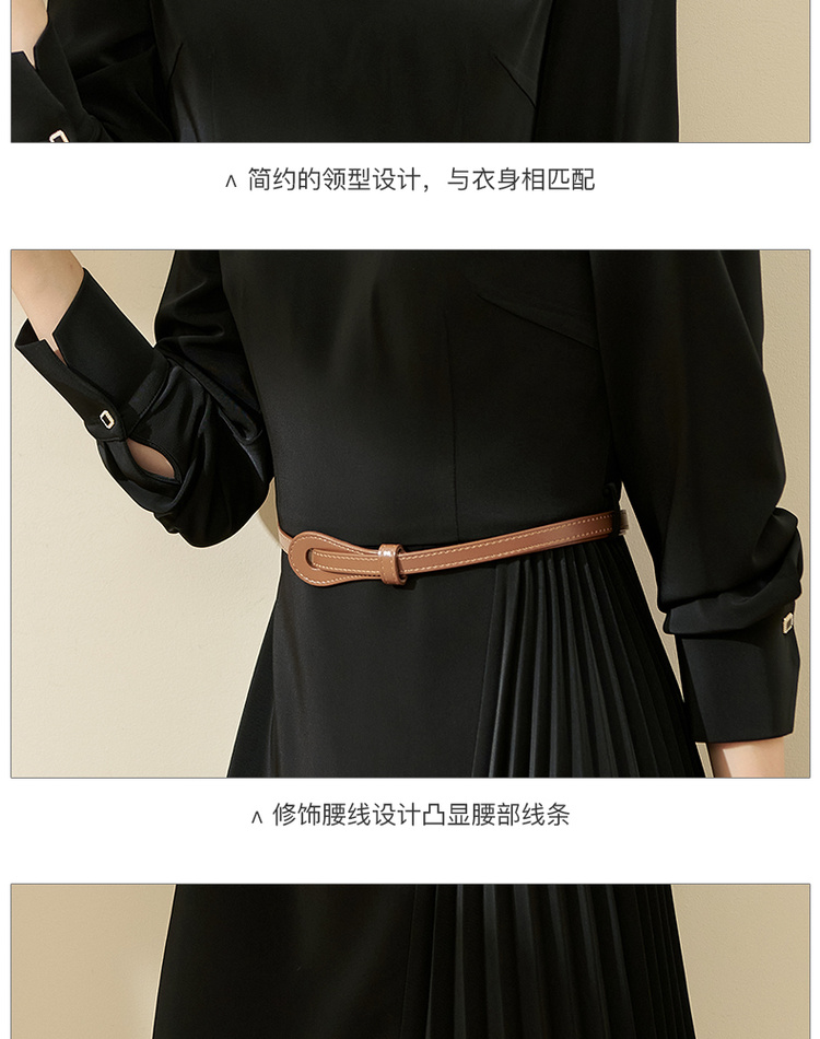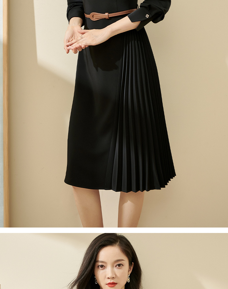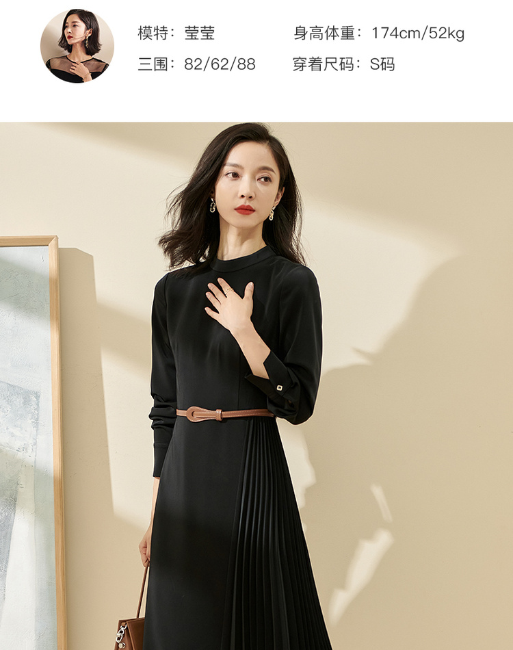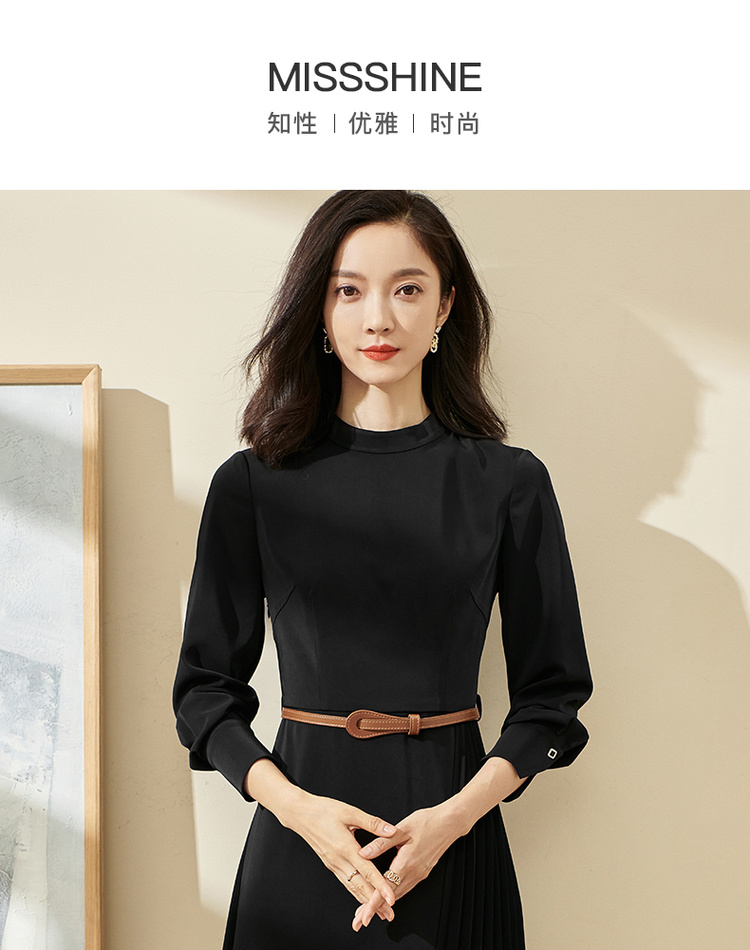 米思阳知性轻熟连衣裙小众不规则百褶2025新款中长款黑色裙子2309