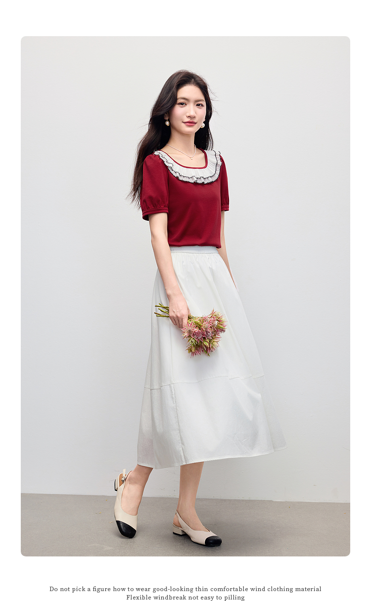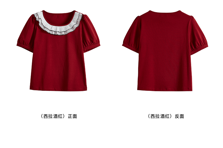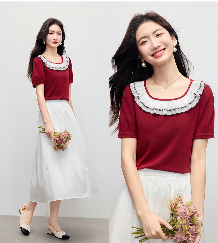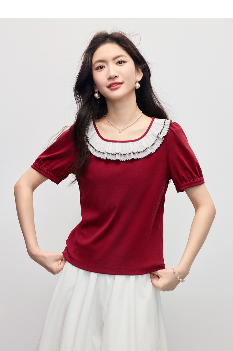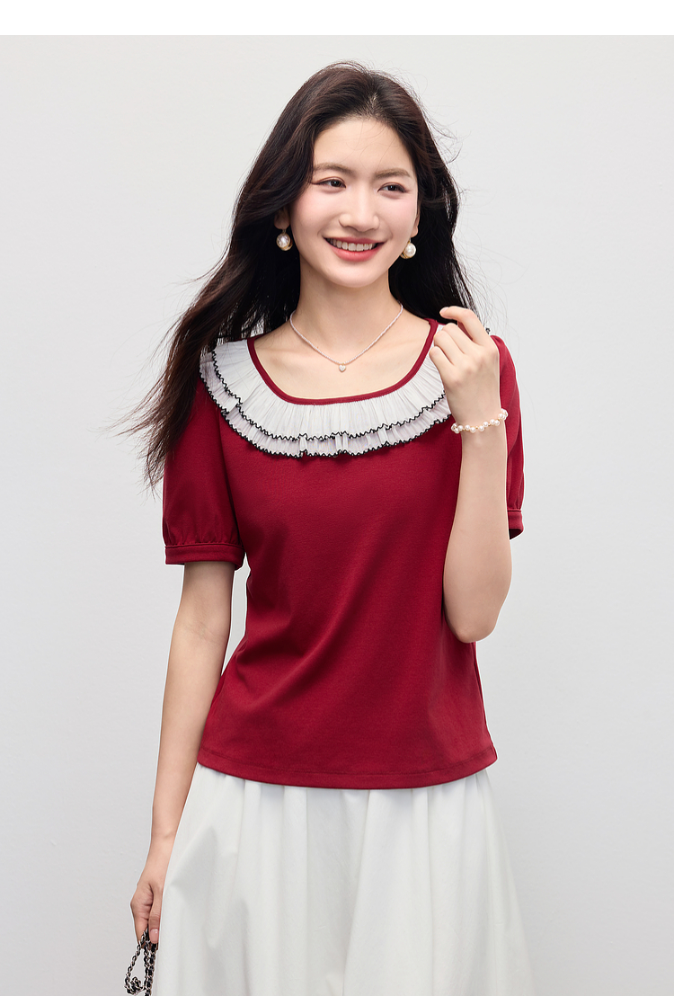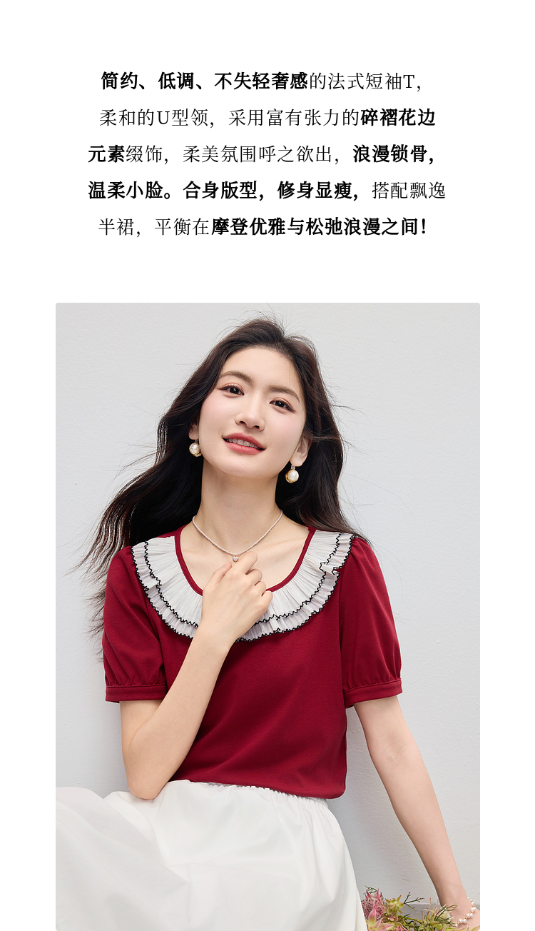 【专属特价】熙世界法式荷叶边领短袖T恤女2025夏新款气质超好看独特漂亮上衣