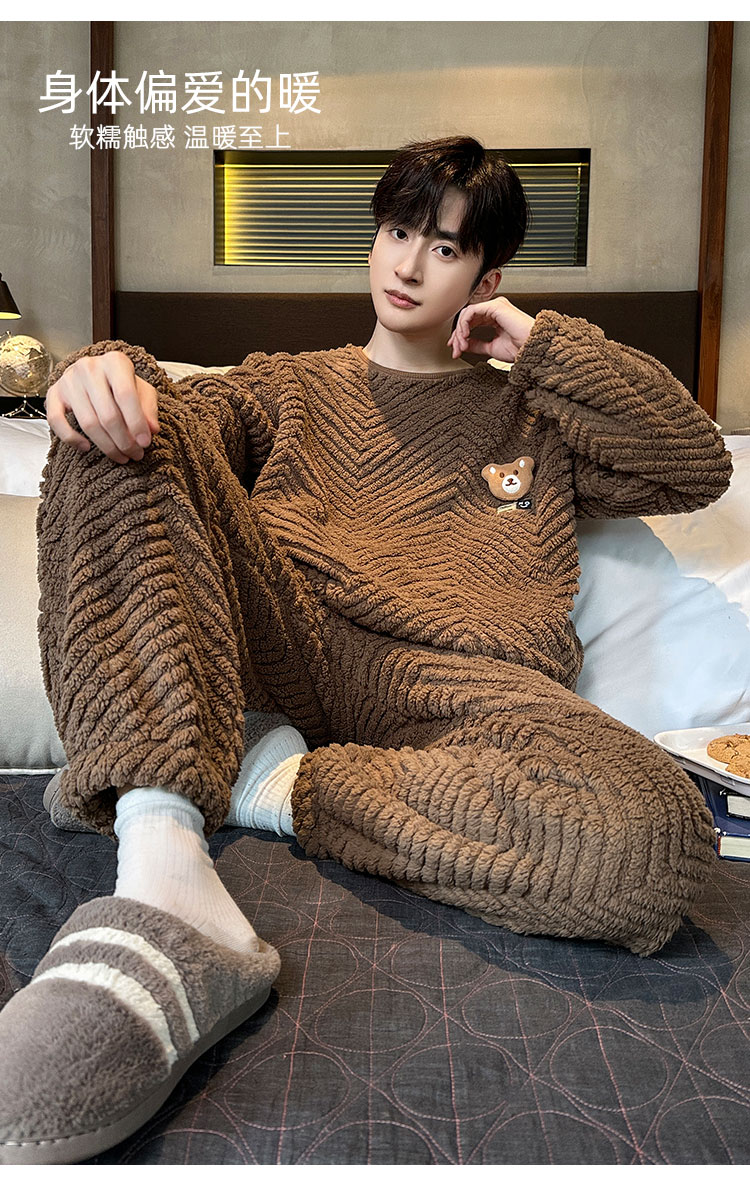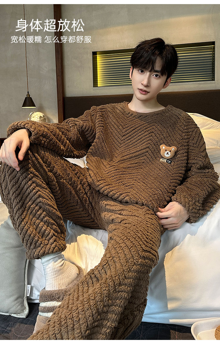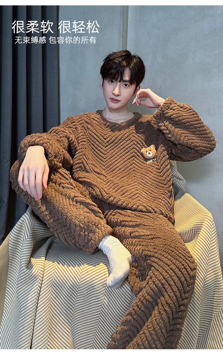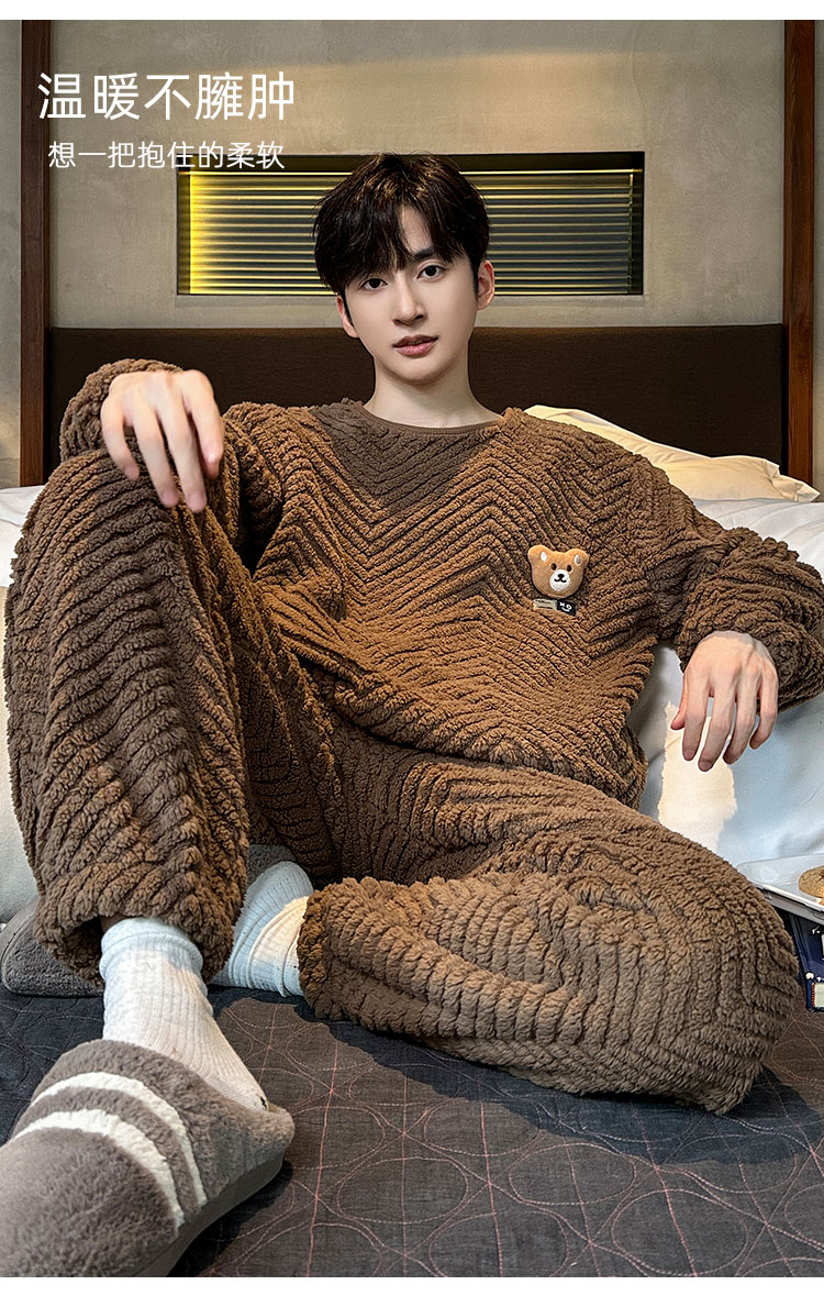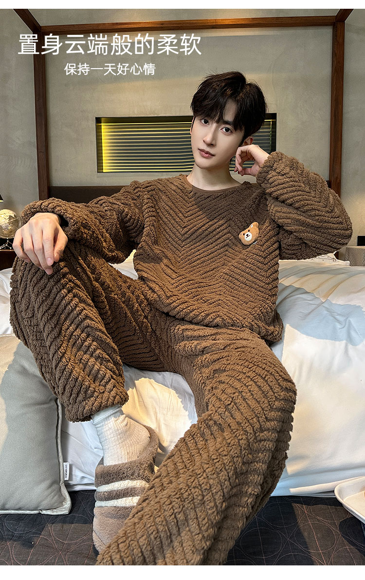 洁丽雅冬季大码男士珊瑚绒睡衣加绒加厚舒适亲肤保暖睡衣男秋冬款
