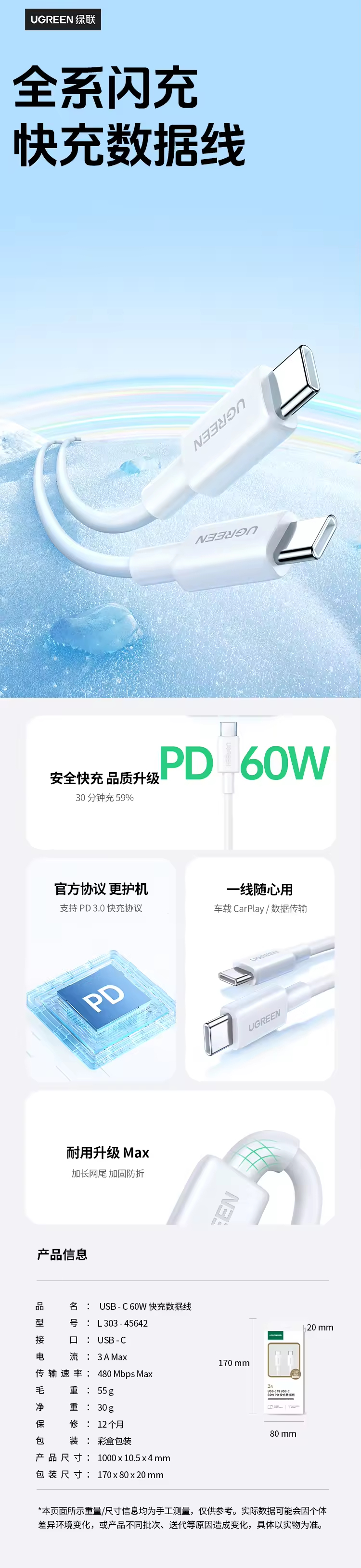 UGREEN绿联 USB-C 60W 快充数据线 1M