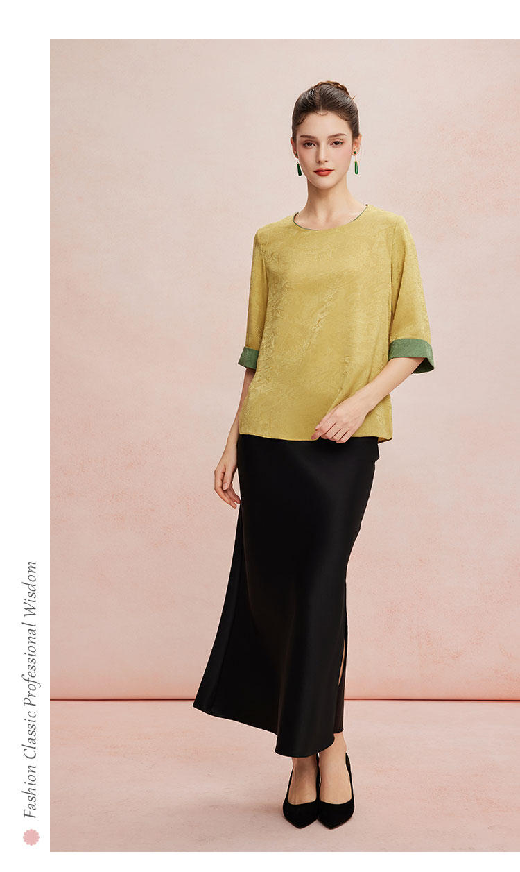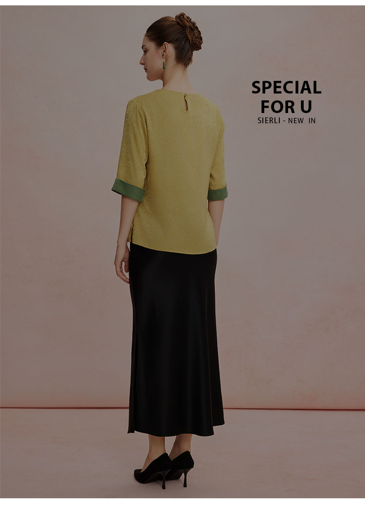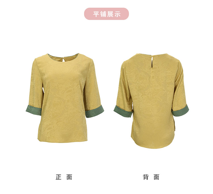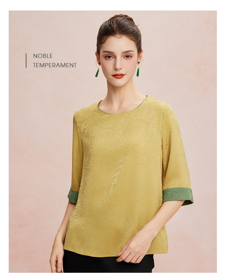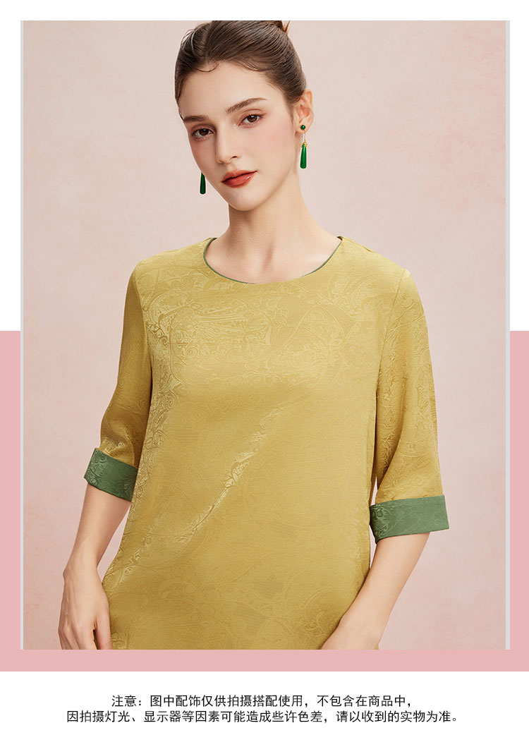QF260斯尔丽25新款圆领国风系列精致提花工艺中袖撞色宽松显瘦上衣