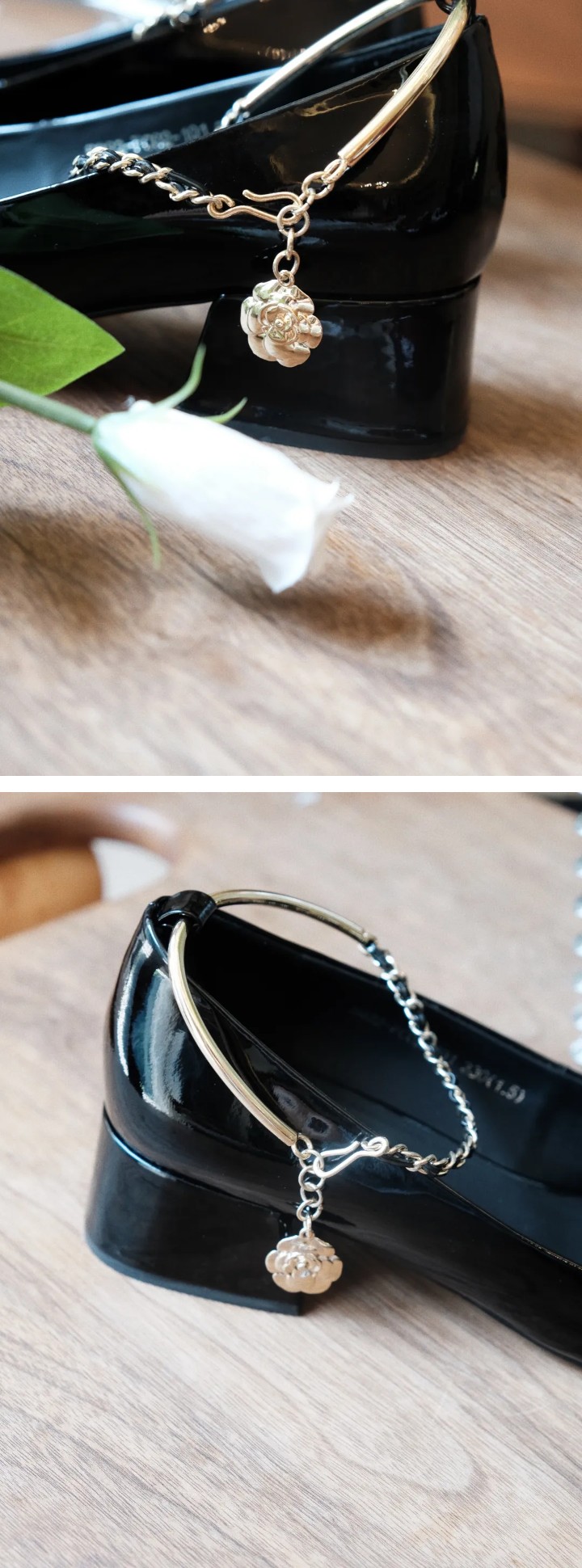 配以优雅美丽的山茶花+水钻扣饰,金属编织链条环绕脚背,提升整体的精致度,这种设计,就很像手链脚链的设计,非常精美!!