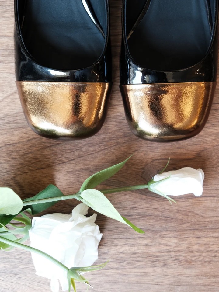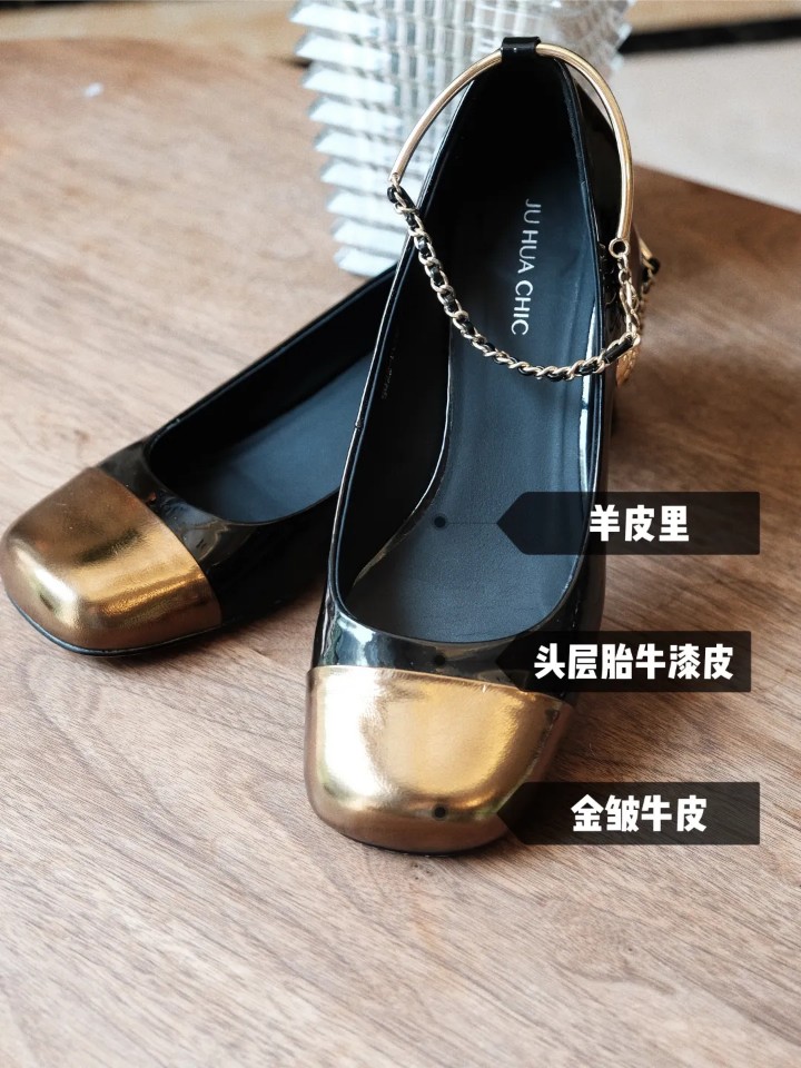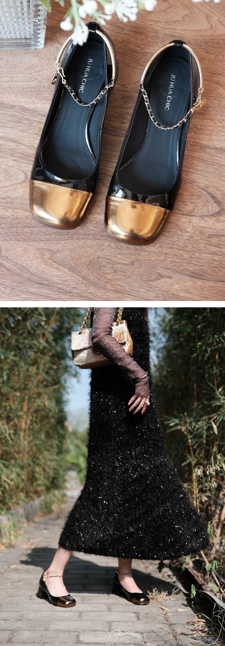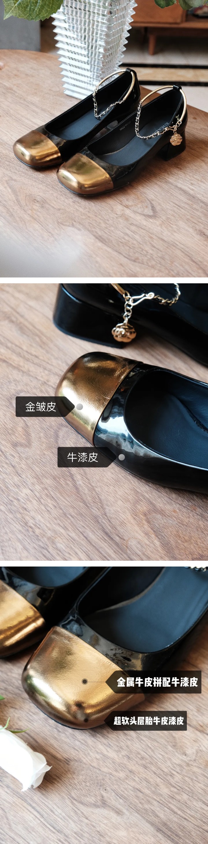 还有一双黑金拼配的漆皮玛丽珍鞋,鞋面以超软头层胎牛漆皮和金属牛皮搭配,是属于低调奢华篙级感的款式,看起来就很贵气的感觉,实物颜色真的巨好看!