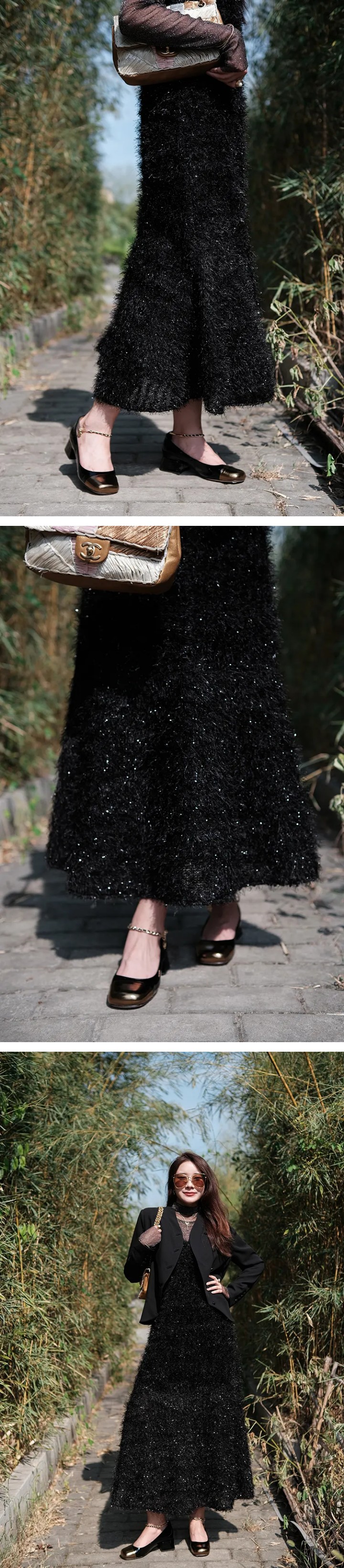 脚踩一双摩登时髦的黑金玛丽珍鞋