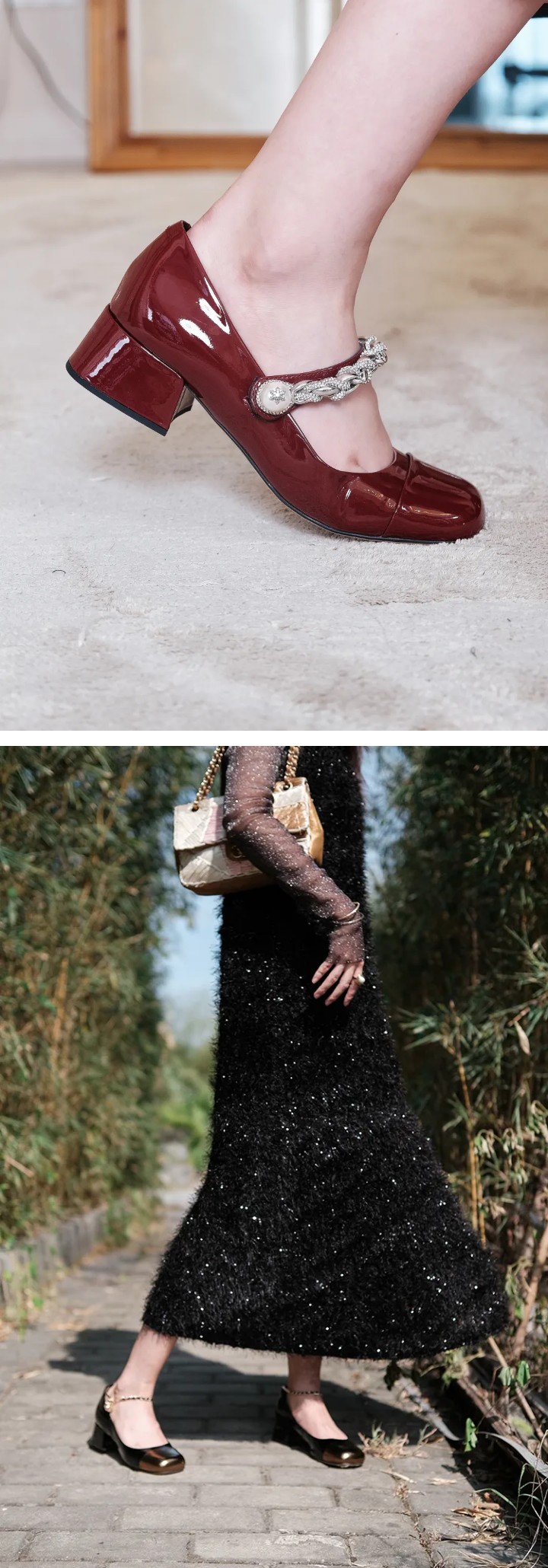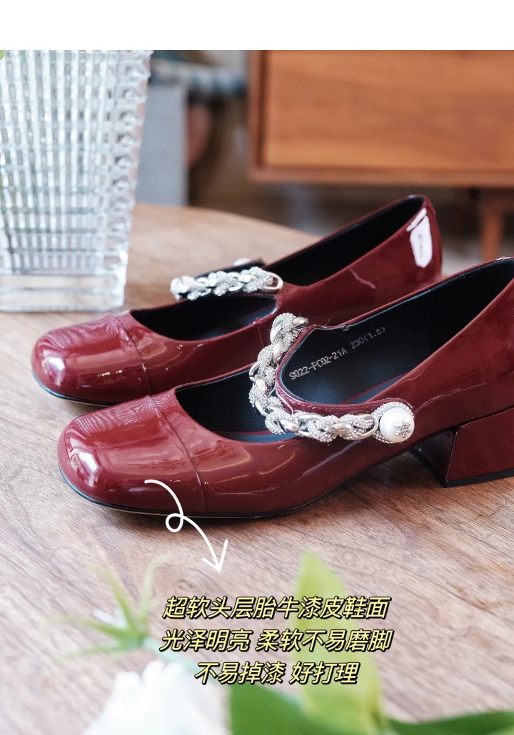skp奢品牌代工厂定制——不磨脚的超软漆皮玛丽珍方跟鞋!超显瘦包脚!超软头层胎牛漆 柔软羊皮里 鞋跟包面皮!北京SKP商场线下款跟单 某明星同款车厘子色/黑金配色 4CM粗跟行走不累脚 精致复古方头