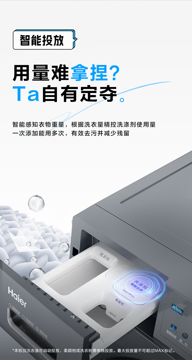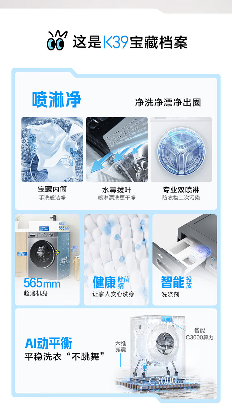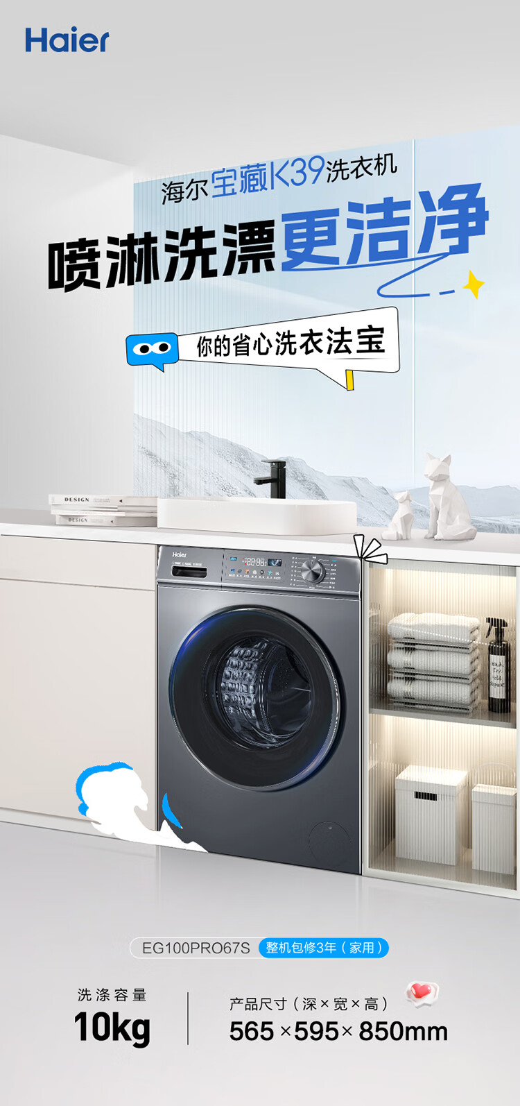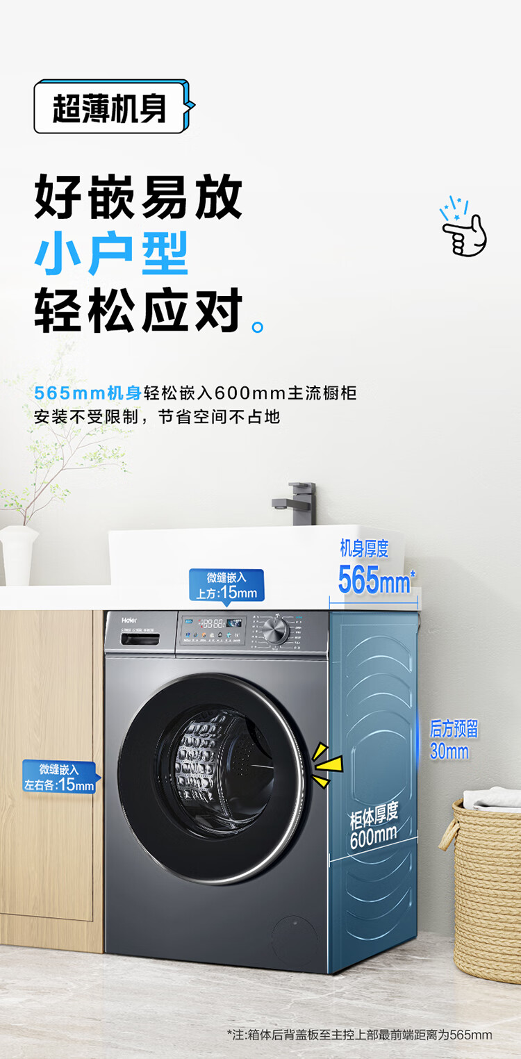 海尔(Haier) 10公斤 滚筒洗衣机 562mm超薄 1.1洗净比 喷淋漂洗 边喷边洗 智能投放 中途添衣 高温桶自洁 EG100PRO67S