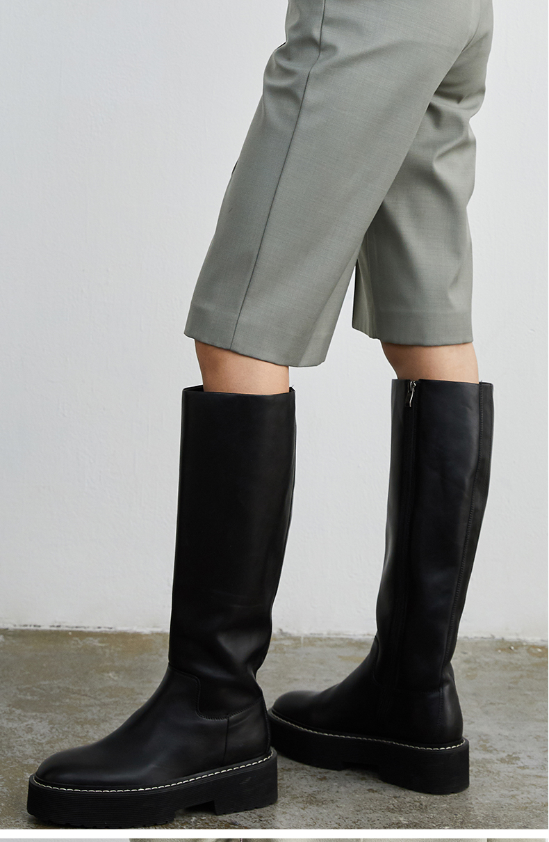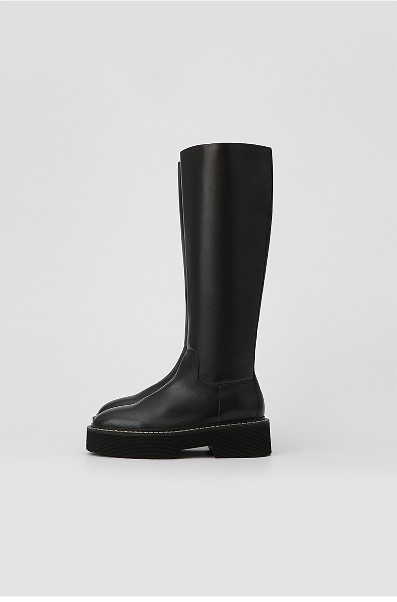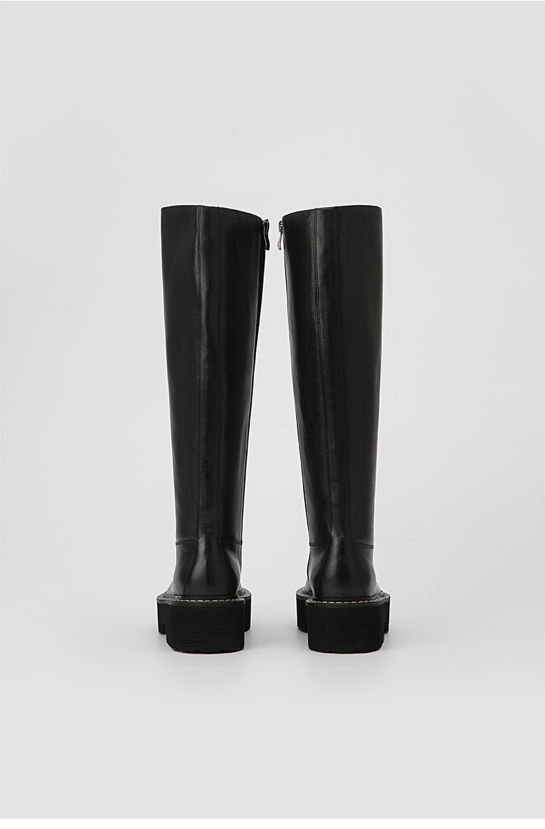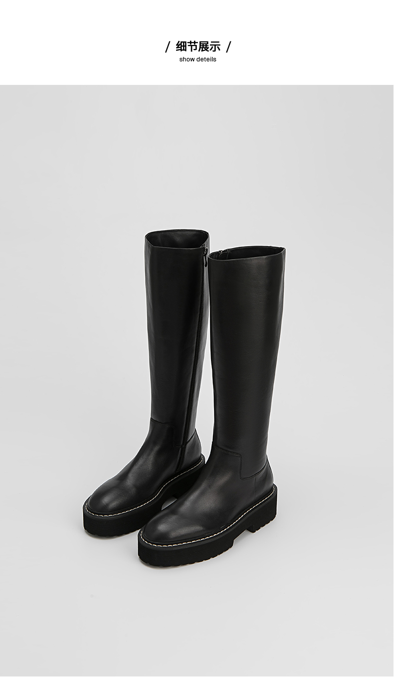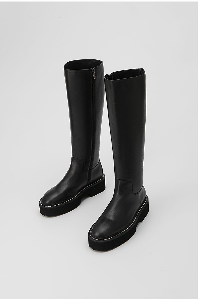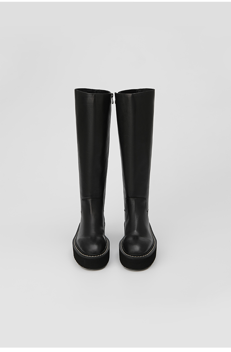 HIDEMI 黑色简约加厚增高底女鞋牛皮长靴