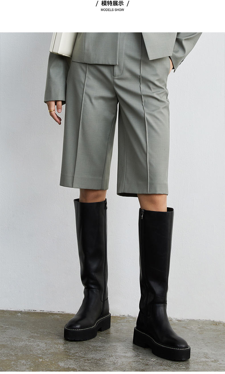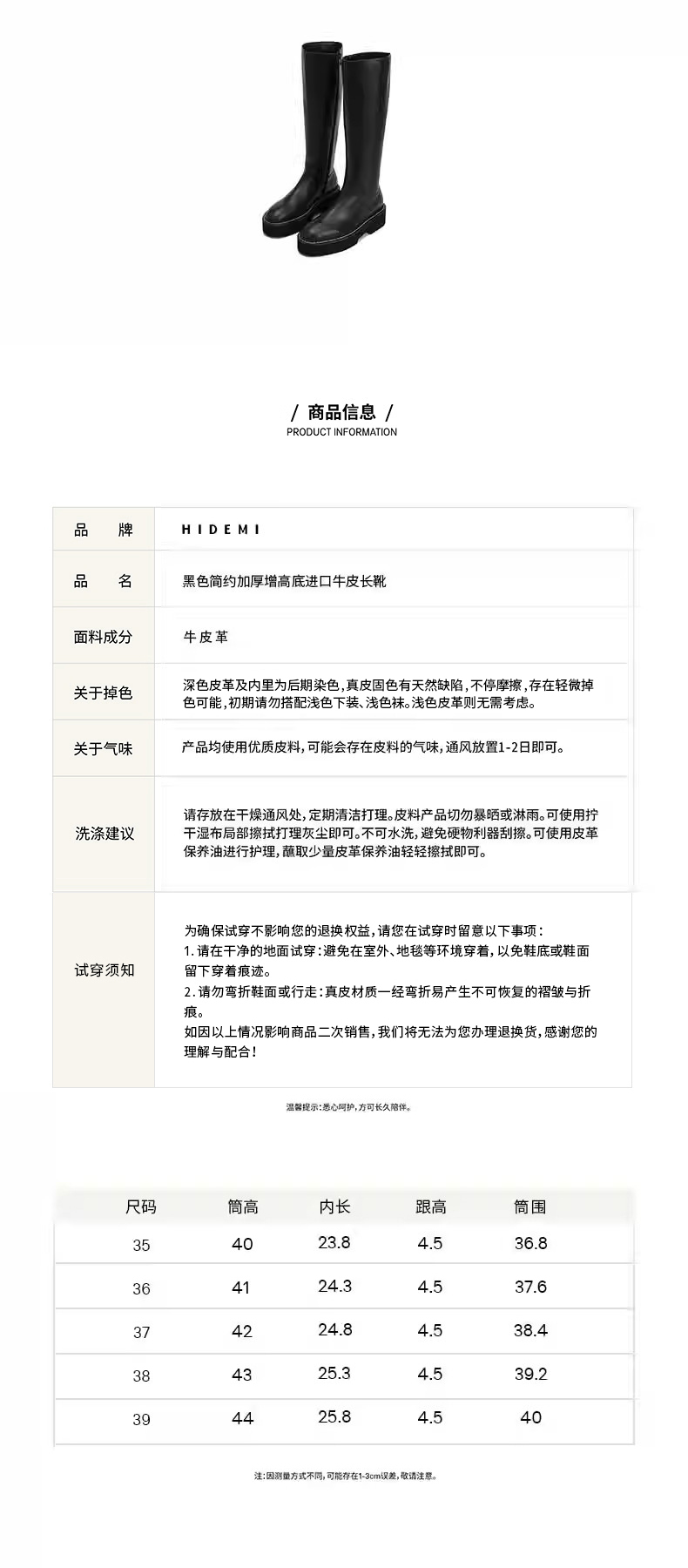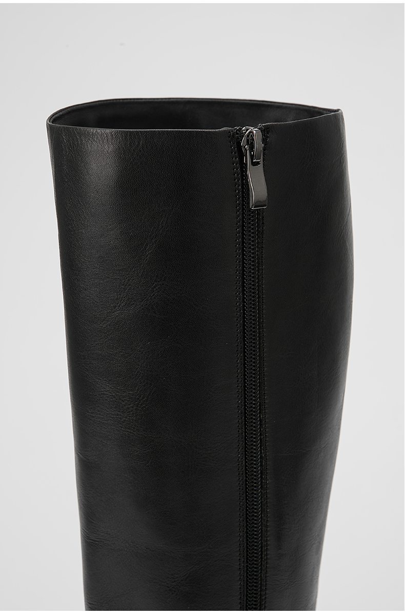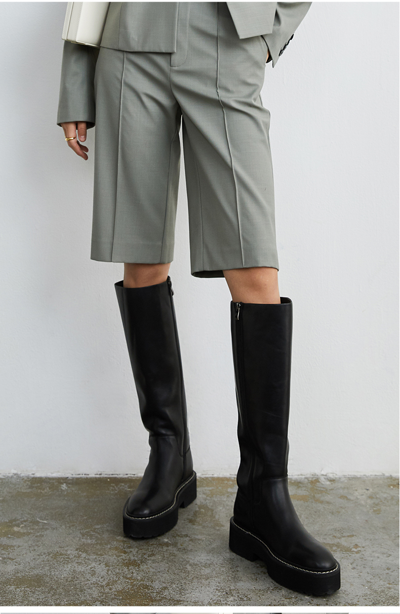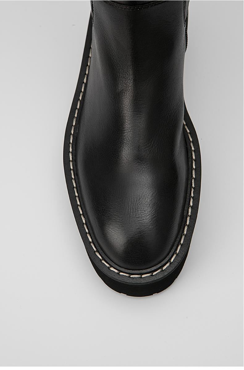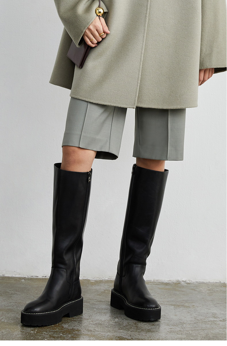 HIDEMI 黑色简约加厚增高底女鞋牛皮长靴