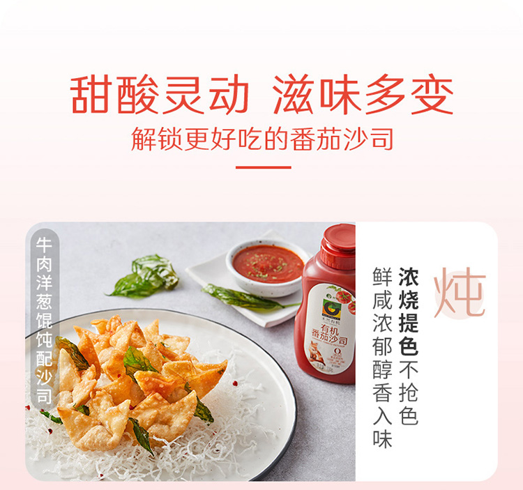 【产品名称】:有机番茄沙司 【配料】:有机番茄、有机浓缩苹果汁、有机糙米醋、有机白砂糖 【规格】:330g/瓶 【生产标准】:有机原料,零添加生产 【食用方法】:可当蘸料,也可用来煮汤、炒菜等 【保质期】:12个月 |