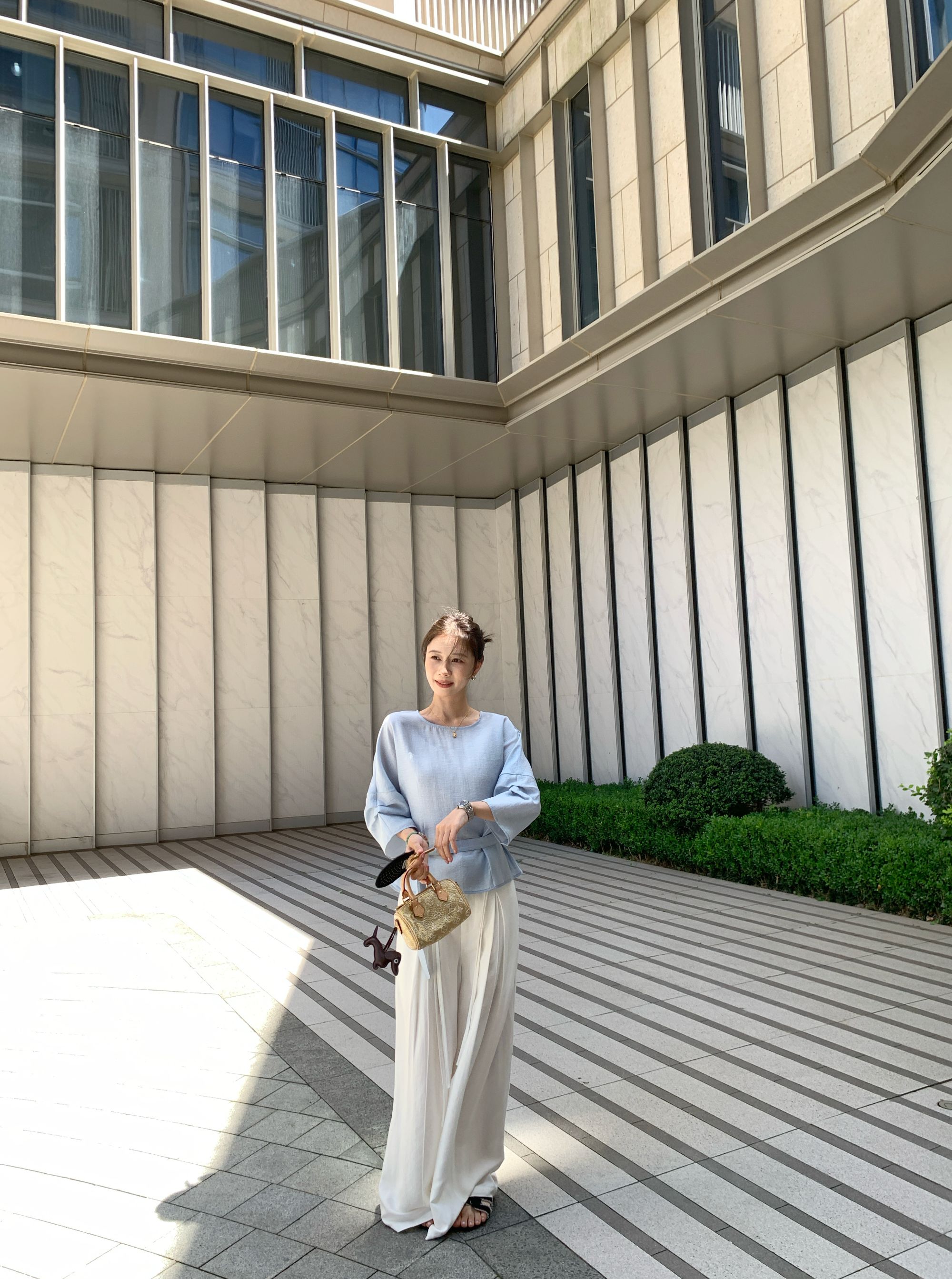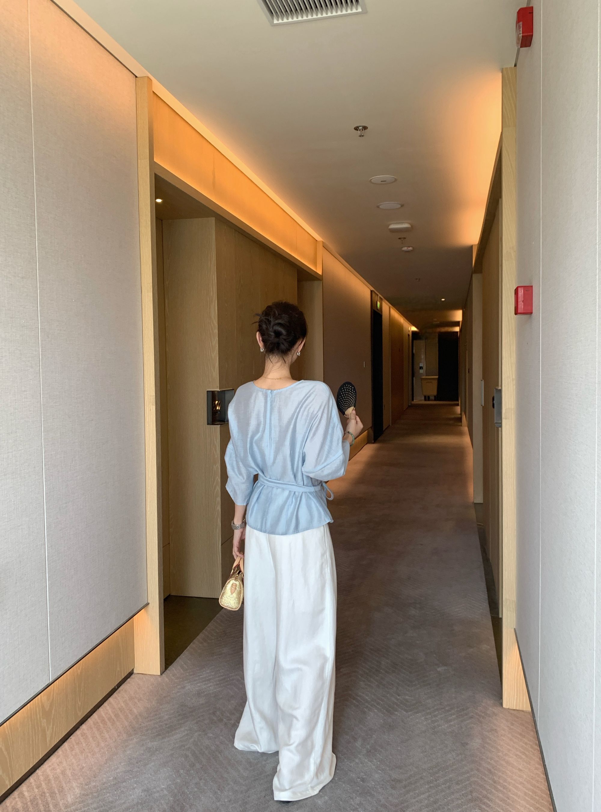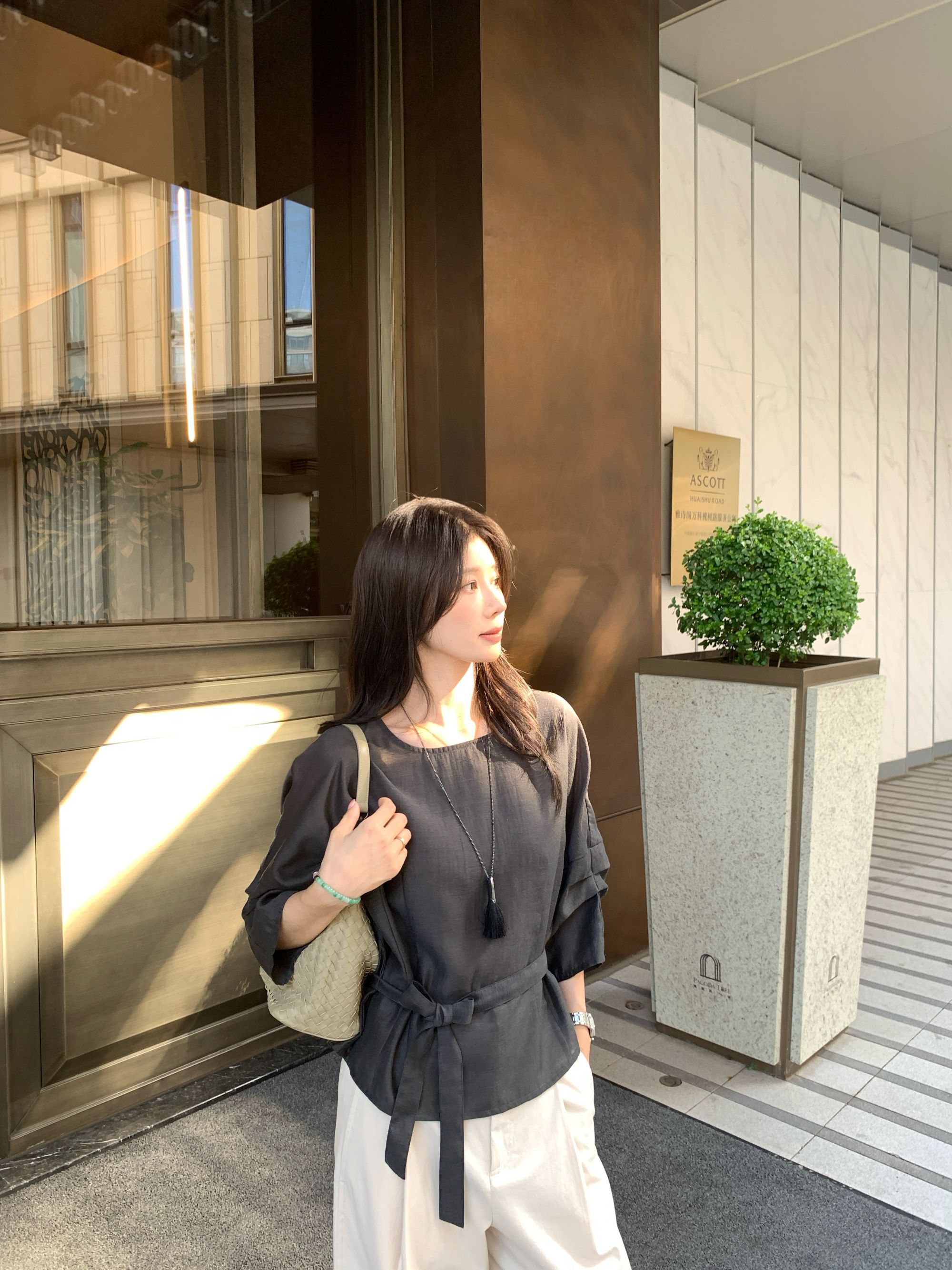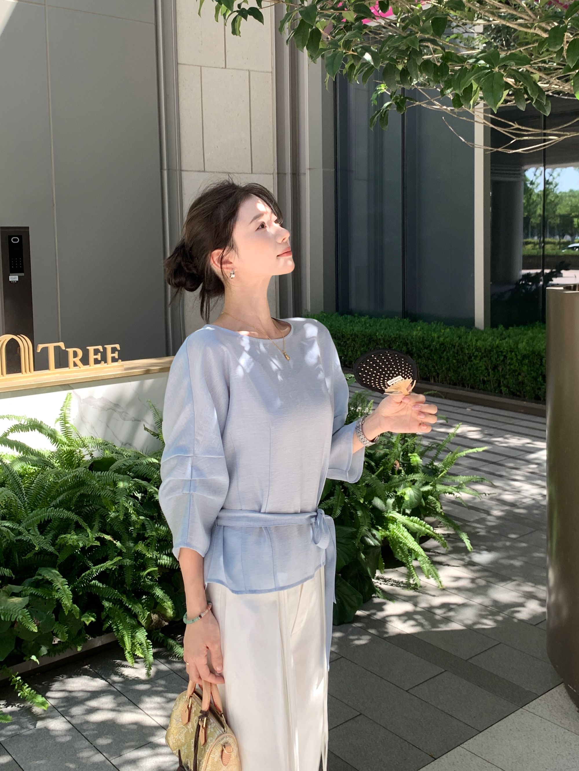 【冰蓝珠光】醋酸亚麻设计款显瘦收腰七分袖宽松百搭休闲上衣