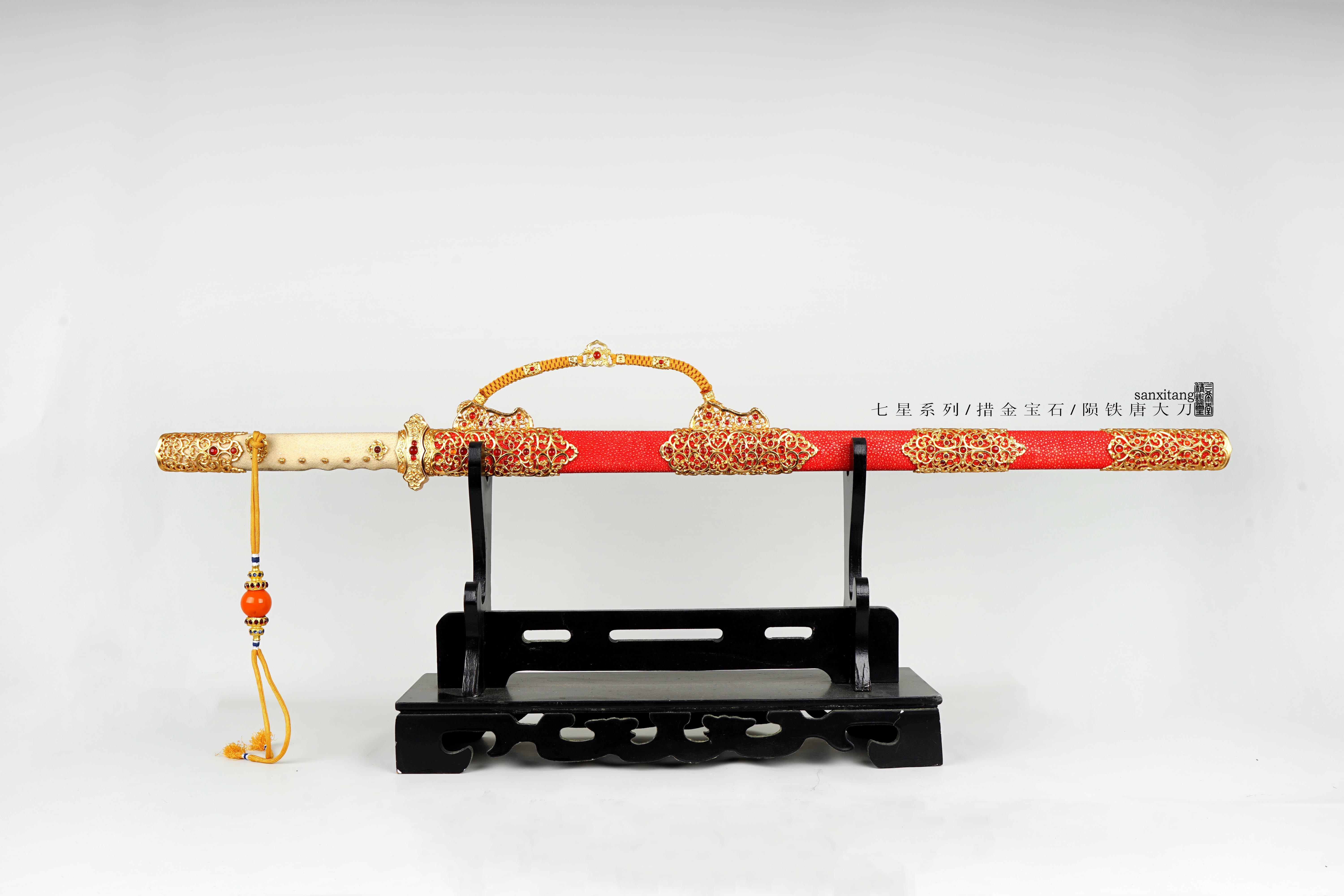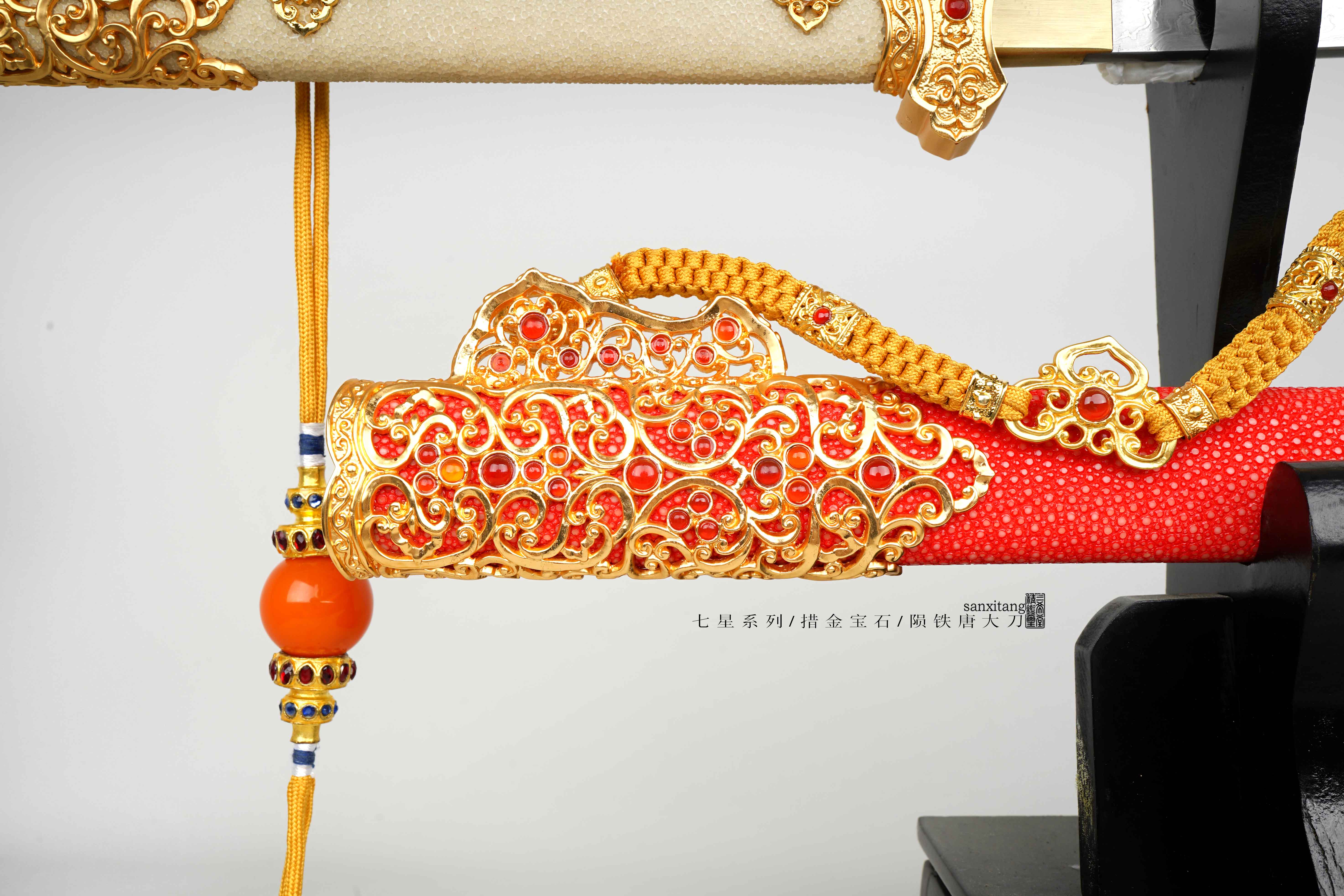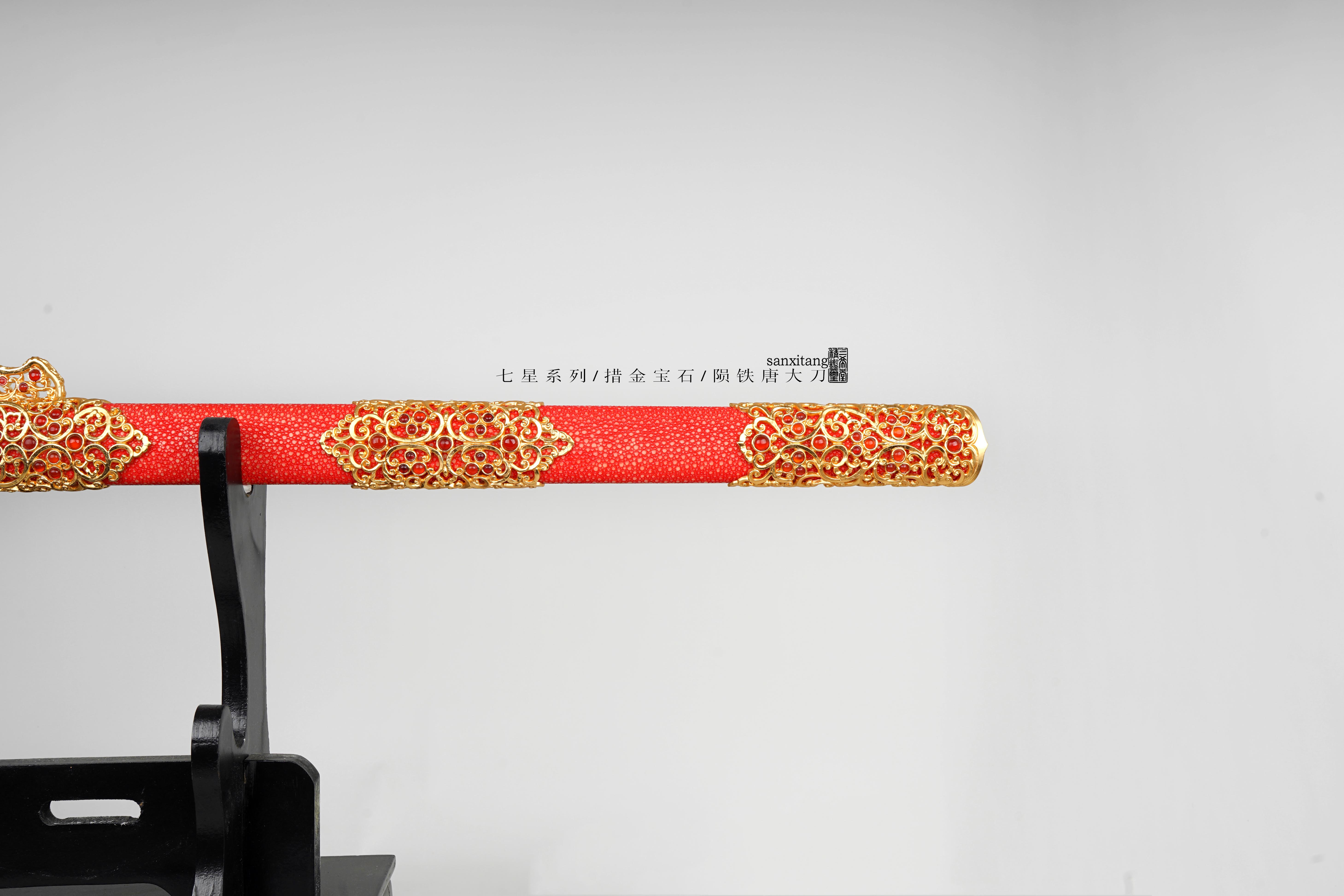 这只是陨铁版本的 比普通版本贵一些 普通版本的外观是一样的 就是刀条不同 价格是12800 也可以入手 全长105 全错金镂空金具 镀的很厚的24k金 上面有宝石镶嵌 全东南亚进口优质珍珠鱼皮包裹柄和鞘 手柄做了手指形状 握感舒适 我们自己锻打的16000余层陨铁刀条材料难得也昂贵 纹路大家可以看下 和普通的完全不一样 有种水墨画的感觉 还不错的一只高端作品 各位收藏或者送送领导朋友都是非常合适的