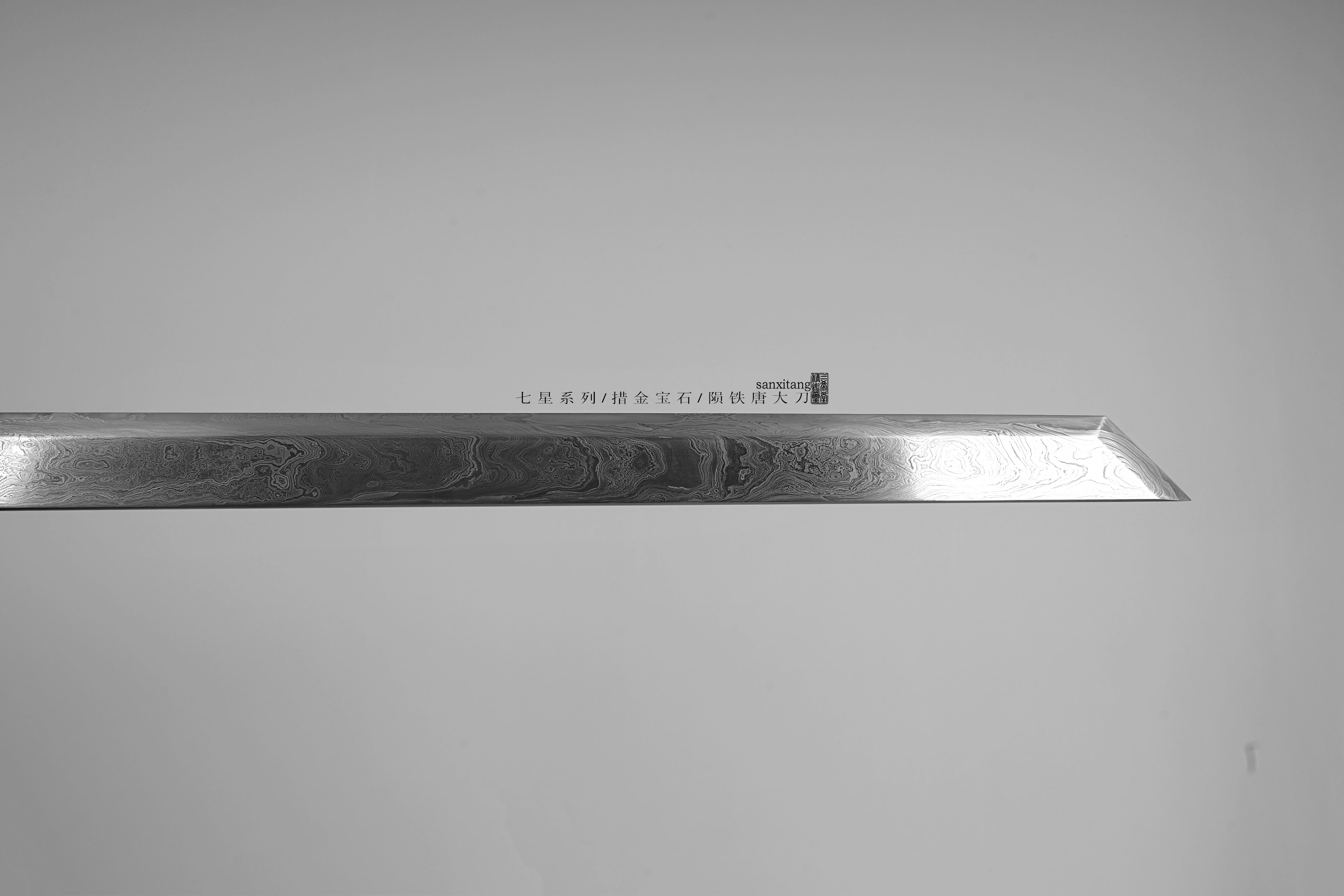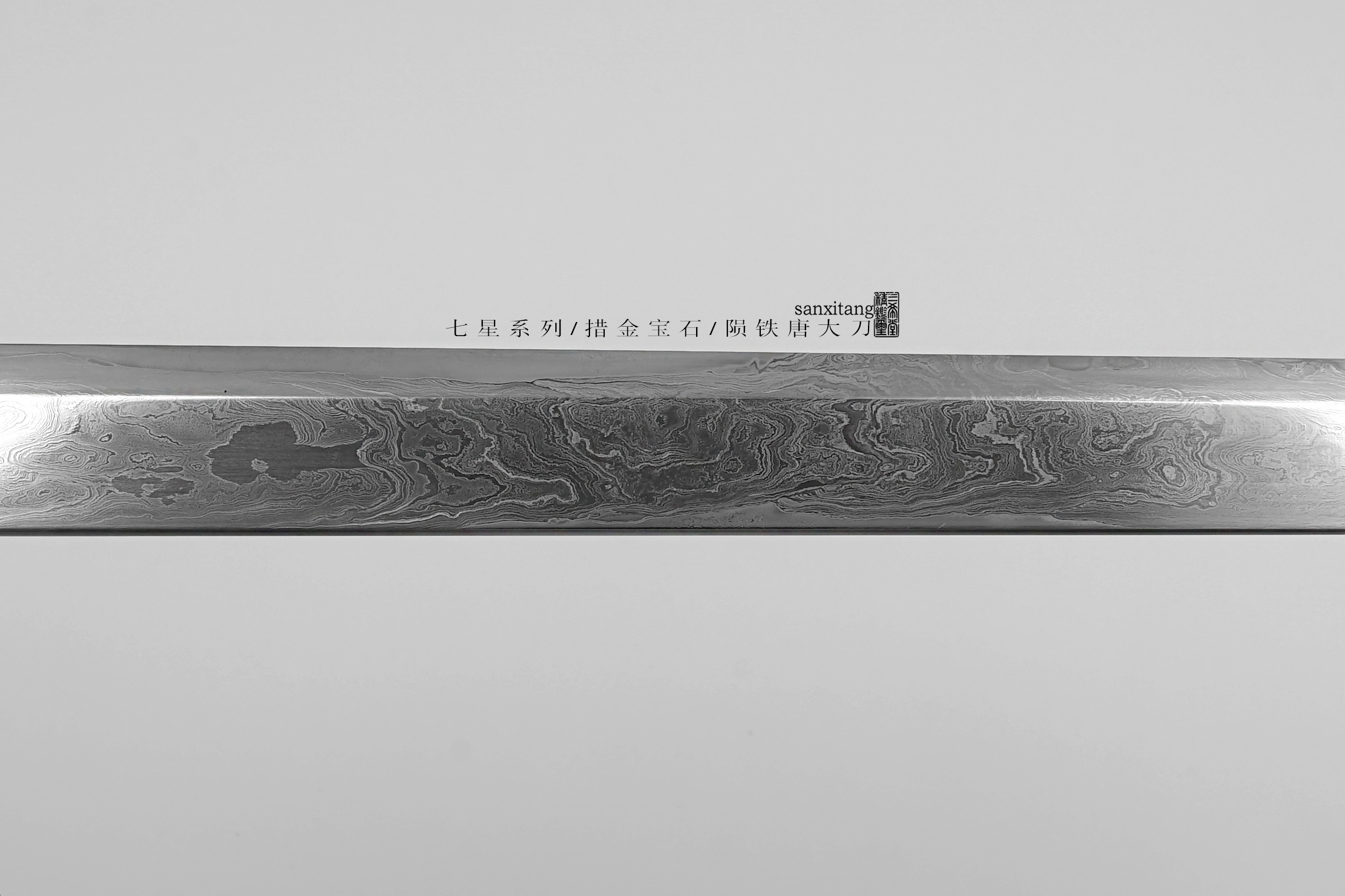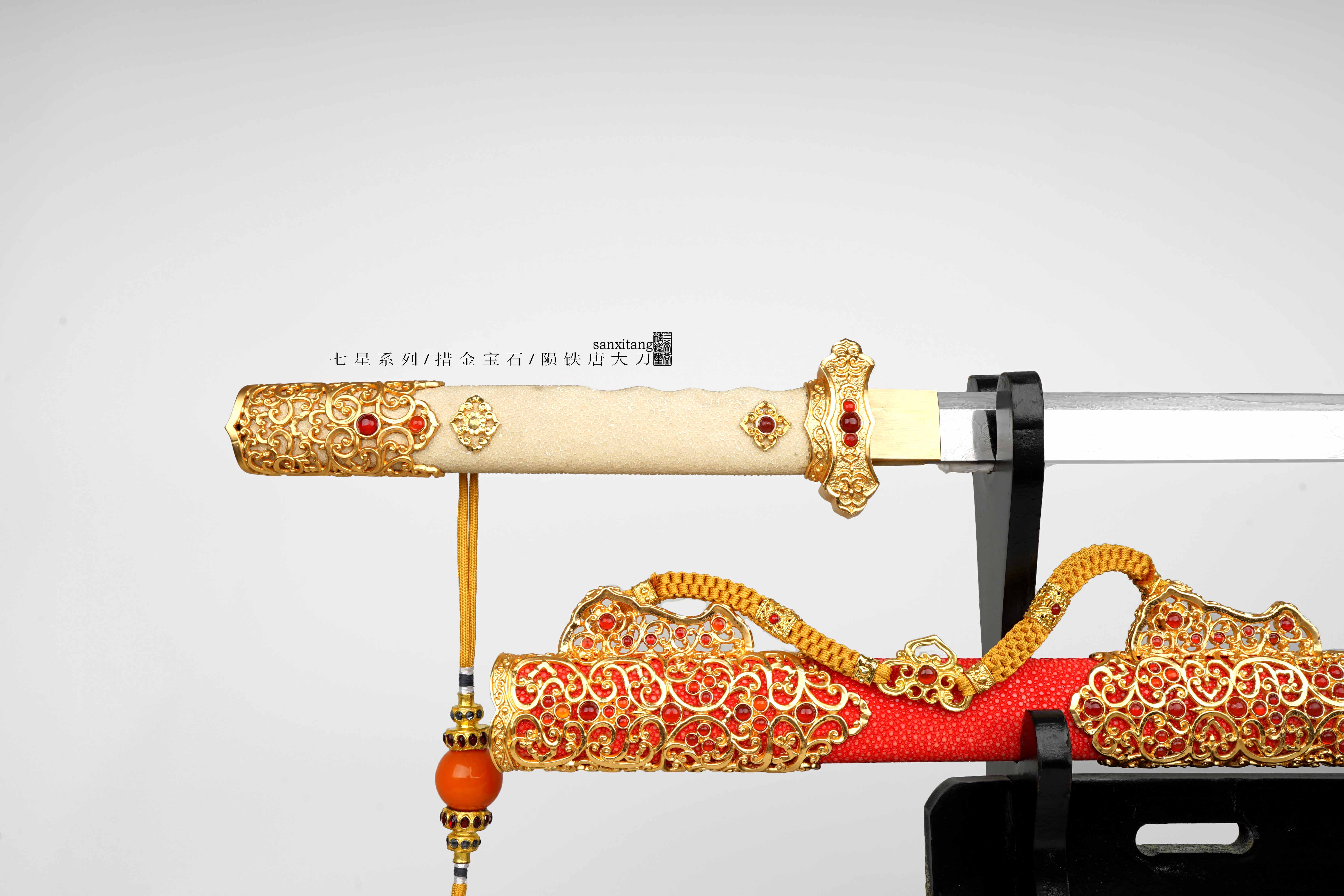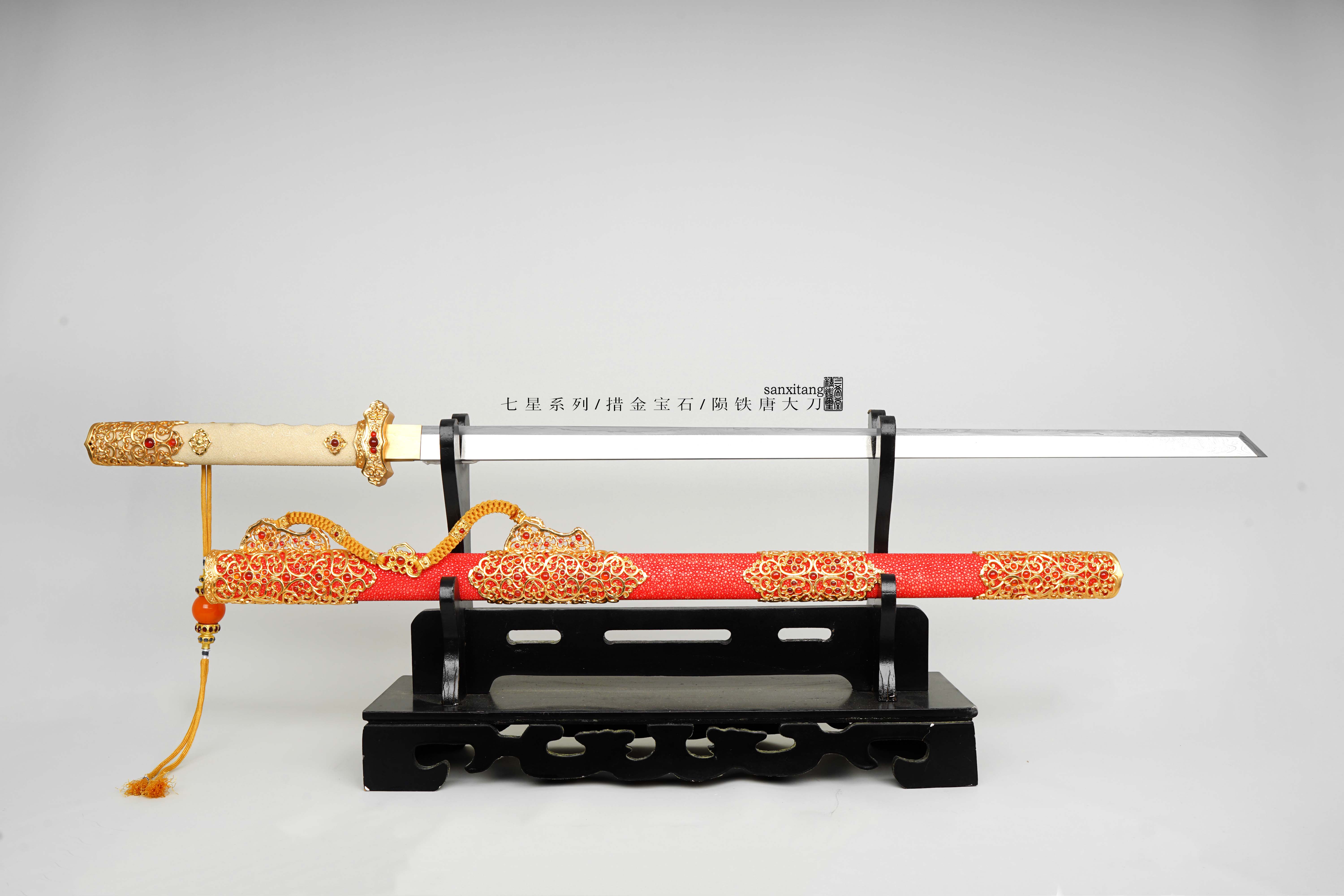 这只是陨铁版本的 比普通版本贵一些 普通版本的外观是一样的 就是刀条不同 价格是12800 也可以入手 全长105 全错金镂空金具 镀的很厚的24k金 上面有宝石镶嵌 全东南亚进口优质珍珠鱼皮包裹柄和鞘 手柄做了手指形状 握感舒适 我们自己锻打的16000余层陨铁刀条材料难得也昂贵 纹路大家可以看下 和普通的完全不一样 有种水墨画的感觉 还不错的一只高端作品 各位收藏或者送送领导朋友都是非常合适的