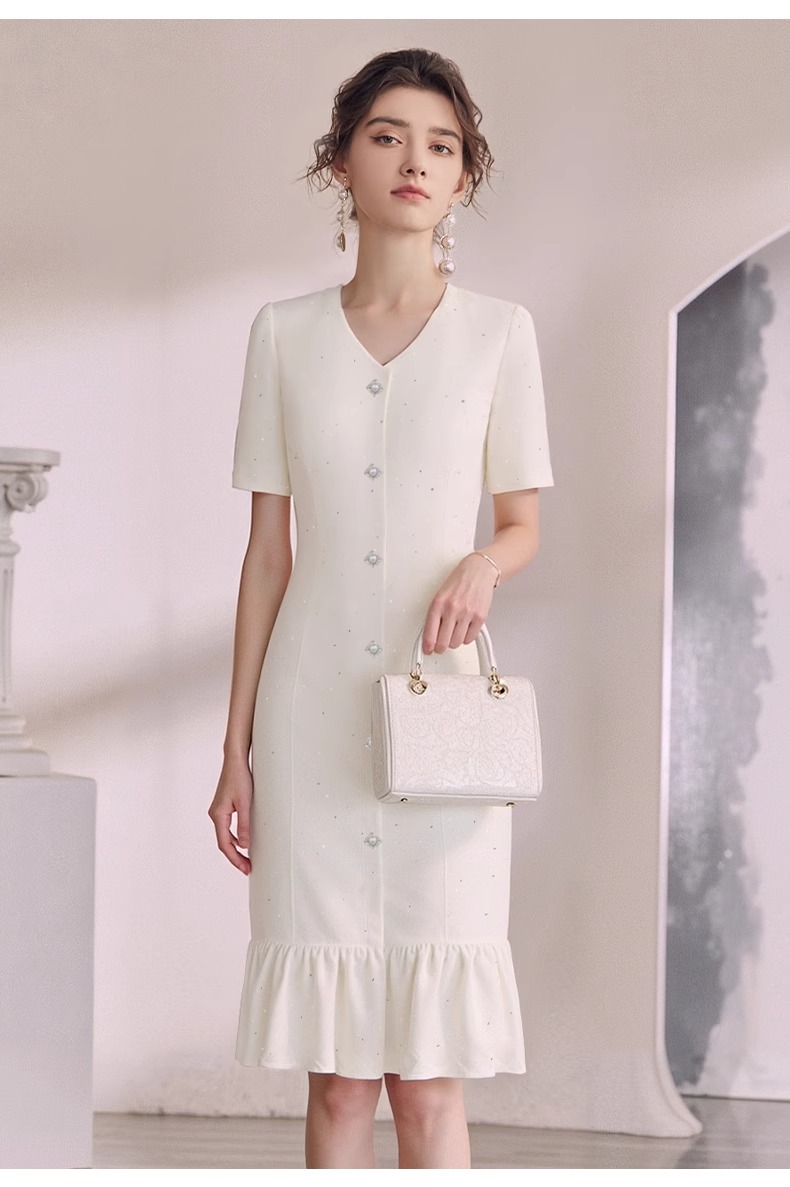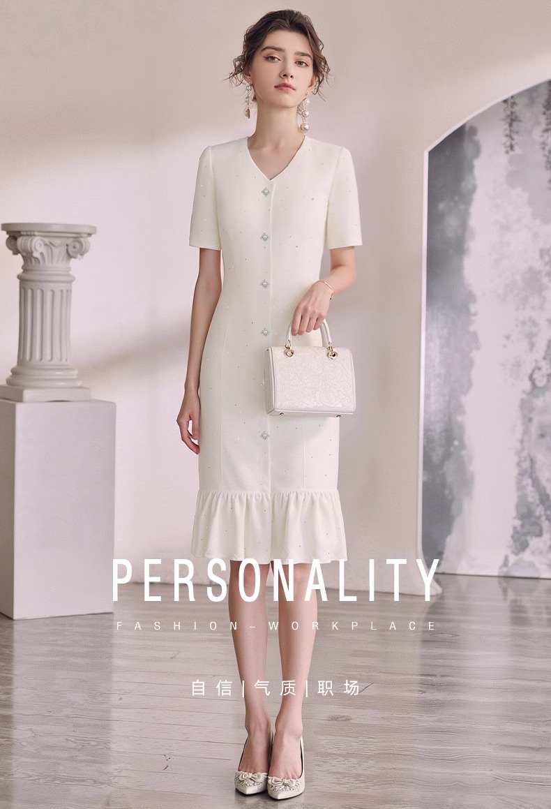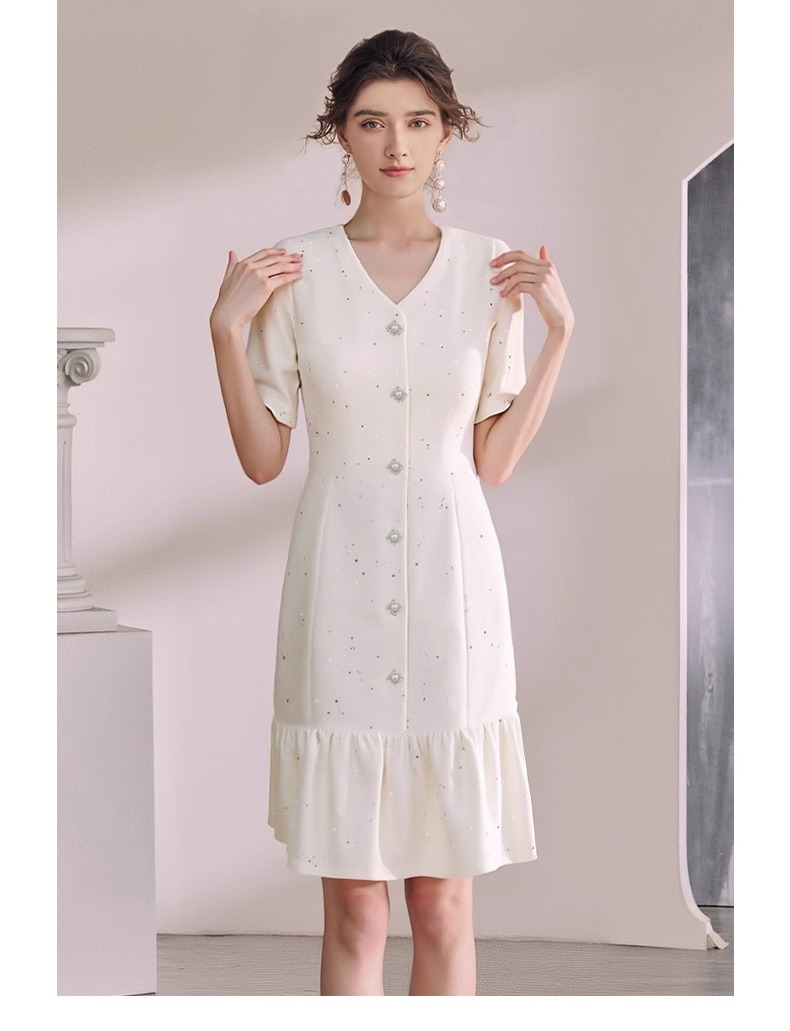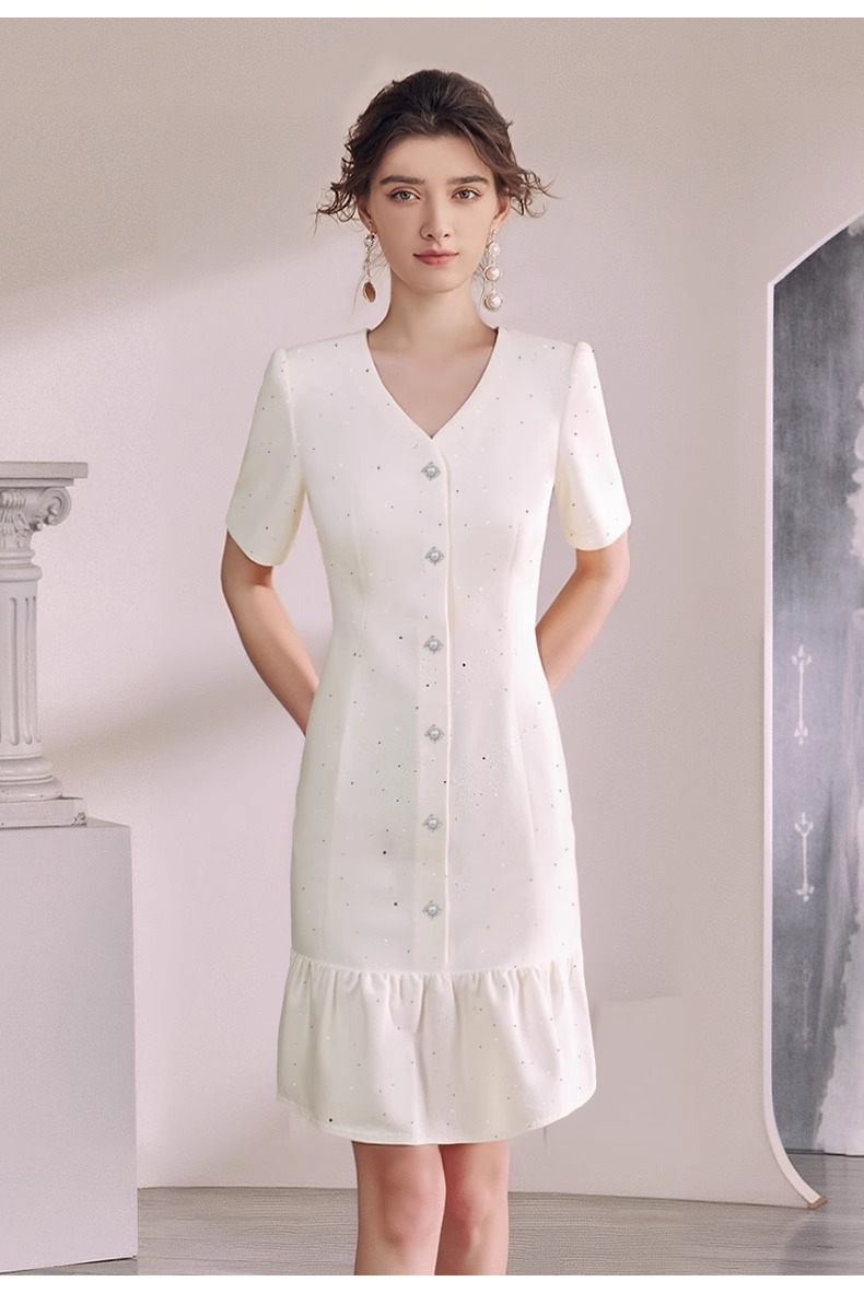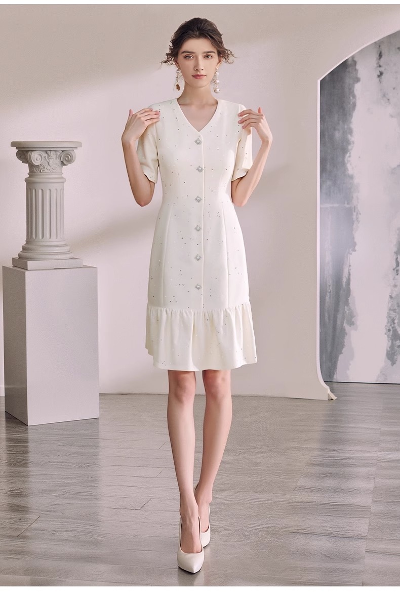 IWY/米白色气质优雅V领显瘦小香风连衣裙夏季收腰显瘦a字裙WQ192
