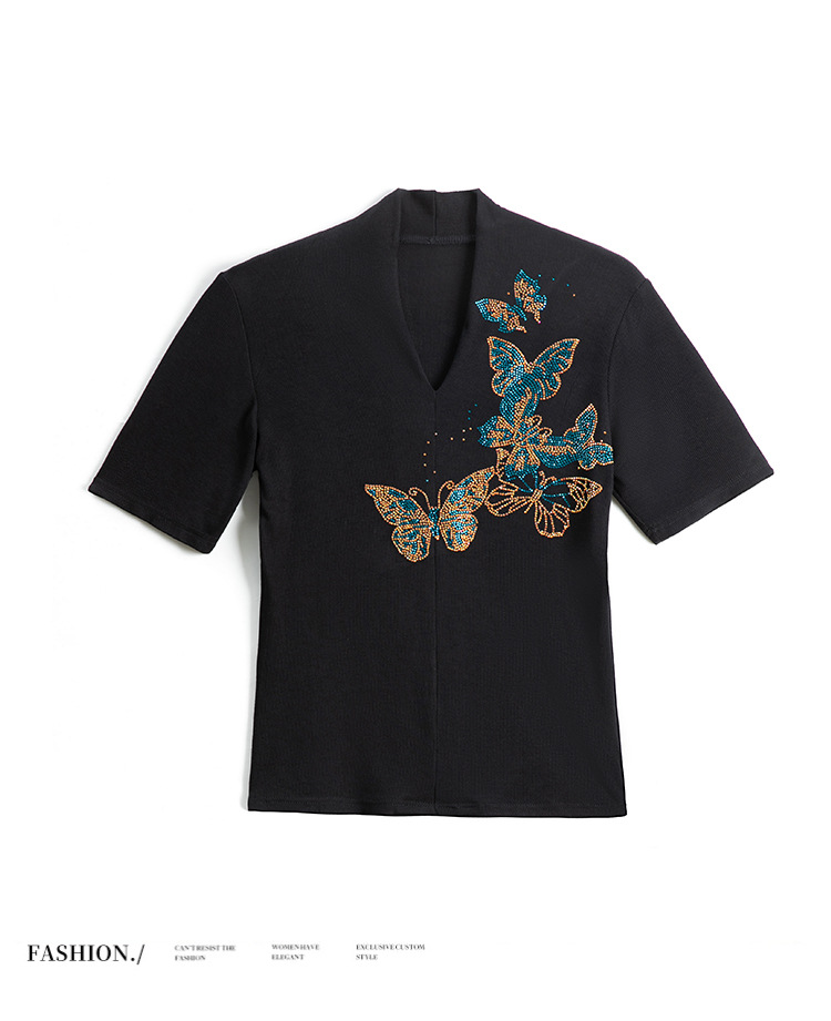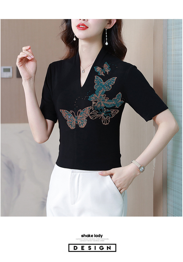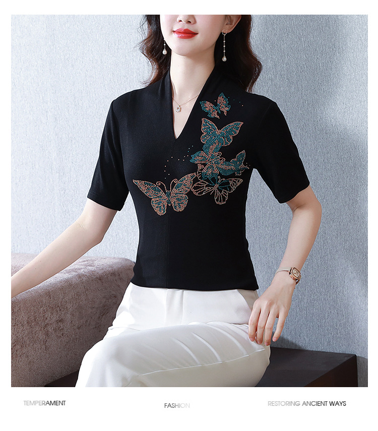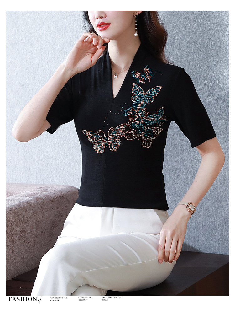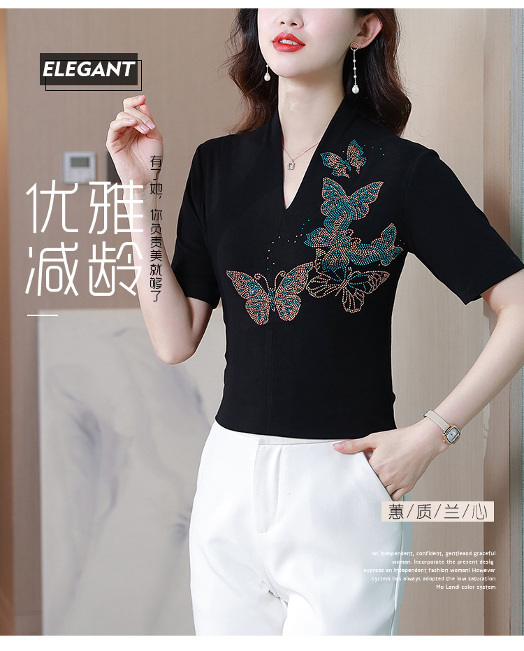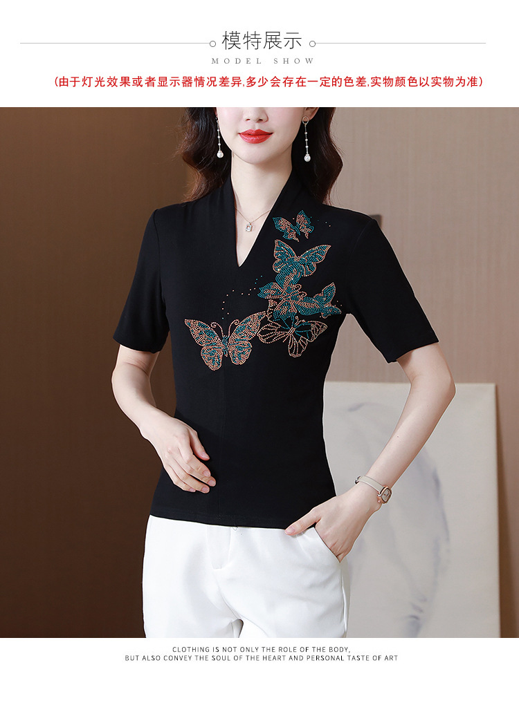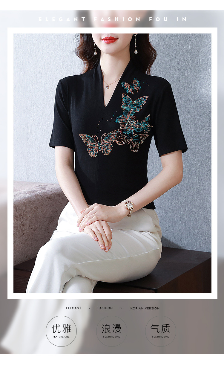 夏季新款,V领创意经典修身小众简约烫钻半袖T恤百搭大码打底衫KQL-D46M9992