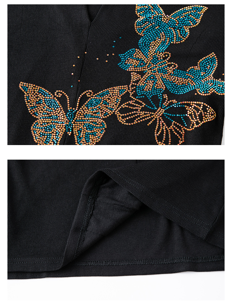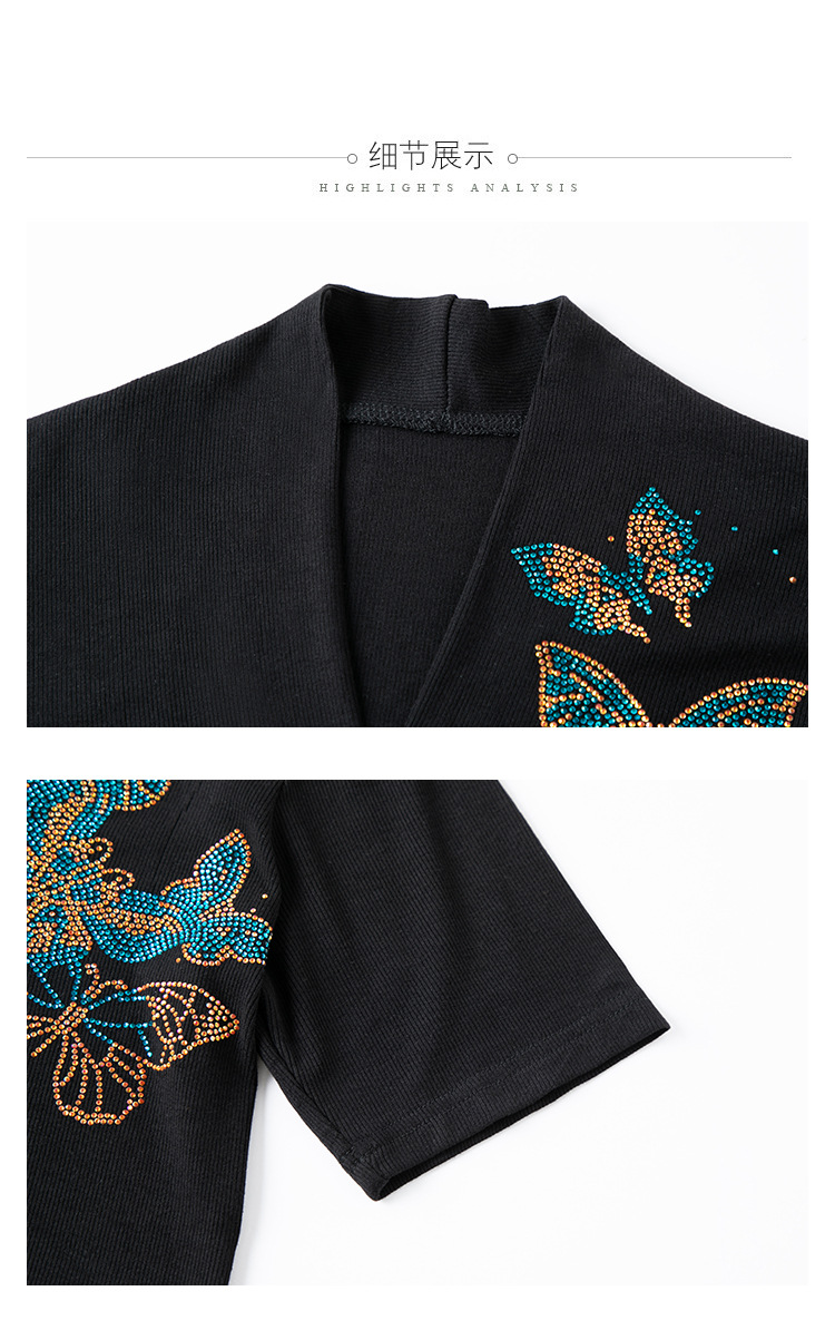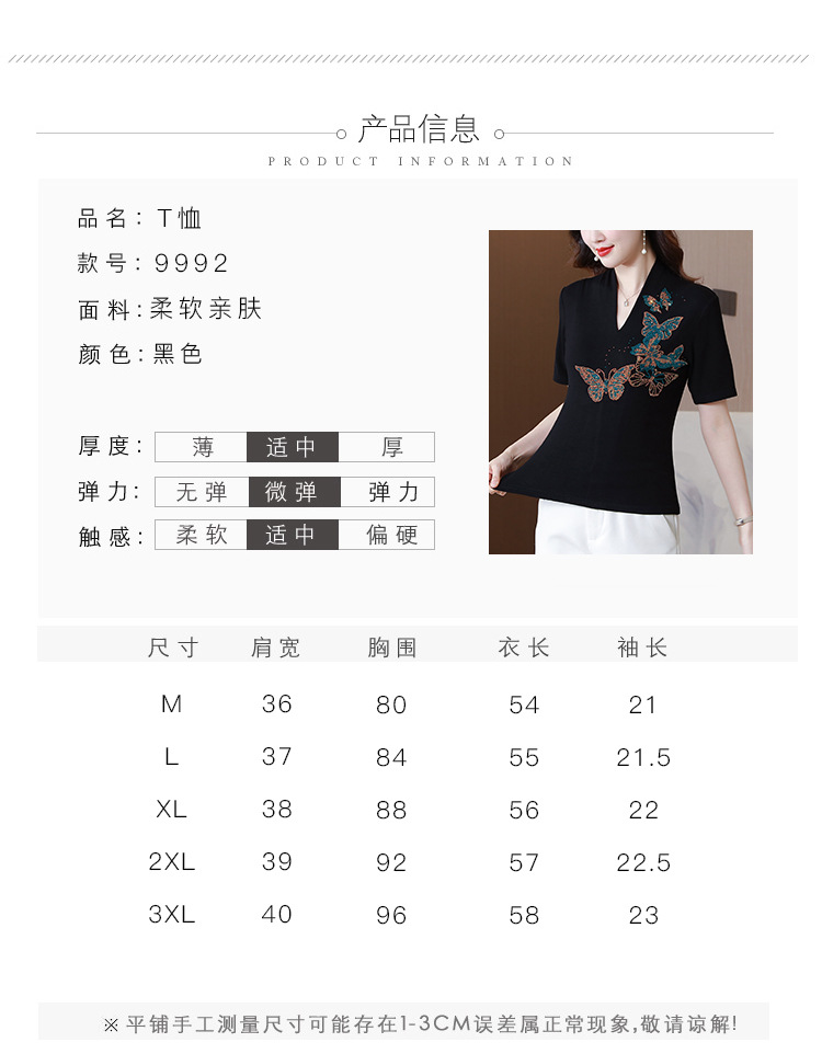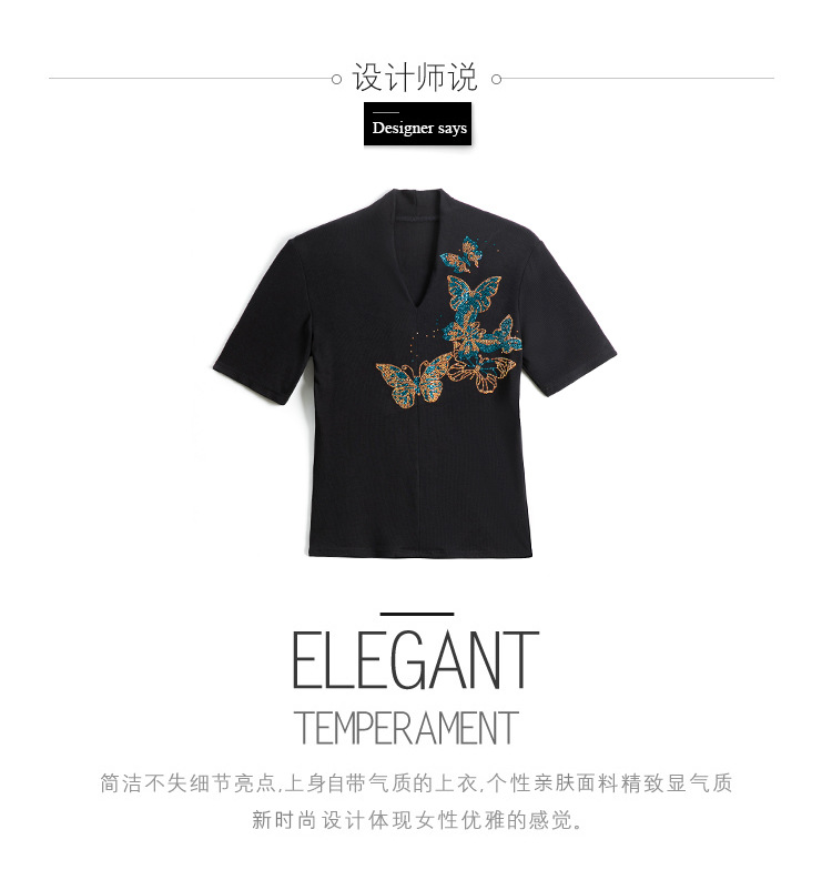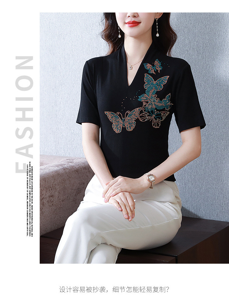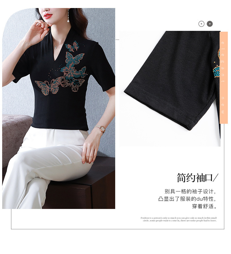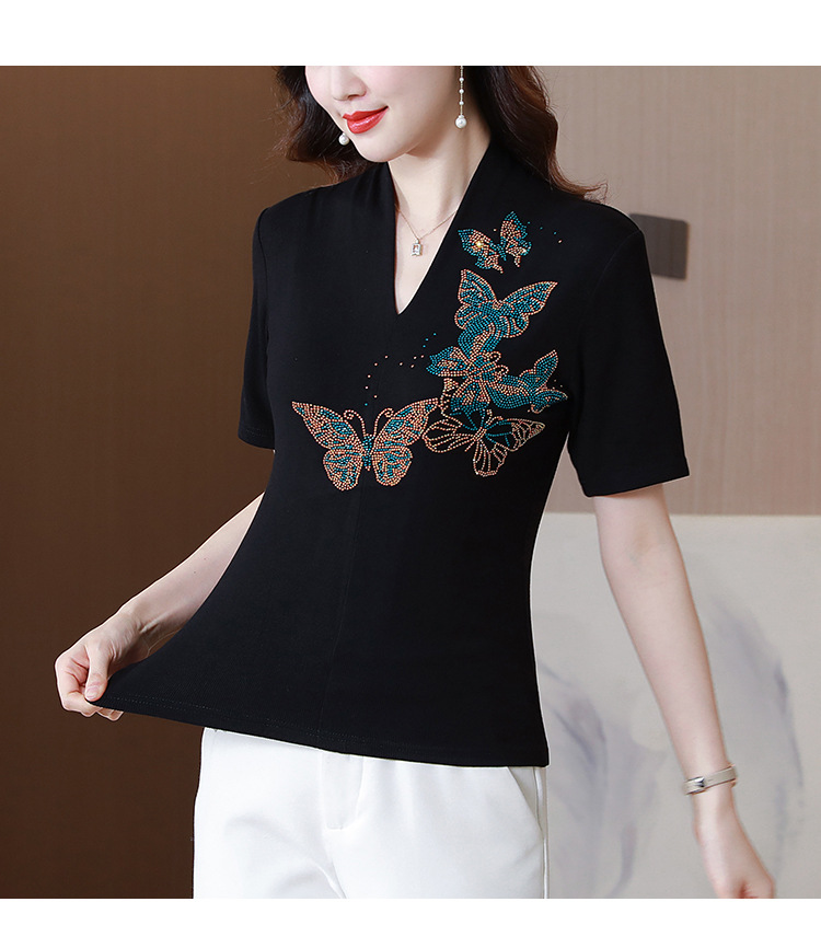 夏季新款,V领创意经典修身小众简约烫钻半袖T恤百搭大码打底衫KQL-D46M9992
