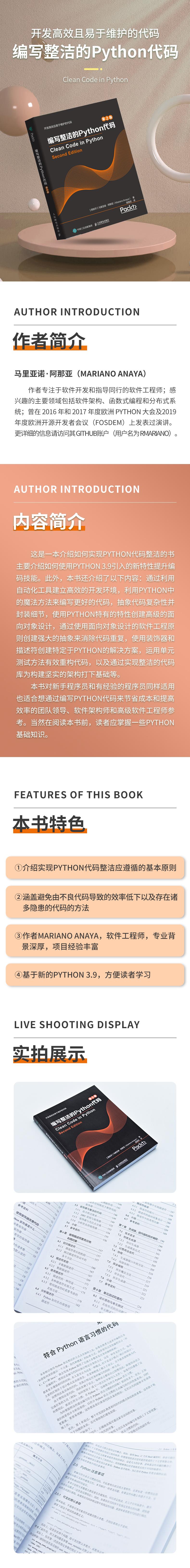 这是一本介绍如何实现Python代码整洁的书,主要介绍如何使用Python3.9引入的新特性提升编码技能。此外,本书还介绍了以下内容:通过利用自动化工具建立高效的开发环境,利用Python中的魔法方法来编写更好的代码,抽象代码复杂性并封装细节,使用Python特有的特性创建高级的面向对象设计,通过使用面向对象设计的软件工程原则创建强大的抽象来消除代码重复,使用装饰器和描述符创建特定于Python的解决方案,运用单元测试方法有效重构代码,以及通过实现整洁的代码库为构建坚实的架构打下基础等。本书对新手程序员和有经验的程序员同样适用,也适合想通过编写Python代码来节省成本和提高效率的团队领导、软件架构师和高级软件工程师参考。当然在阅读本书前,读者应掌握一些Python基础知识。