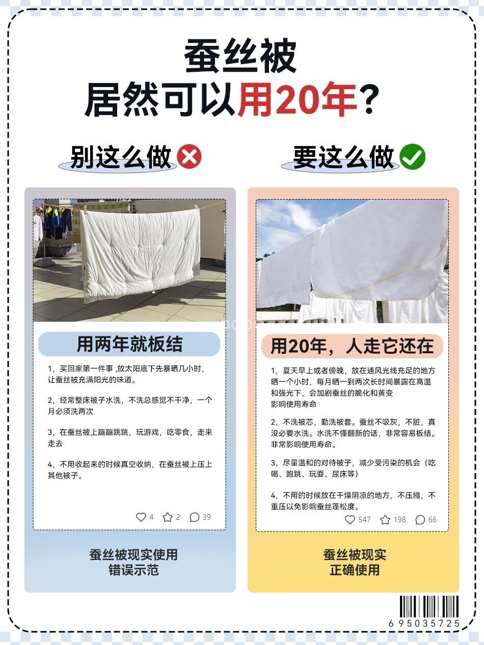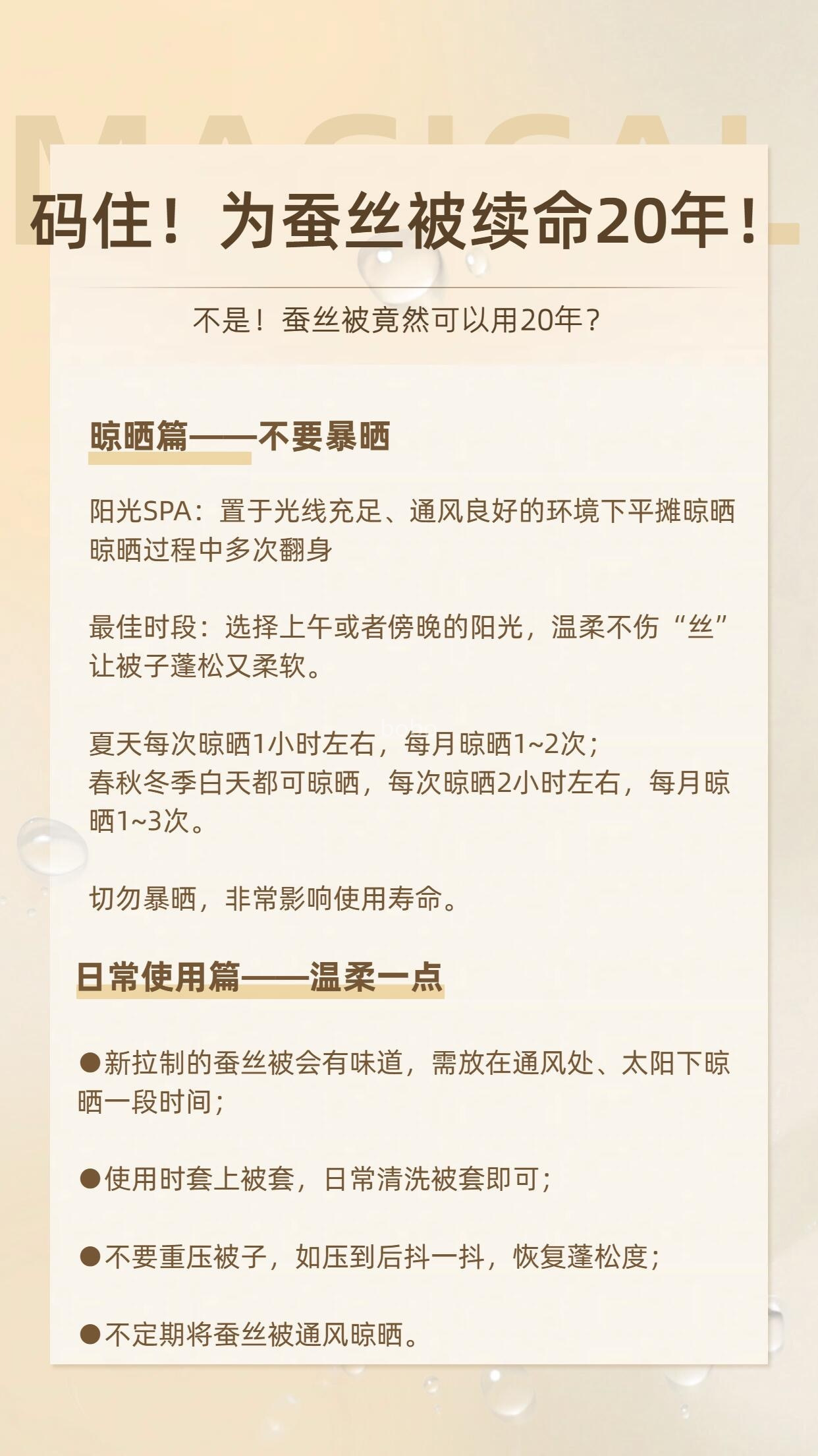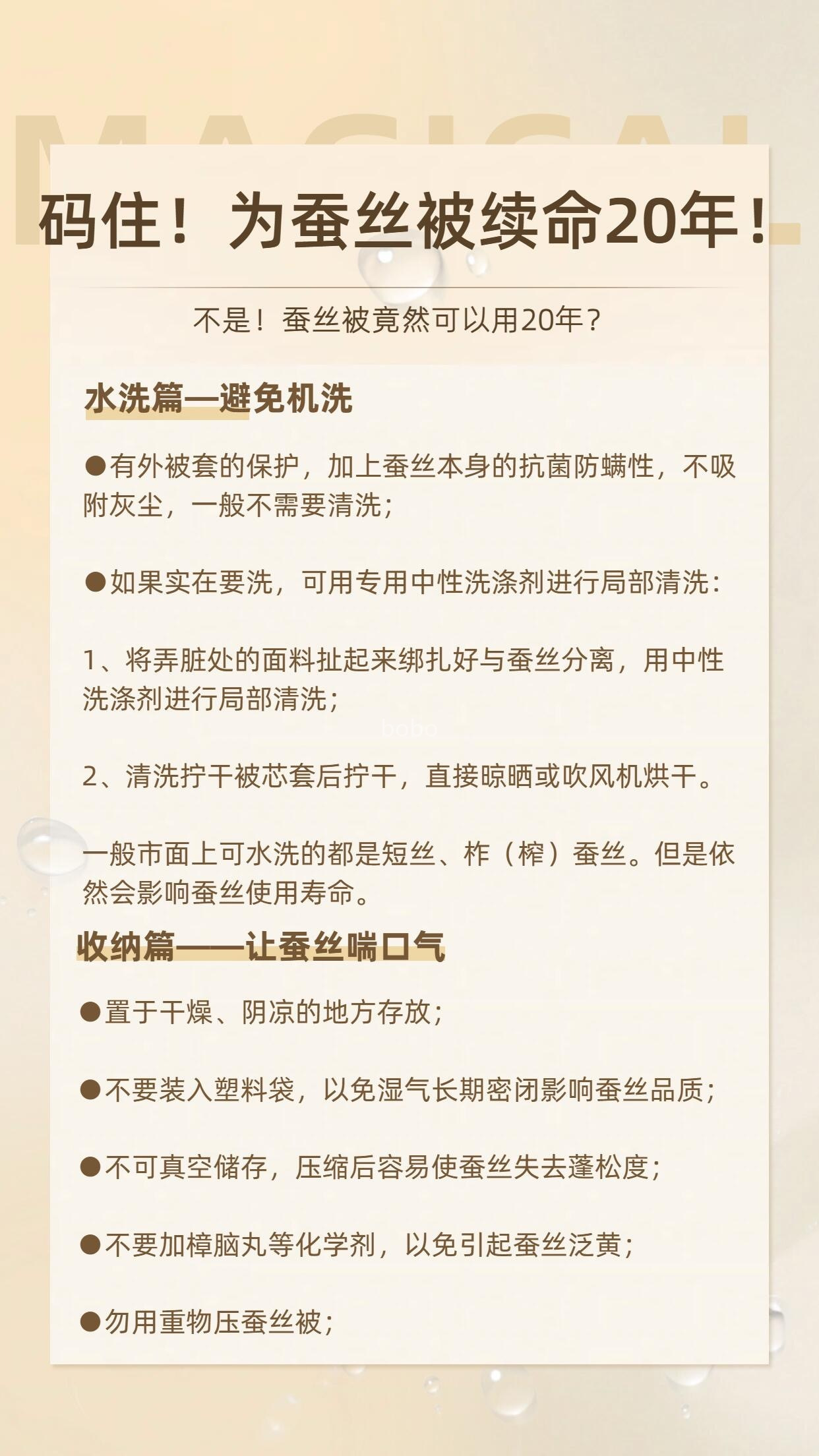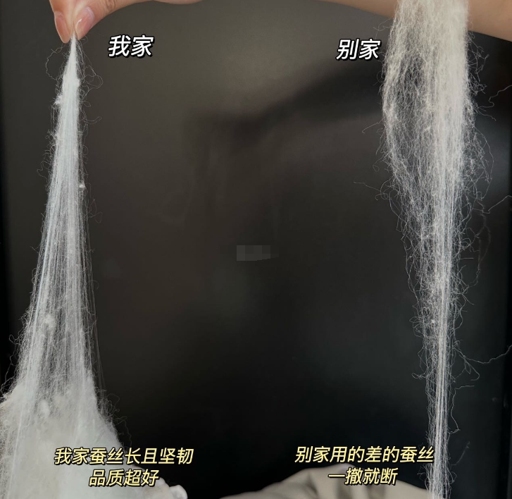 我家蚕丝被纯手工制作 全程拉蚕丝兜、晾晒、扯丝全部阿姨们手工制作 裸睡+蚕丝被=极致体验! 纯实物实拍 所见即所得 蚕丝被是被子里的“长寿类星”,我妈常说的蚕丝被可 以用一辈子都没事,虽然有点夸张,但是蚕丝被的使用寿命应该是所有被 子里面使用寿命最长的,用过的朋友应该都知道。 一床好的蚕丝被可以使用10、15年甚至更久。 老师傅的手艺暴击:每床被子都是匠人手工定位绗缝,柞蚕丝填充均匀到毫米级! 兰精天丝被壳用德国精密织机织造,纹路紧密得像艺术品,我们还随机附赠洗护袋,洗衣机清洗时用轻柔模式机洗,洗后不起球、不变形,用3年还跟新的一样
