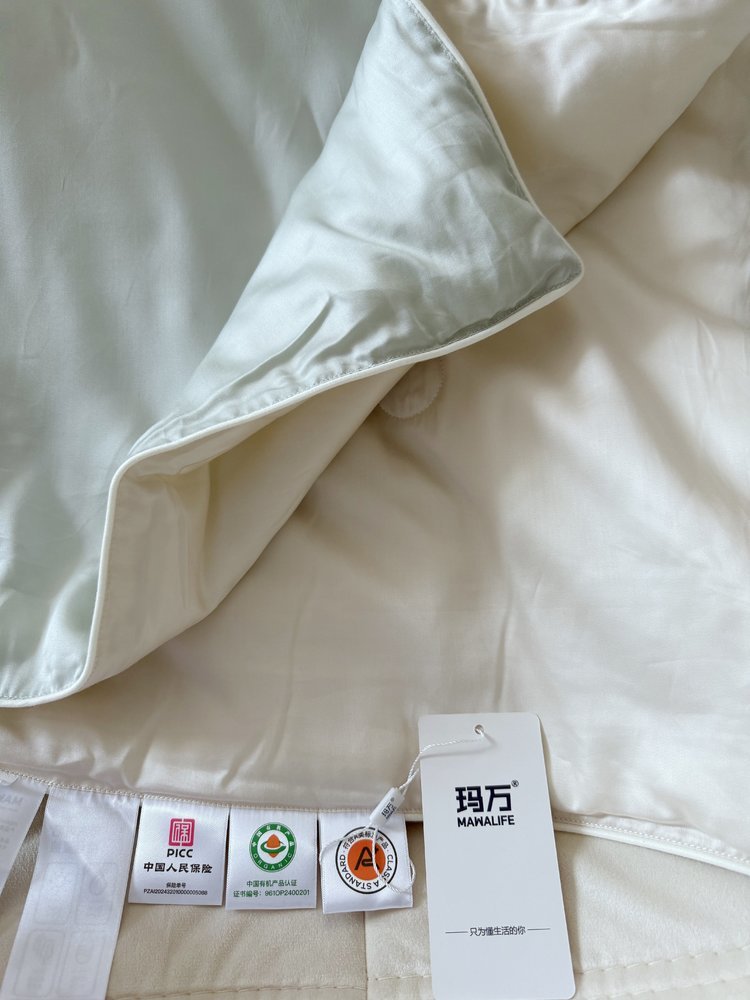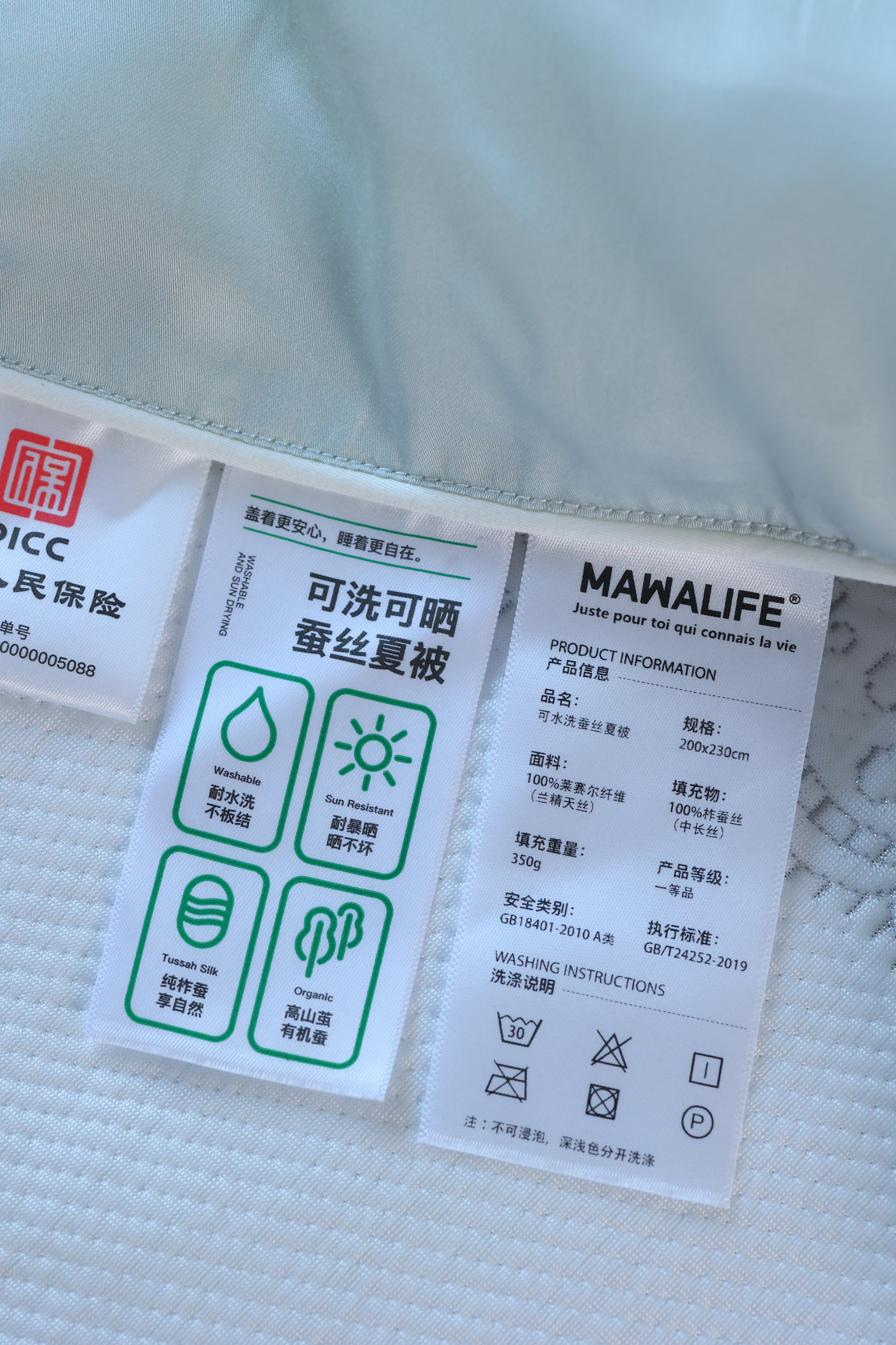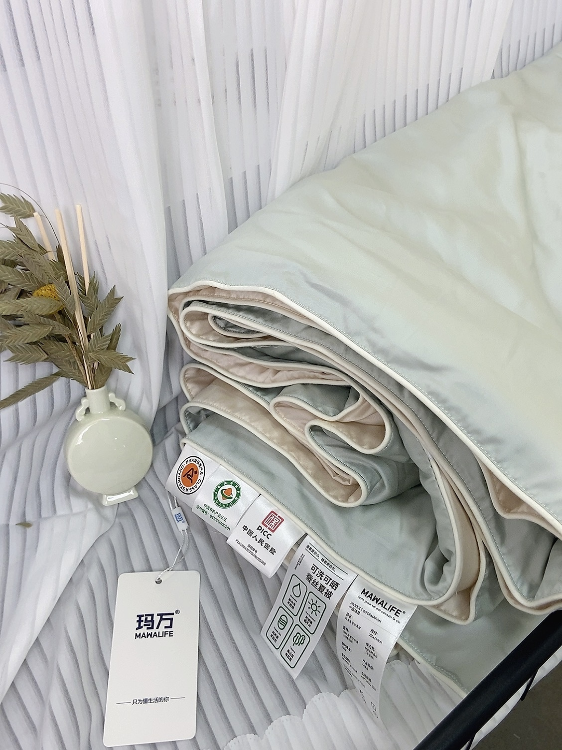 【A类母婴 100%蚕丝填充 】玛万兰精天丝夏日冰淇淋蚕丝被 【品牌】玛万 【规格】150*200 、200*230cm 2个尺寸 (限时赠送洗衣袋1个) 【面料材质】面料:100%莱赛尔纤维(兰精天丝)填充物:100%柞蚕丝(中长丝) 【填充物重量】350g 【颜色】草色+羊绒白 AB面 【发货地区】南通 【发货快递】三通一达 【发货时间】截单后3-5天内 【不发地区】新疆、西藏不发,内蒙、甘肃、宁夏、海南、青海+20,北京、上海+2元 【售后标准】 1.支持7天无理由退换货,非质量问题运费自理(不能影响二次销售); 2.物流签收超过7天!!不予售后!! 3.产品质量问题,签收24h内(拍照快递面单➕产品质量问题照片)反馈客服; 4.快递运输过程中拦截、拒收扣10块运费!!