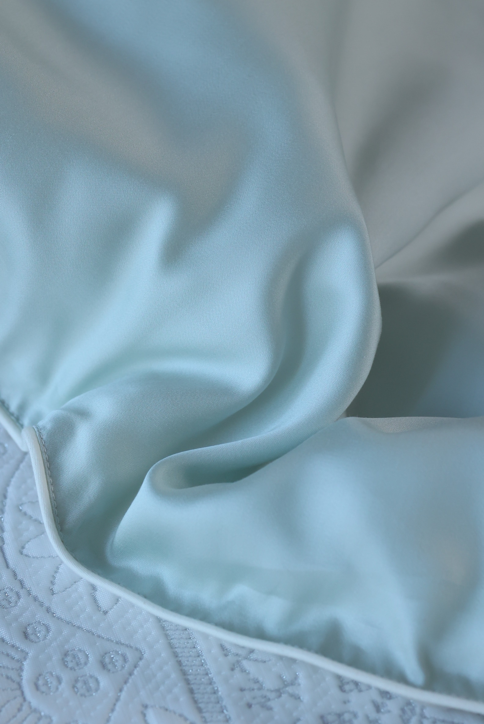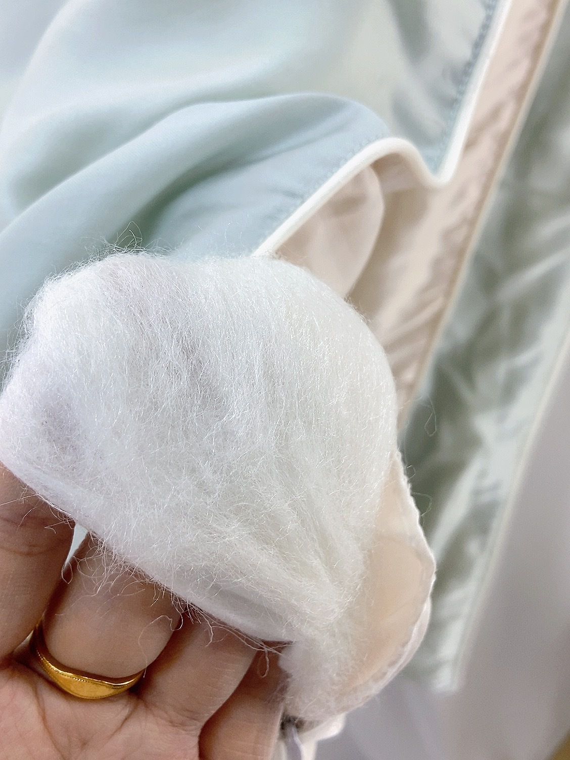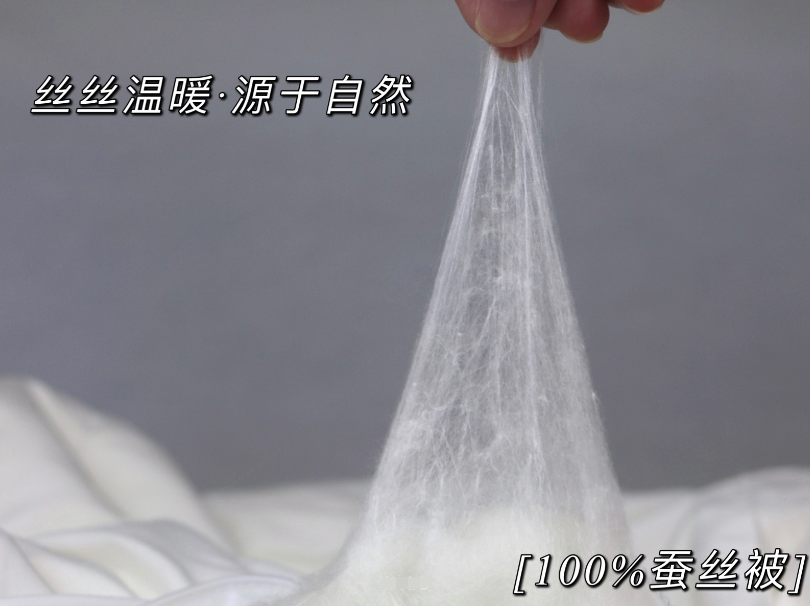 ❄ 柞蚕丝填充:自带营养成分 柞蚕吃着柞树叶长大,吐出的丝满满的都是天然营养 原生态: 野蚕丝代表,蚕茧产于露天柞树林,纤维截面呈扁平椭圆状。 ❄ 功能性: 含有18种氨基酸,兼具溶菌酶抑菌能力和多孔结构带来的吸湿透气性。 ❄ 稳定性: 抗燃点达300~460℃,耐酸碱且抗紫外线。 高品质的蚕丝被,不仅给予肌肤极致的呵护,更有益身心健康。精心挑选,精细加工,柔软细腻。 ❄ 蚕丝吸湿透气,舒适温润,可以调节体温,带来舒缓安宁的入眠体验,让你在梦中感受到轻盈与 温馨。