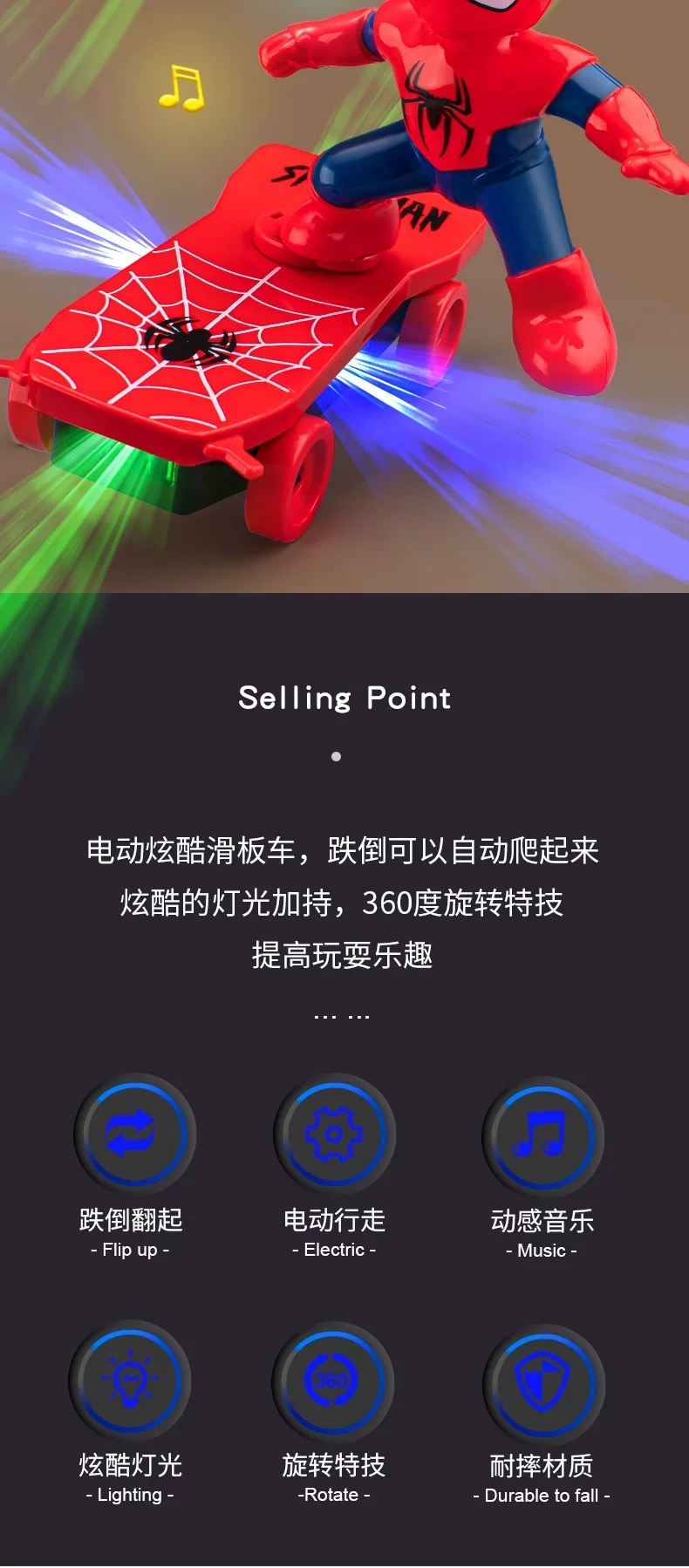 炫酷轻松的造型娱乐的小玩伴给你展示炫酷360度旋转特技舞蹈搭配炫彩灯光,动感音律,带动全场气氛跟着蜘蛛勇士一起来玩吧!