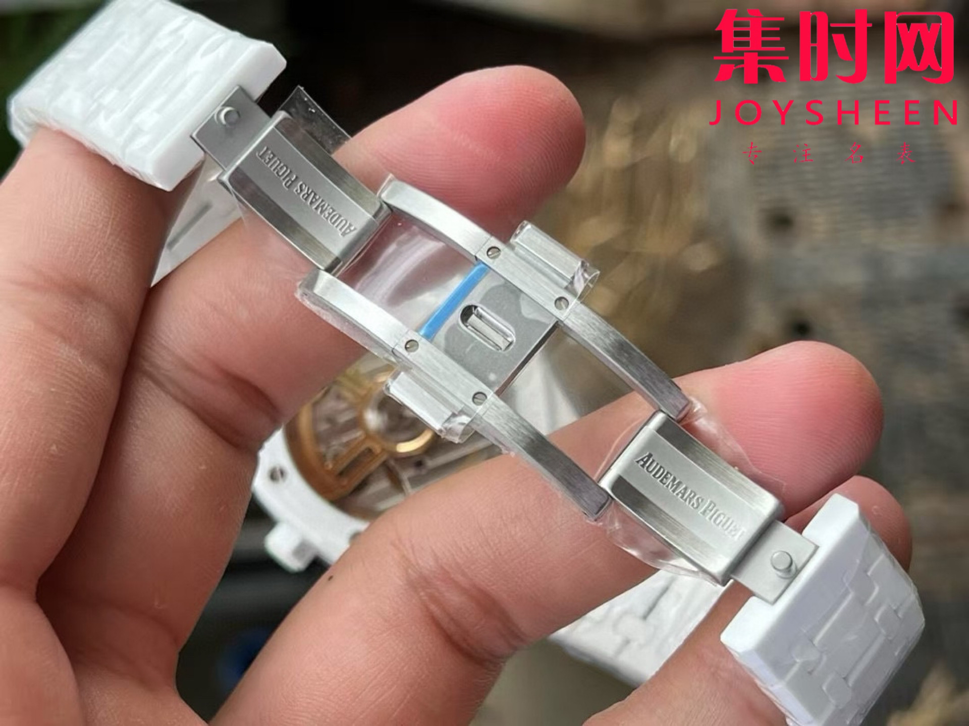 一体式结构:表壳与表带无缝衔接,延续皇家橡树标志性八角形表圈和“Tapisserie”格纹表盘,陶瓷材质赋予现代感。