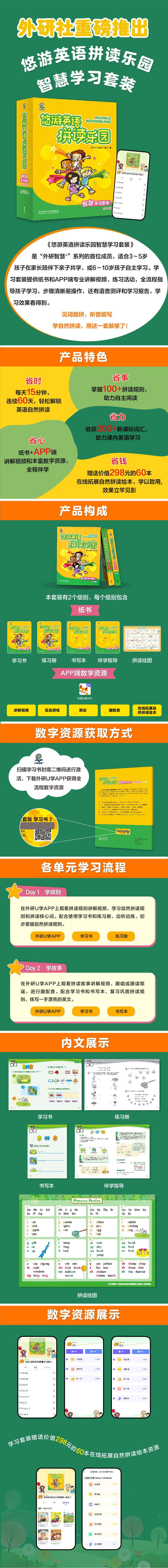 《外研智慧+ 悠游英语拼读乐园智慧学习套装点读版》是一套内容优质、配套完善、适合家庭场景使用的英语自然拼读学习产品,含两个级别,适合3到6岁孩子亲子共学,6到10岁孩子自主学习。