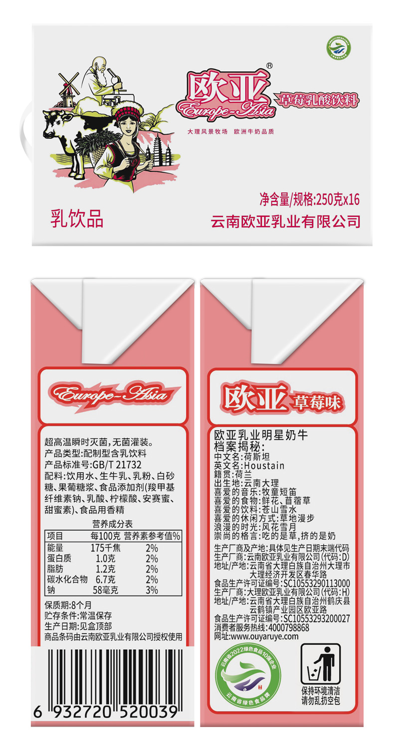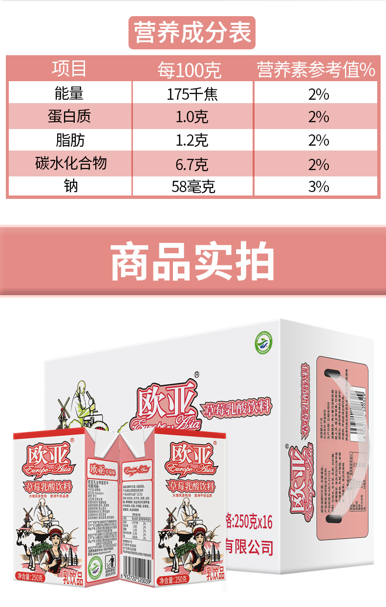 欧亚 草莓乳酸菌饮料250g*16盒/箱 随时随地补充活力 48小时发货