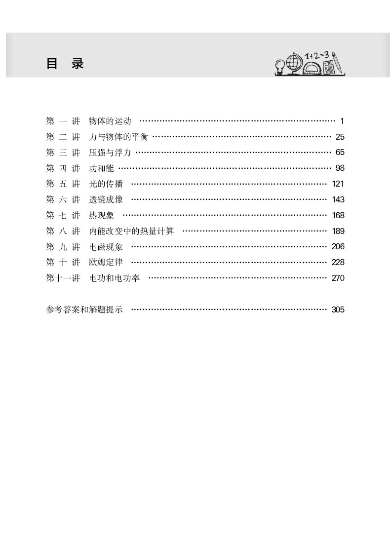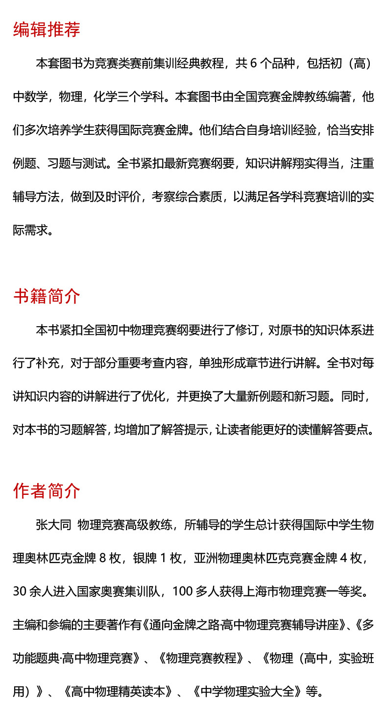 本书紧扣全国初中物理竞赛纲要进行了修订,对原书的知识体系进行了补充,对于部分重要考查内容,单独形成章节进行讲解。全书对每讲知识内容的讲解进行了优化,并更换了大量新例题和新习题。同时,对本书的习题解答,均增加了解答提示,让读者能更好的读懂解答要点。
