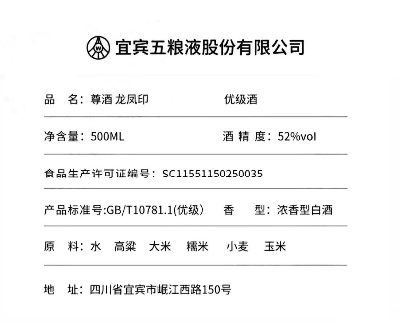 五粮液股份出品 尊酒龙凤印 52度浓香型白酒 送礼收藏宴请粮食酒52度 500ML