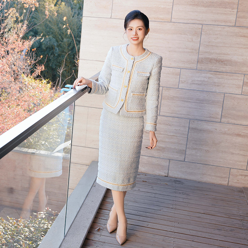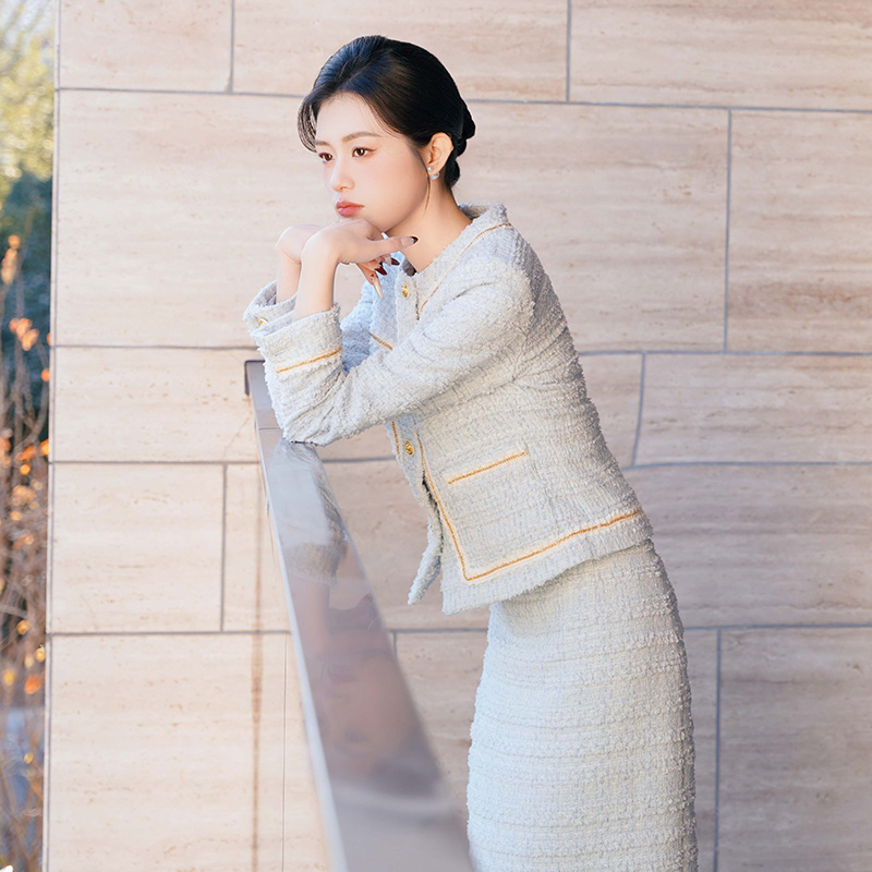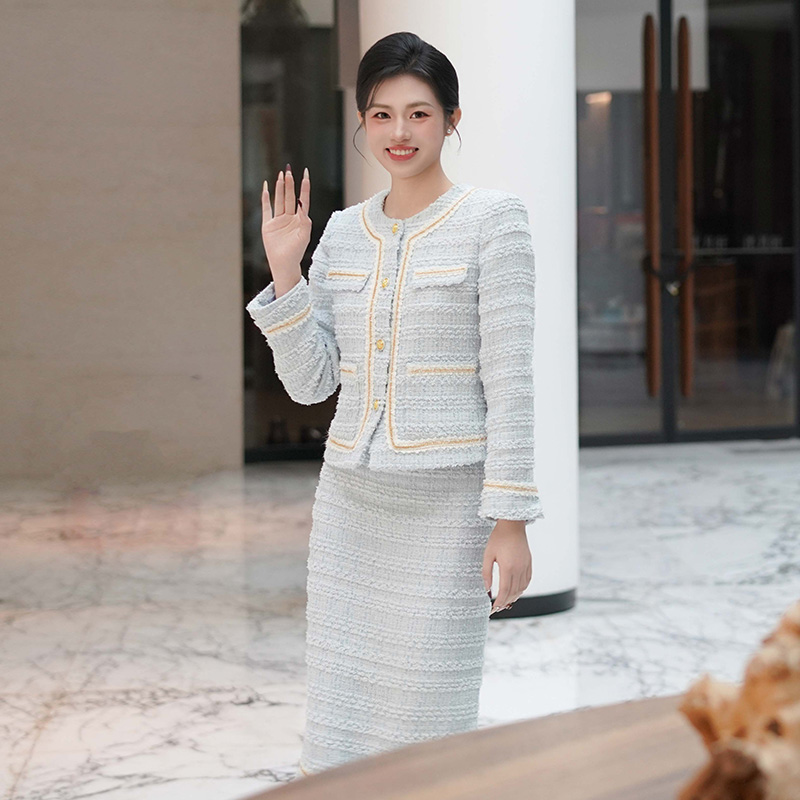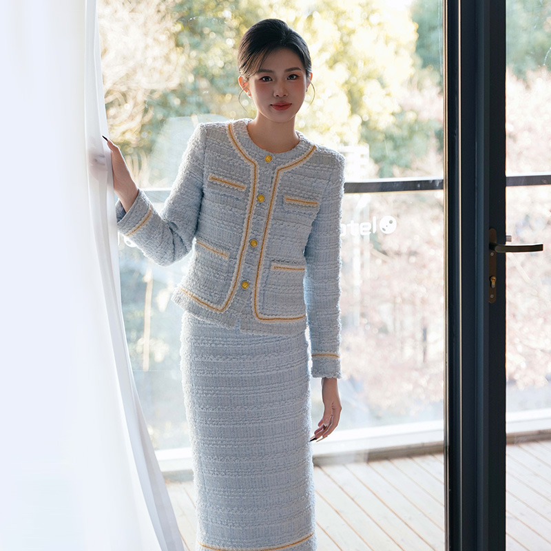 法小曼*子珍专款/淡蓝色职业装套裙小香风外套秋冬千金优雅长裙教师公开课厚款