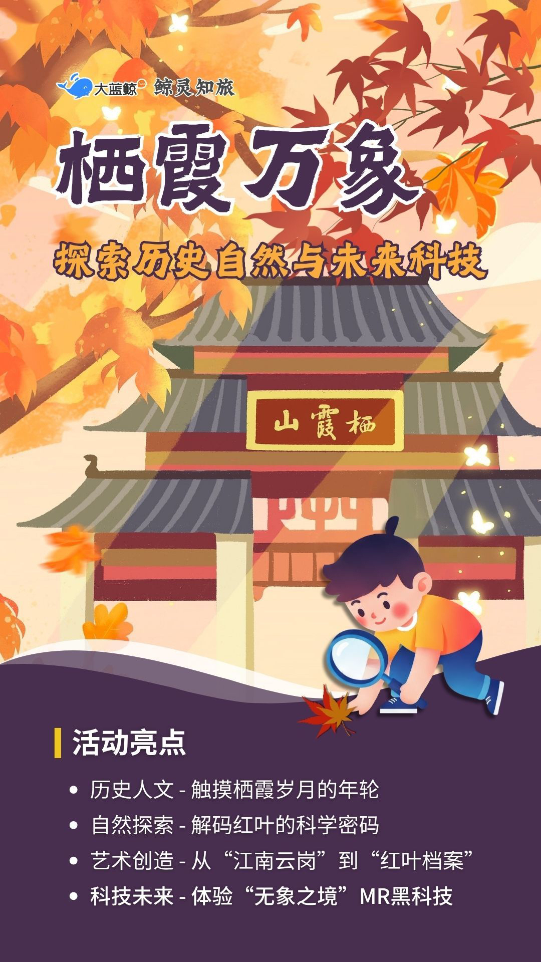 大蓝鲸爱研学|【独立一日营】栖霞万象,从始皇临江、千佛岩探秘到红叶科学解码,体验MR瞬息全宇宙,共创秋日艺术手作