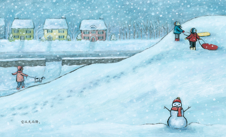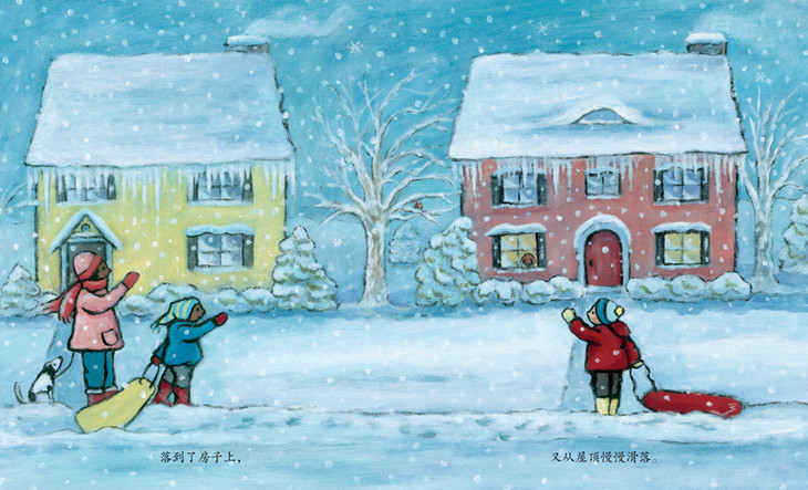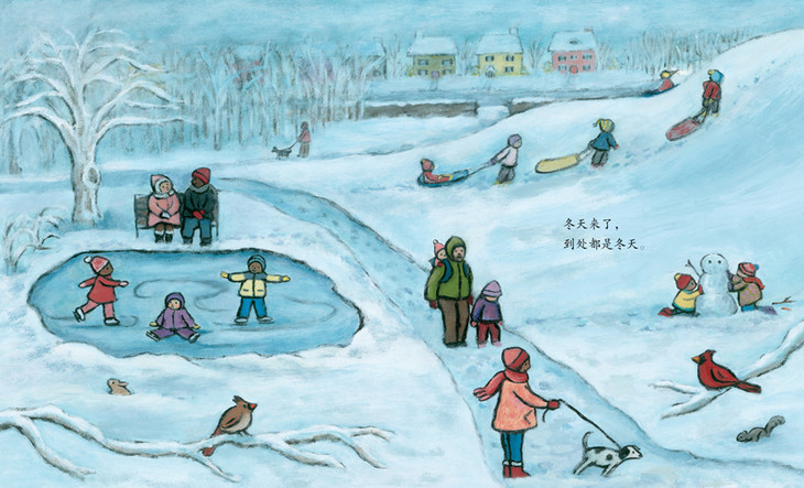 《冬天在这里》把冬天写得既宁静又异常调皮。“冬天来了,到处都是冬天。”乍一看似乎满眼都是白皑皑的雪花,连寒冷的感觉都扑面而来。可是,除了到处都是的白雪之外,在雪地里玩耍的孩子也到处都是。寥寥几个字,让人体会到冬天是一个多么具有两面性的季节啊——可以是寒冷的,也可以是热闹的;可以是悄然无息的,又可以是气势磅礴的……读这样的一本季节书,孩子的体验是丰富的、立体的。