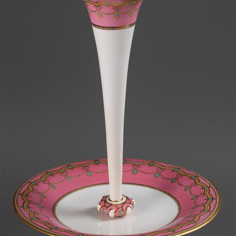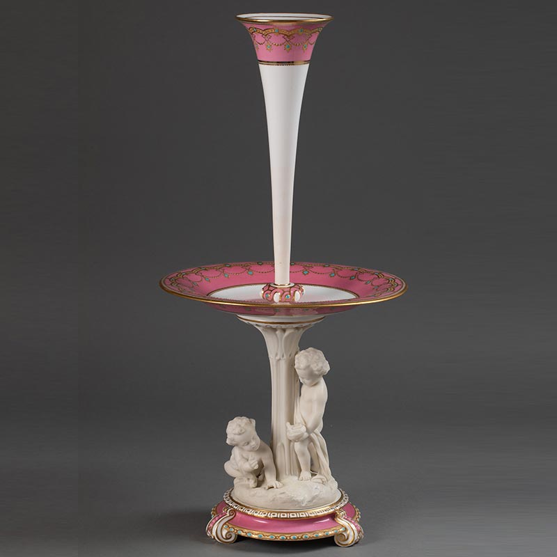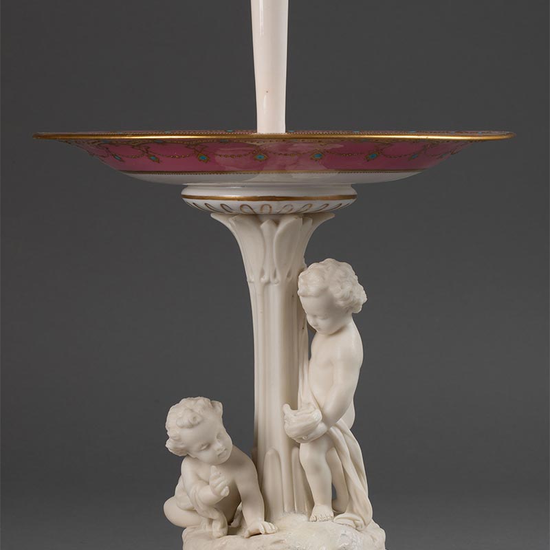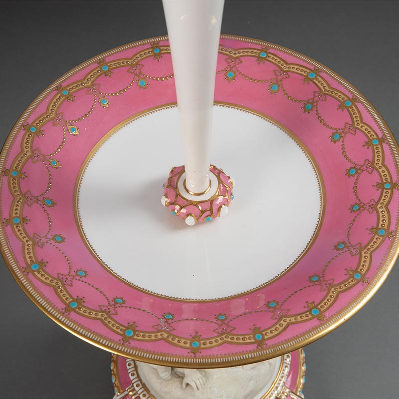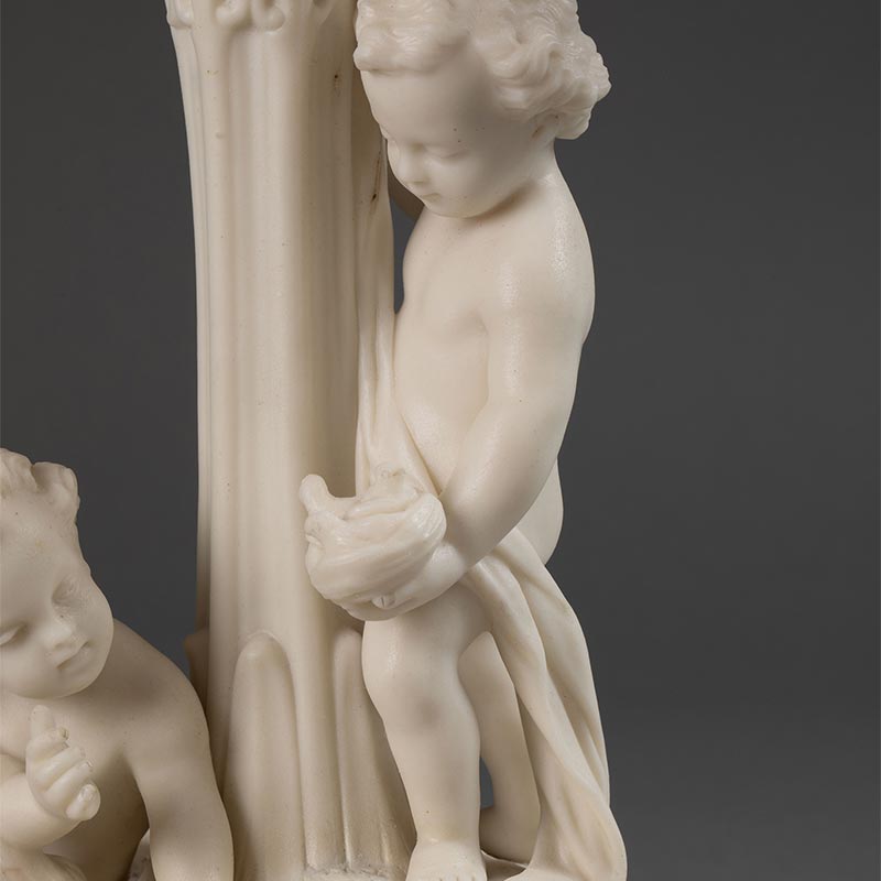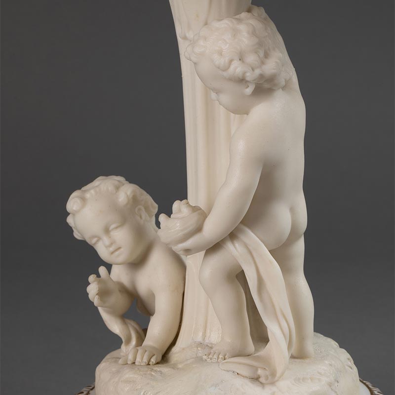 19世纪法国出品小天使主题素胎瓷雕底座马蹄莲造型手绘描金装饰粉白釉瓷制中央花瓶摆件