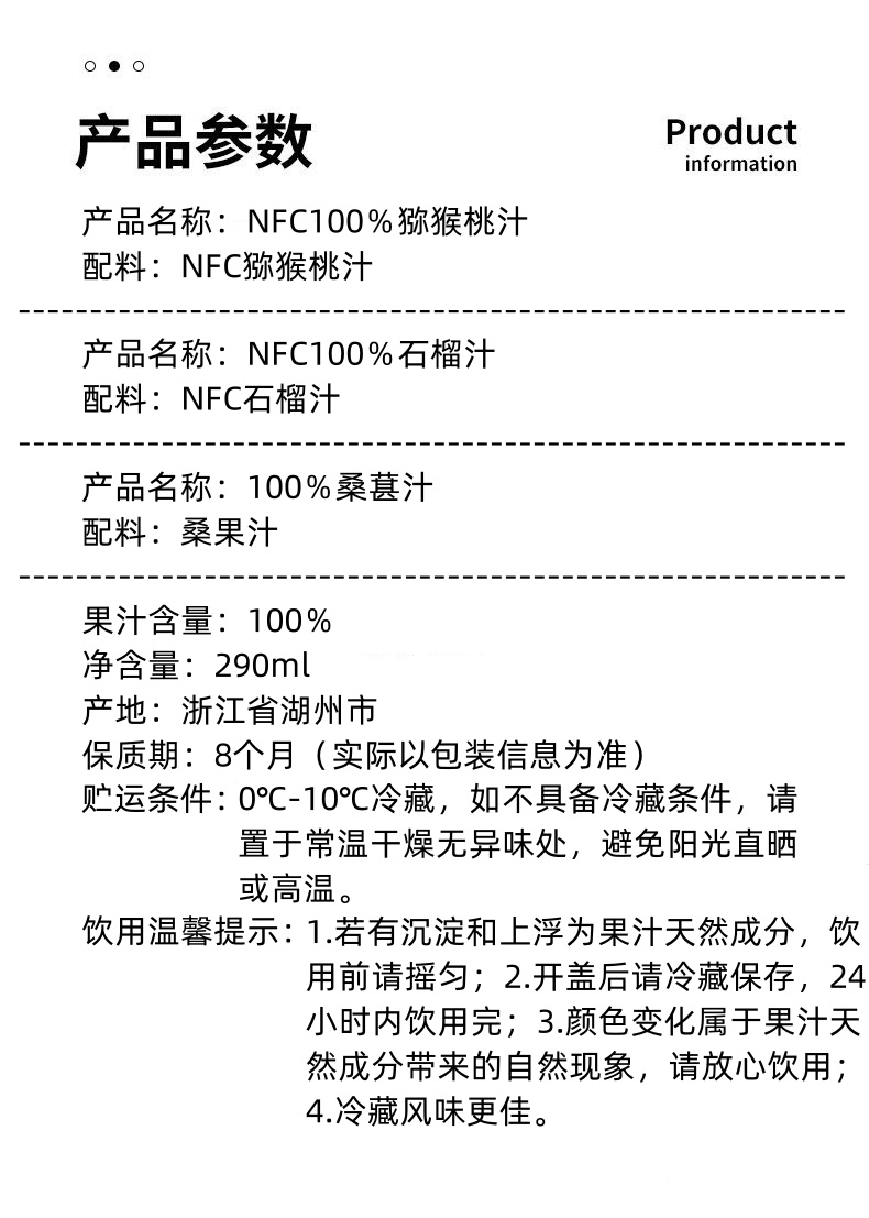 桑加1 NFC100%石榴汁丨猕猴桃汁290ml (保质期到26年3月)