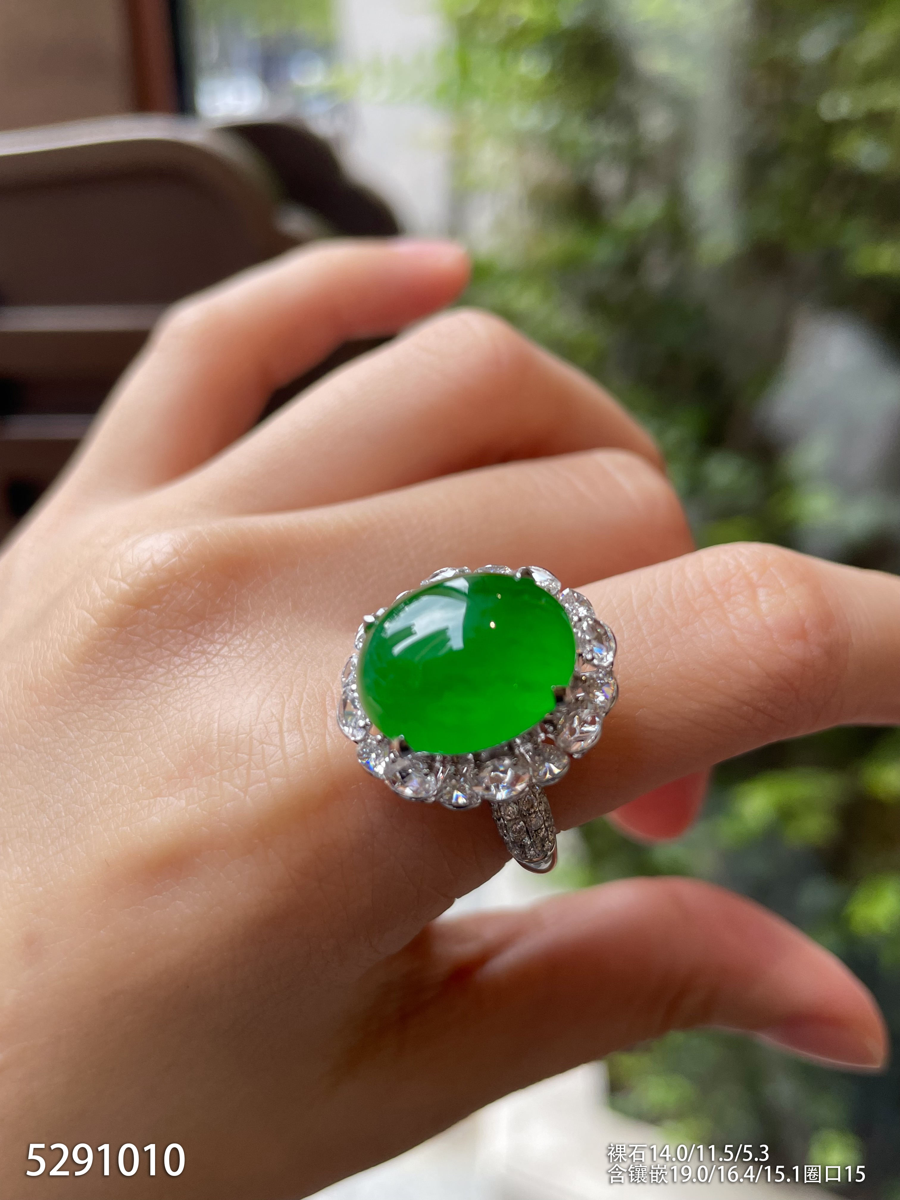 120-1232908,玻璃种木那艳绿蛋面戒指,具体价格微信咨询