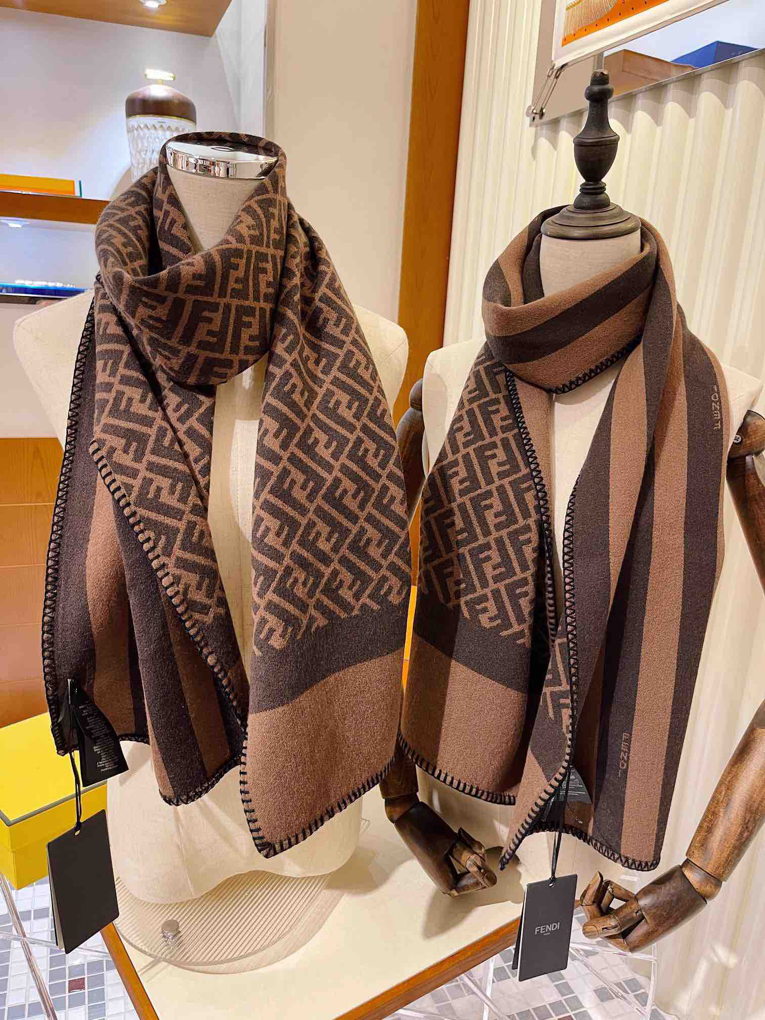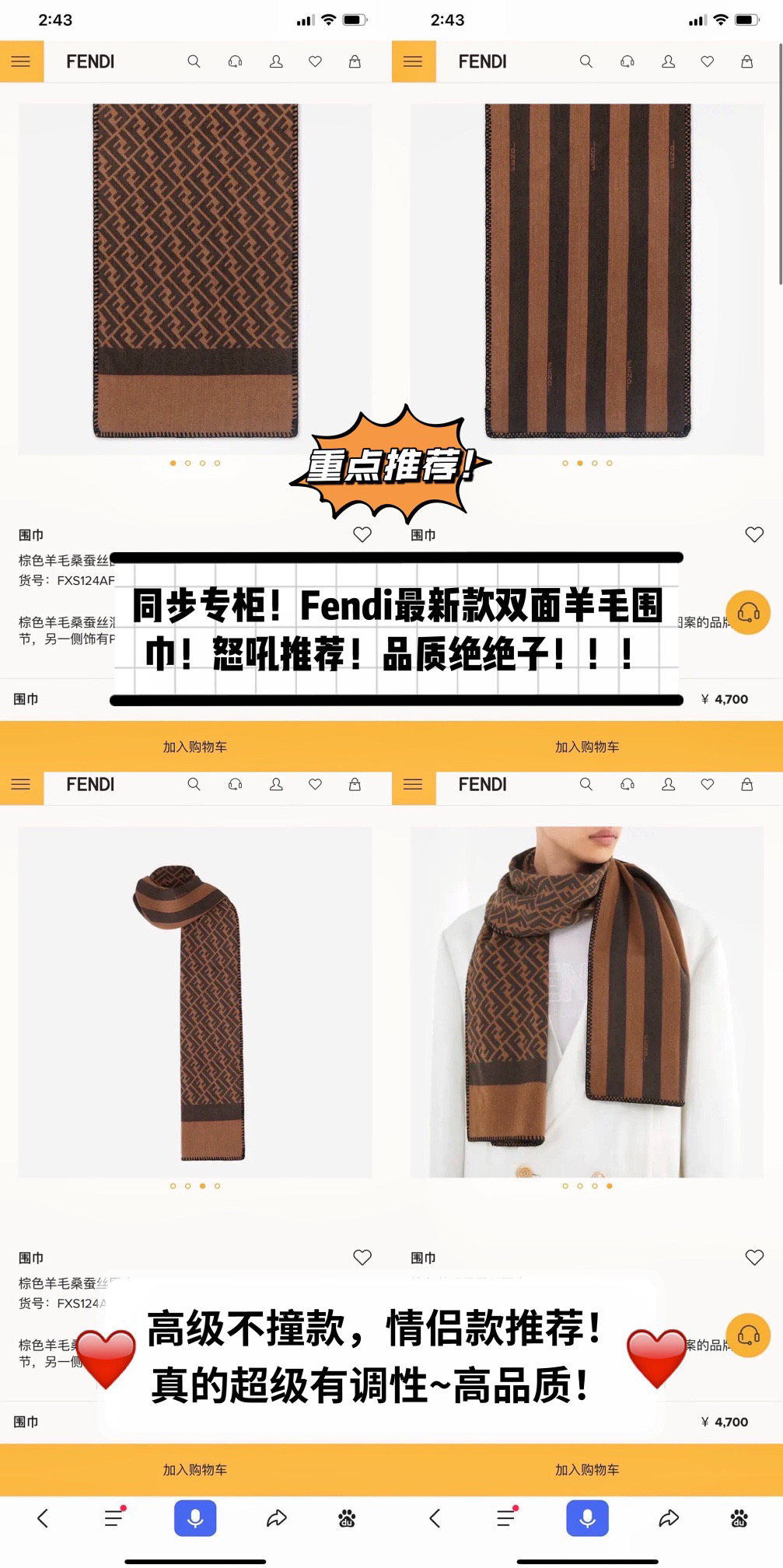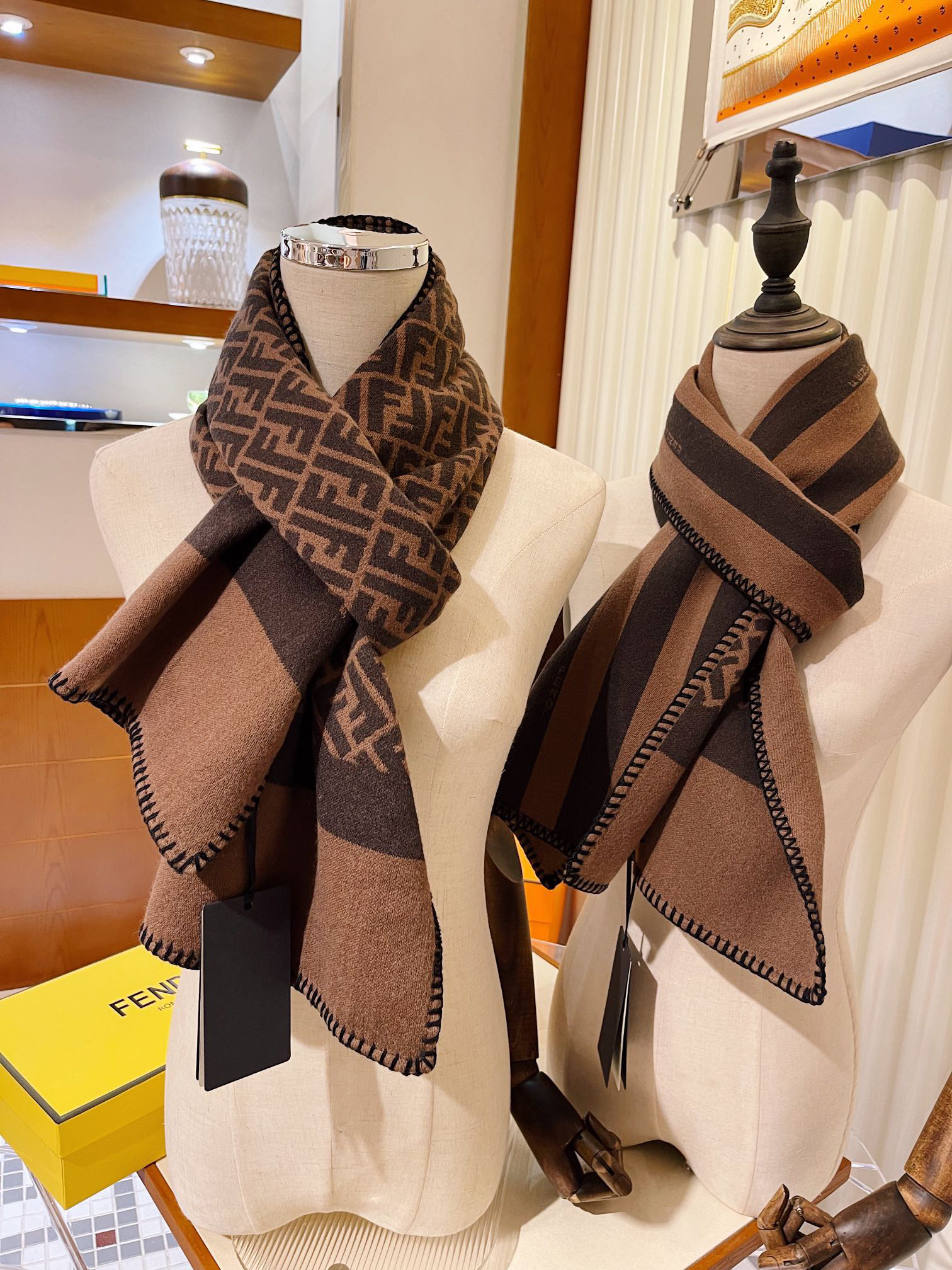 高颜值宝藏情侣款❗️气质到巅峰!!真的不多见的设计,同步专柜!上身效果真的巨好看啊,根本不用我夸它!!!大气简约,两面都可以围,拍照过程中已经多次被面料质感和条纹撞色效果迷倒。正面FF的清晰工整品质水准妥妥在线,反面小小Logo也是非常精致的点缀,有质感不张扬~!!