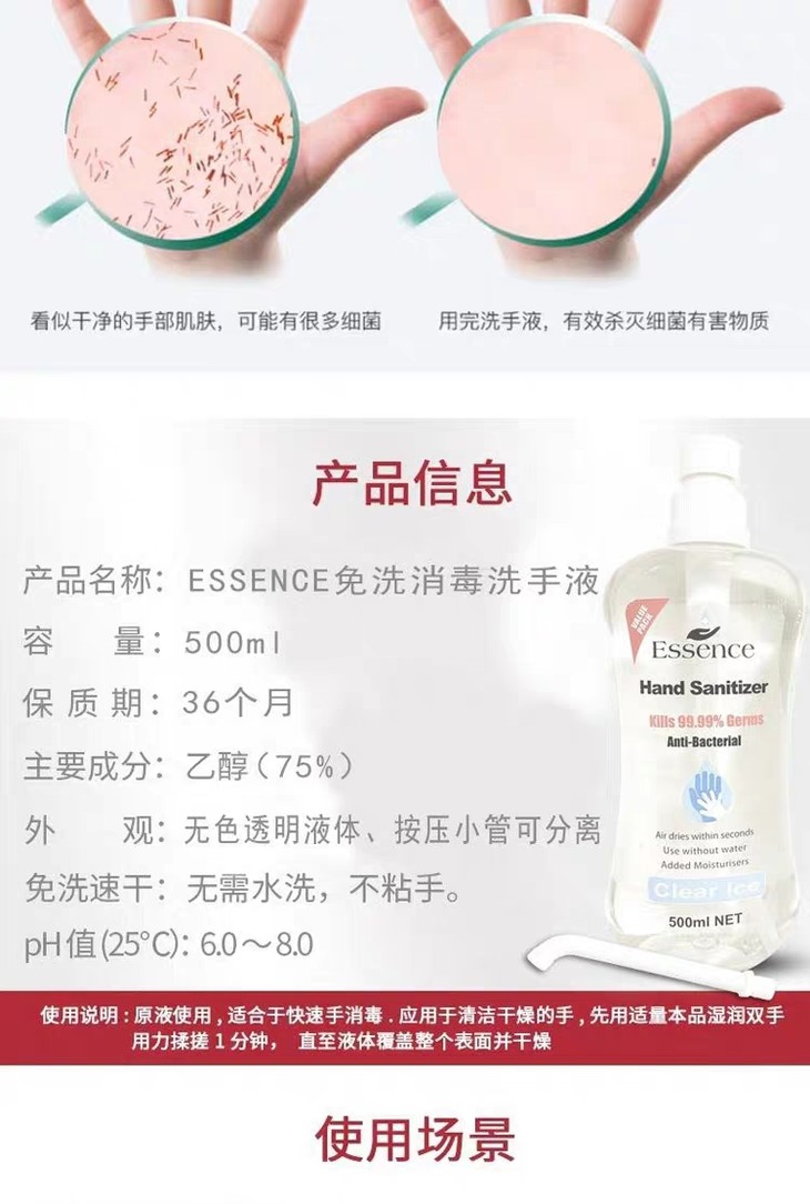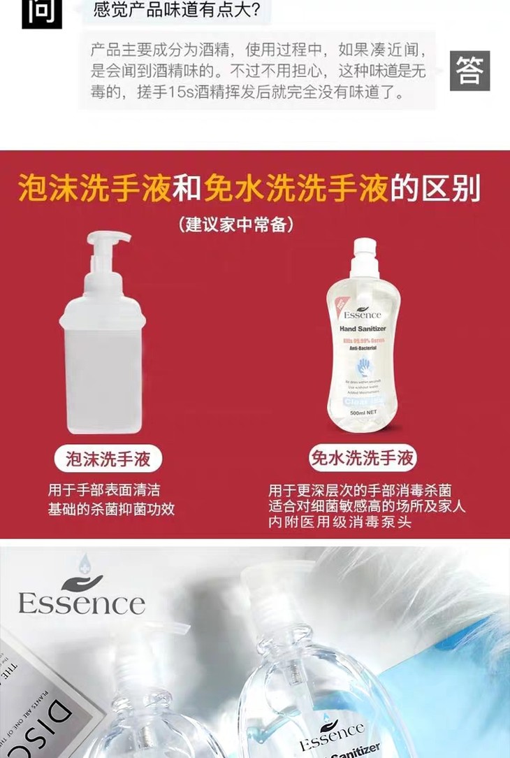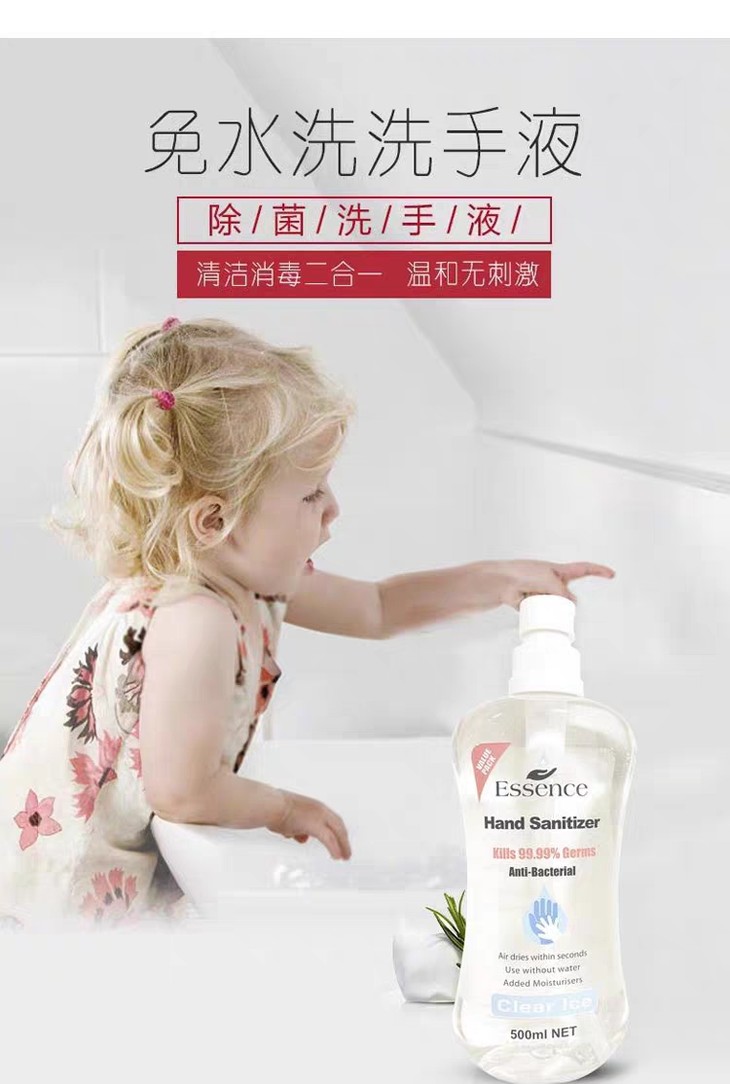 新西兰essence免洗手液消毒杀菌便携式家用儿童酒精免水洗500ml