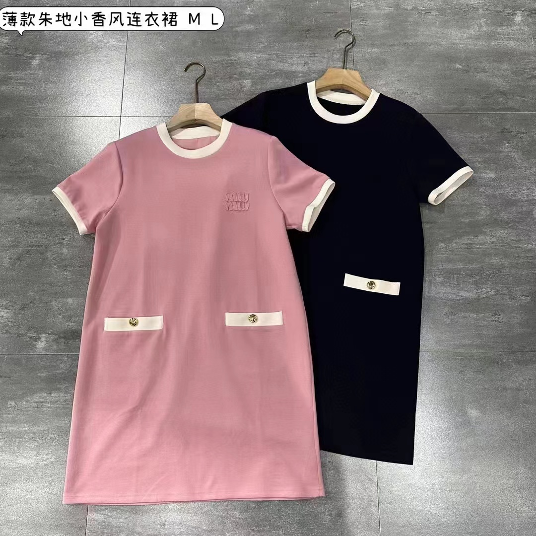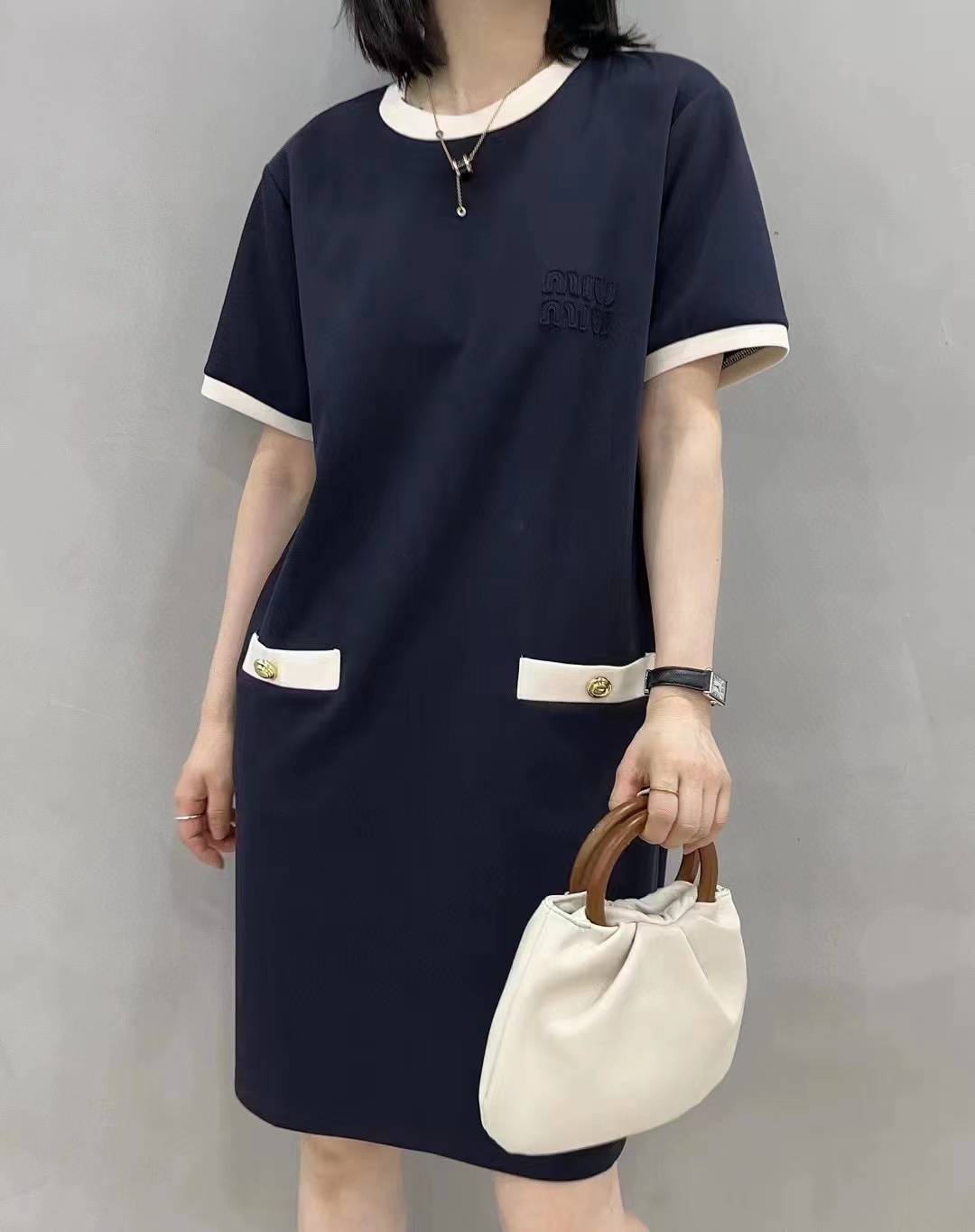 5210 # 藏蓝 M L 薄款撞色棒球领刺绣珠地棉连衣裙 宽松遮肚百搭休闲中长款
