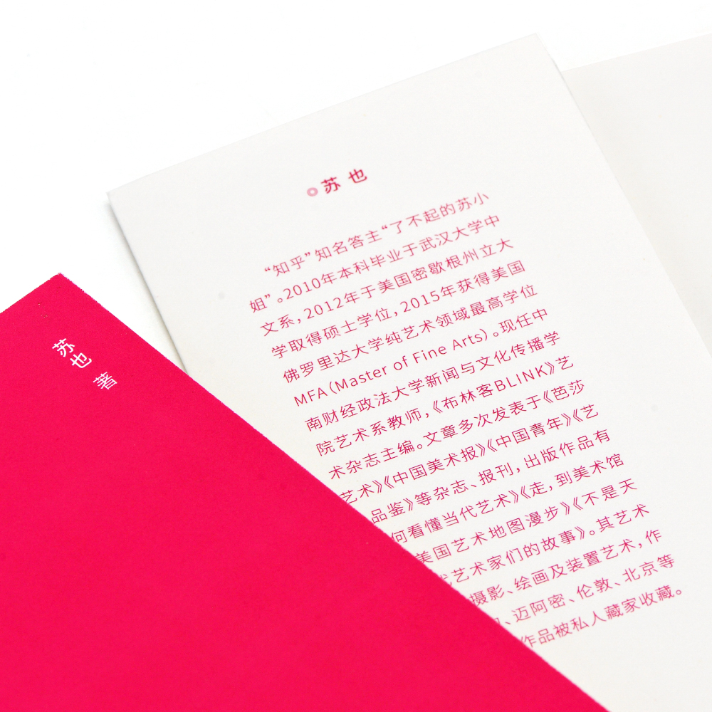 苏也, “知乎”知名答主“了不起的苏小姐”。2010年本科毕业于武汉大学中文系,2012年于美国密歇根州立大学新闻系取得硕士学位,2015年获得美国佛罗里达大学纯艺术领域最高学位MFA(Master of Fine Arts)。现任《布林客BLINK》艺术杂志主编,从事艺术普及、艺术评论工作,文章多次发表于《芭莎艺术》《中国美术报》《中国青年》《艺术品鉴》等杂志、报纸,出版作品有《如何看懂当代艺术》《走,到美术馆去!:美国艺术地图漫步》《不是天才:当代艺术家们的故事》。其艺术创作包括摄影、绘画及装置艺术,作品曾在纽约、迈阿密、伦敦、北京等地展出,部分作品被私人藏家收藏。