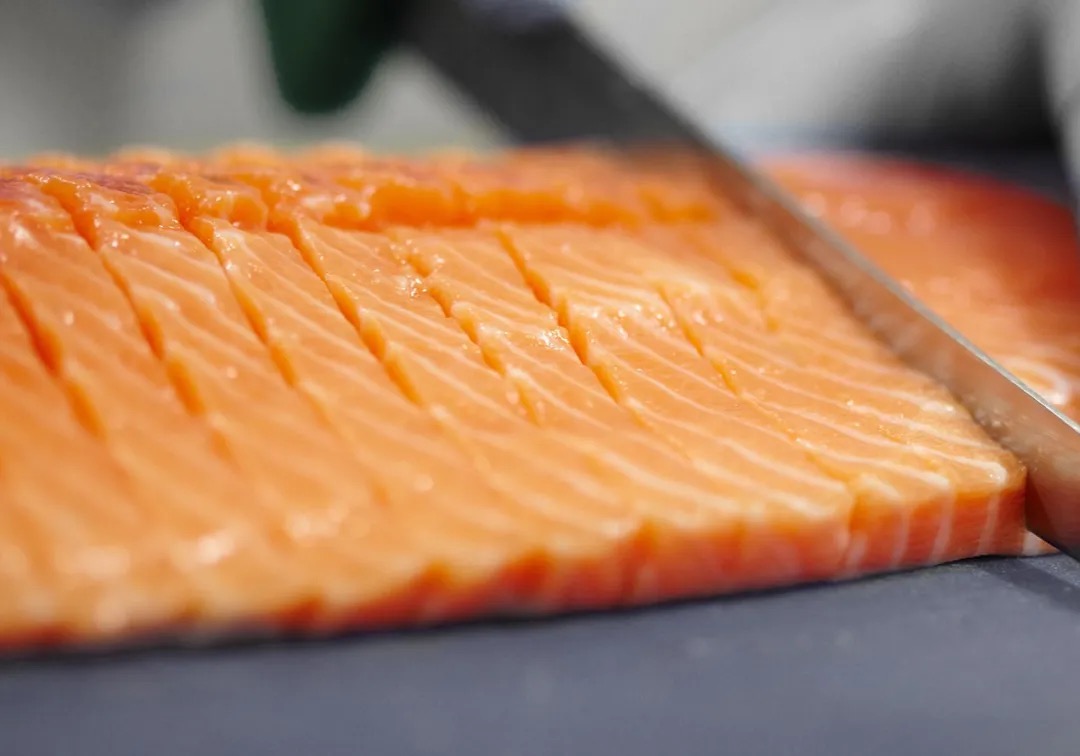 一个是适合生吃的刺身规格,选用帝王鲑中最适合切片的部位