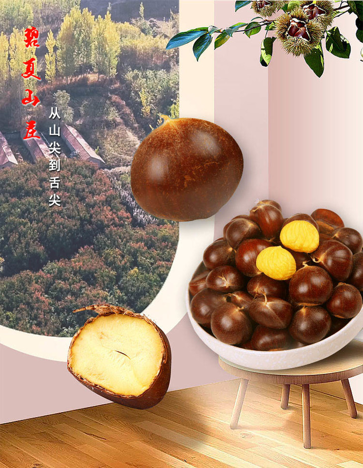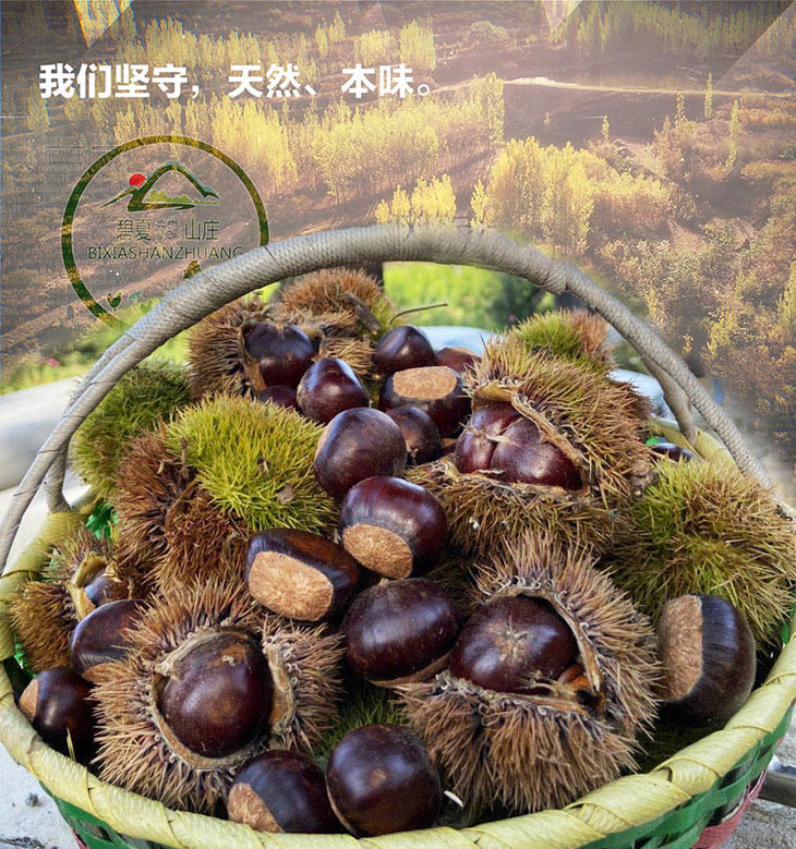 碧夏山庄板栗,栗实、个大、饱满、油足,耐贮藏,果肉多为金黄色,富糯性,甘甜味浓,外皮易剥离。 品种优良,营养丰富,香甜可口,生食、熟食皆可。一般在中秋节前后采收。用它制作的栗子去皮,同鸡肉一起烹调,做成银丝金锭般的“鸡刨栗子”,则是别具风味的佳肴。因为栗子和“立子”、“利子”谐音,当地农家常常在结婚喜庆之日,把成串的大枣和栗子,挂在门楼旁、洞房里、床头上,表示早得子、早得利和吉祥如意