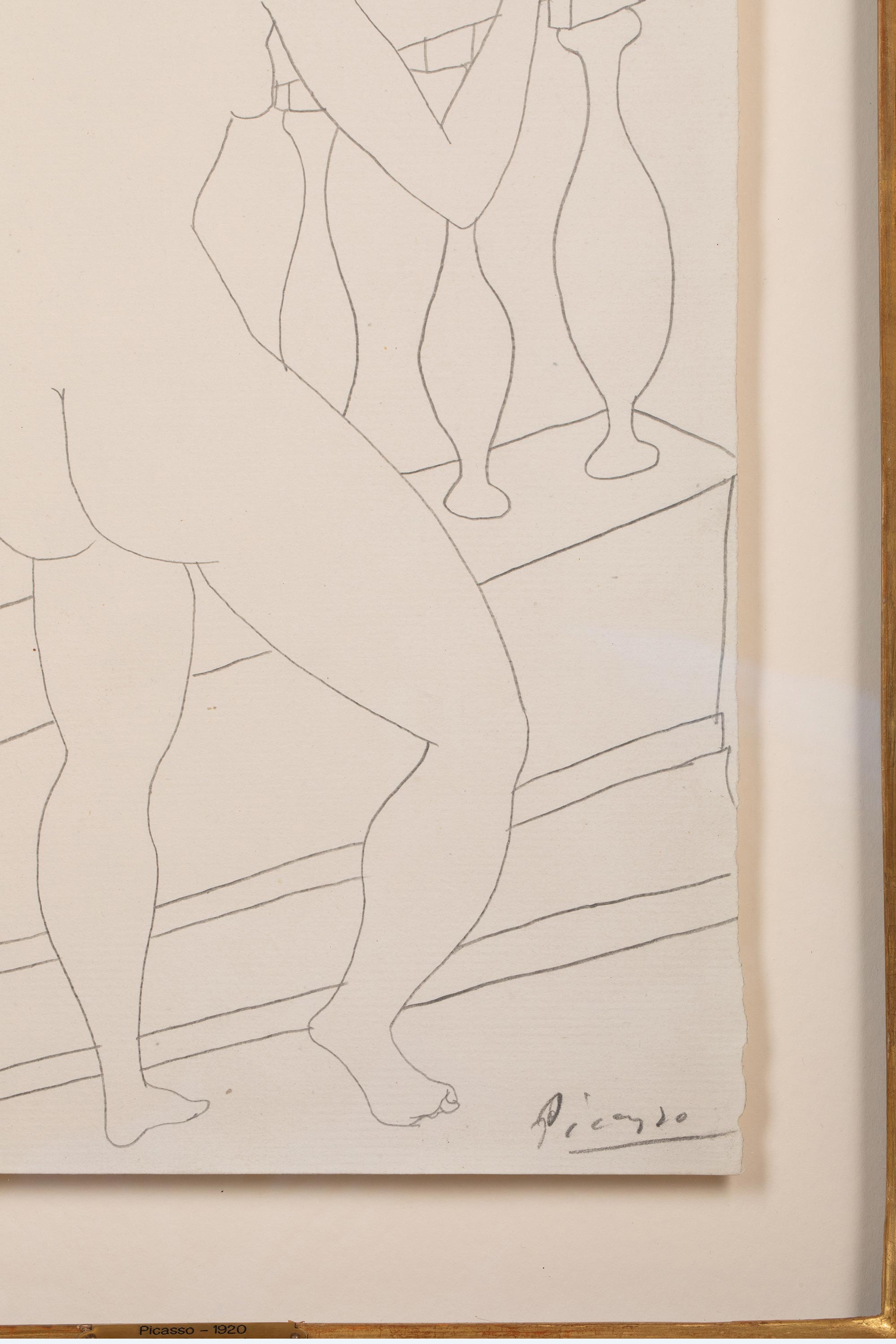 1920年代西班牙艺术巨匠毕加索签名创作出品纸本铅笔作品《倚靠栏杆的裸女》