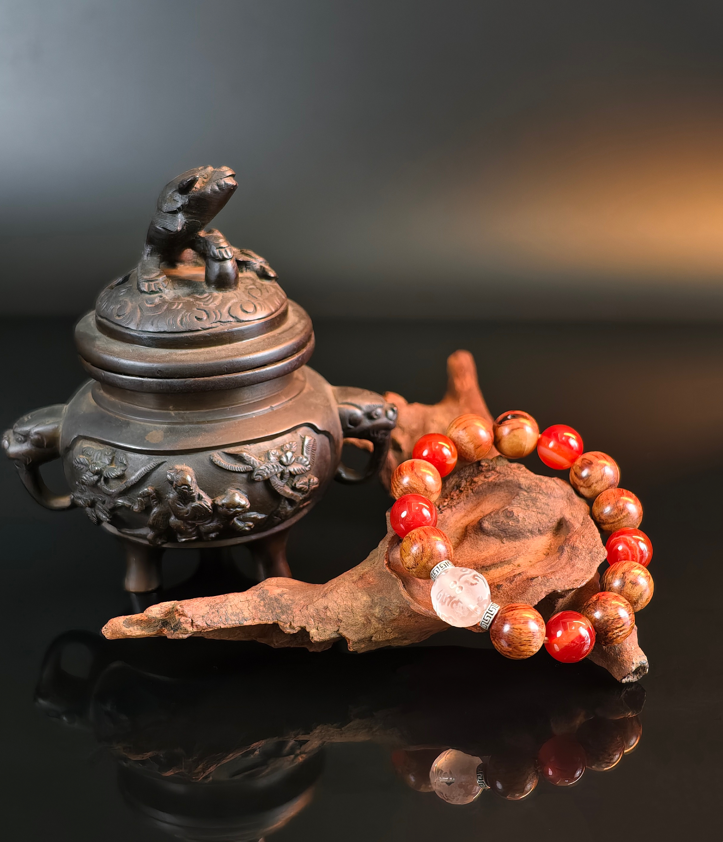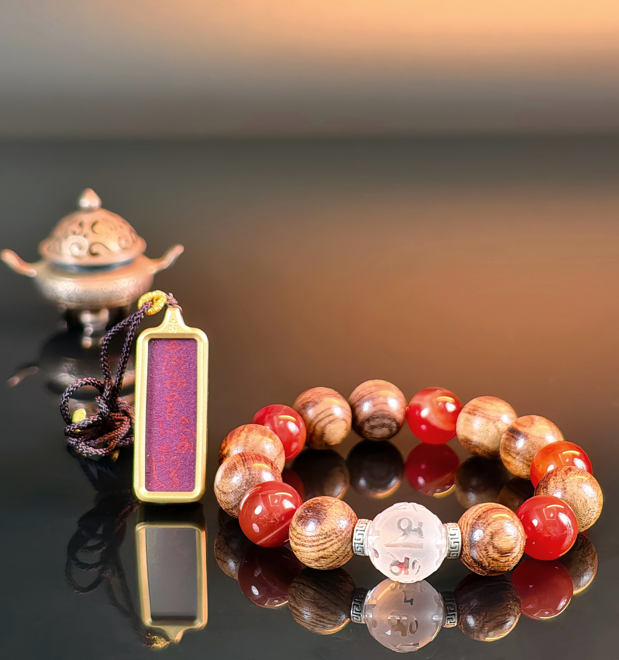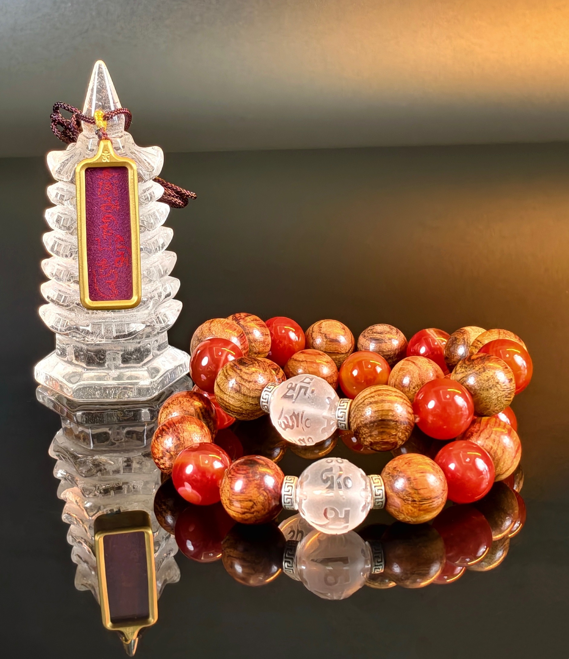 9颗降真珠配5颗战国红缠丝玛瑙+一颗白水晶主珠
