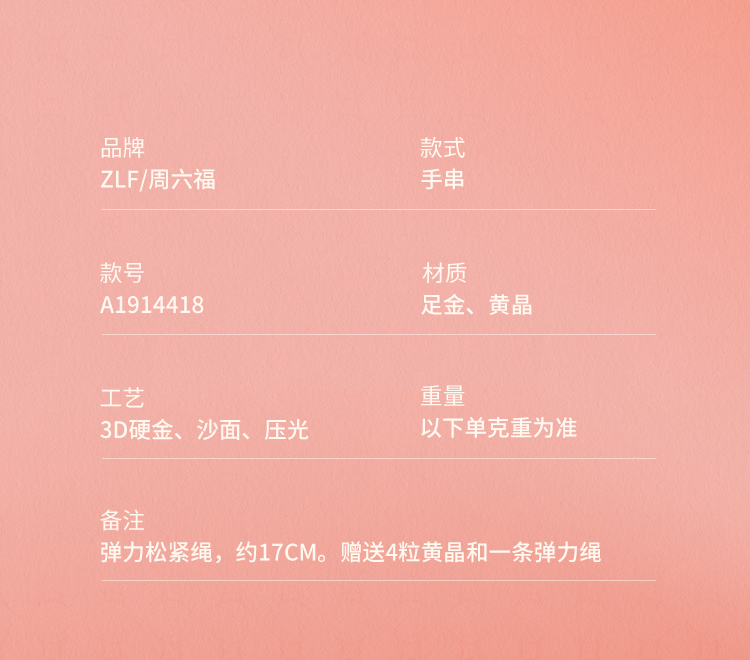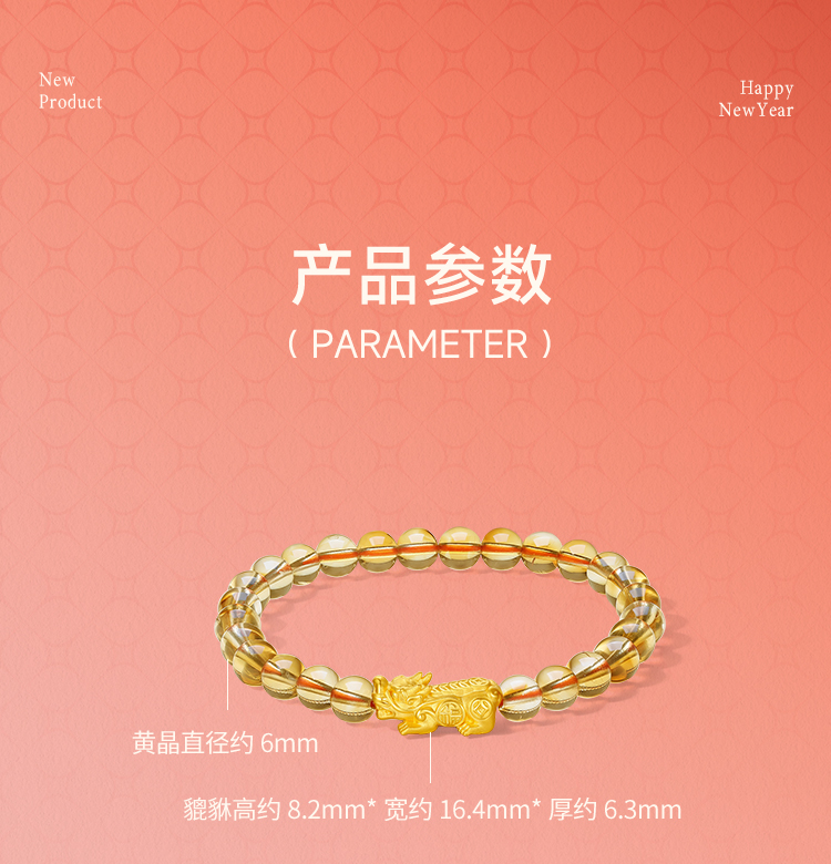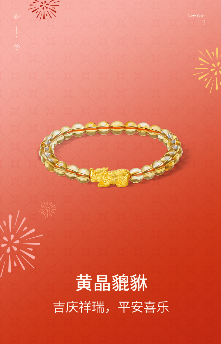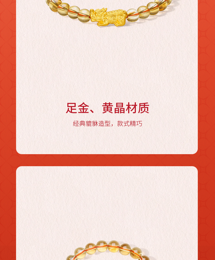 周六福黄金手串女款3d硬金黄晶貔貅情侣弹力绳手串定价新春礼物