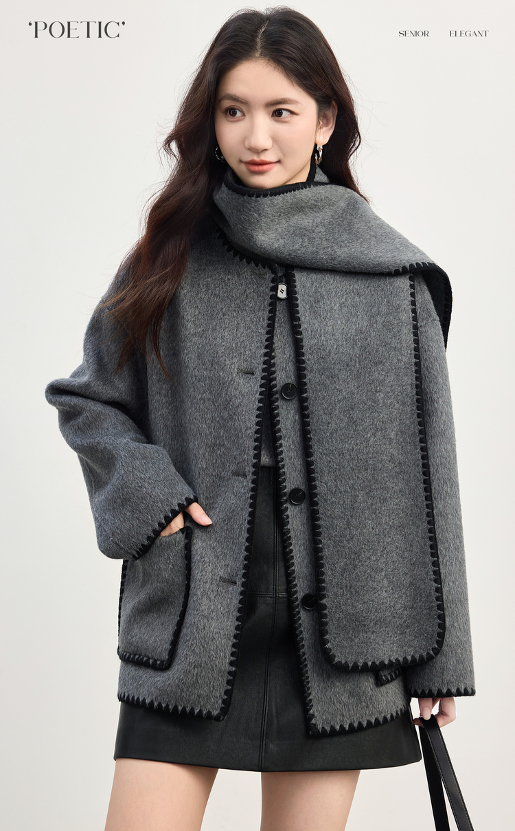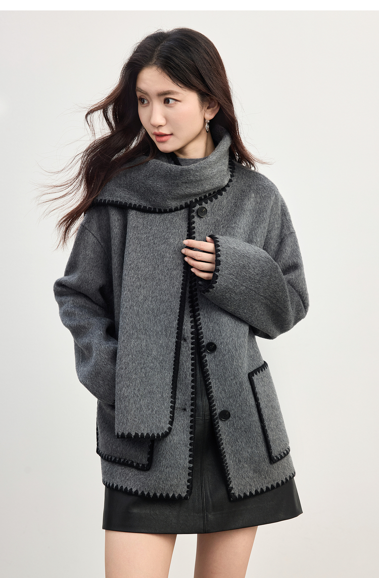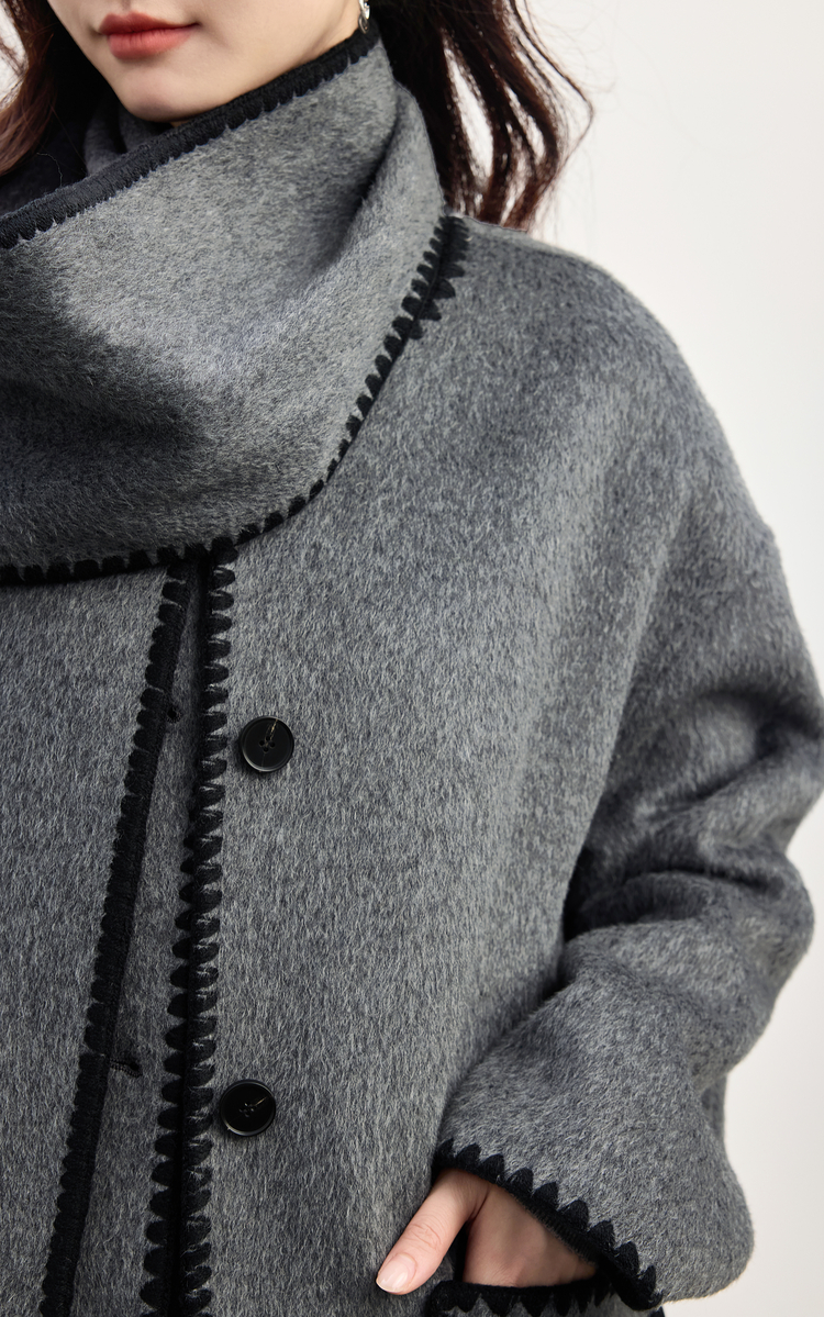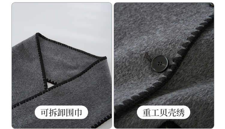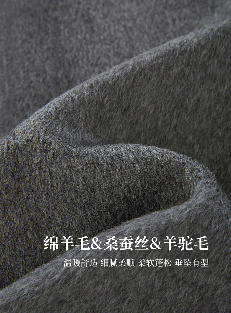 【年终特卖】熙世界静奢羊驼毛/桑蚕丝/绵羊毛大衣女双面呢可脱卸围巾毛呢外套